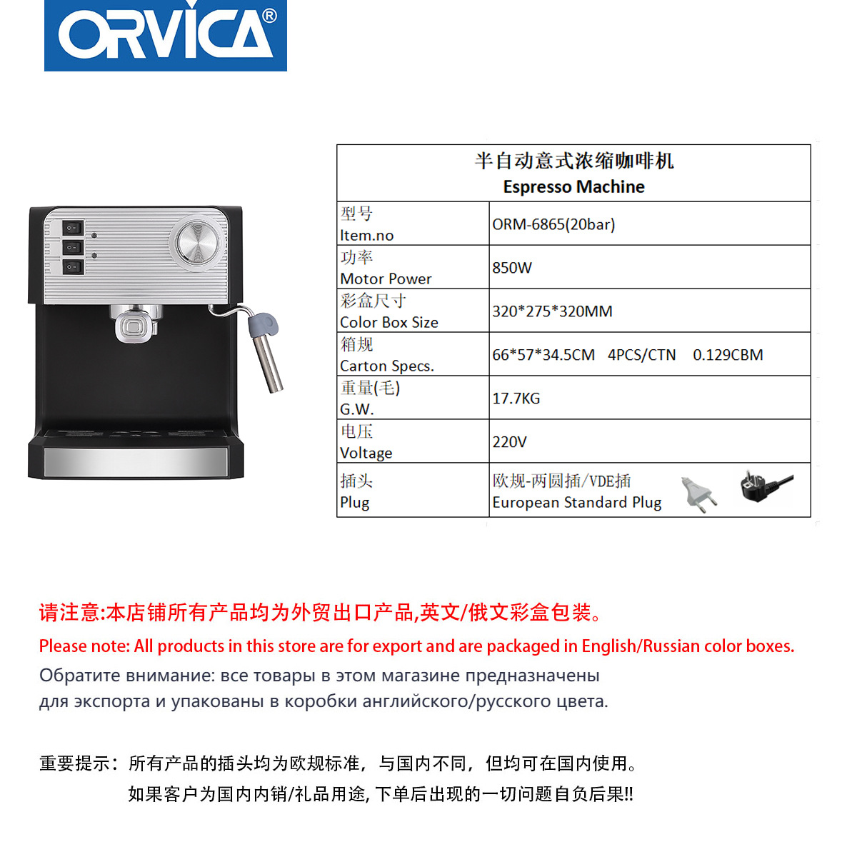 品牌: ORVICA 咖啡机原理: 泵压式 容量: 3杯以下 款式: 一体 额定电压: 111V~240V(含) 机身材质: 不锈钢+塑料 咖啡壶分类: 蒸汽式 操作方式: 手动 咖啡机类型: 意式半自动 3C证书编号: 2022010717509553 重量: 10.0 kg/台