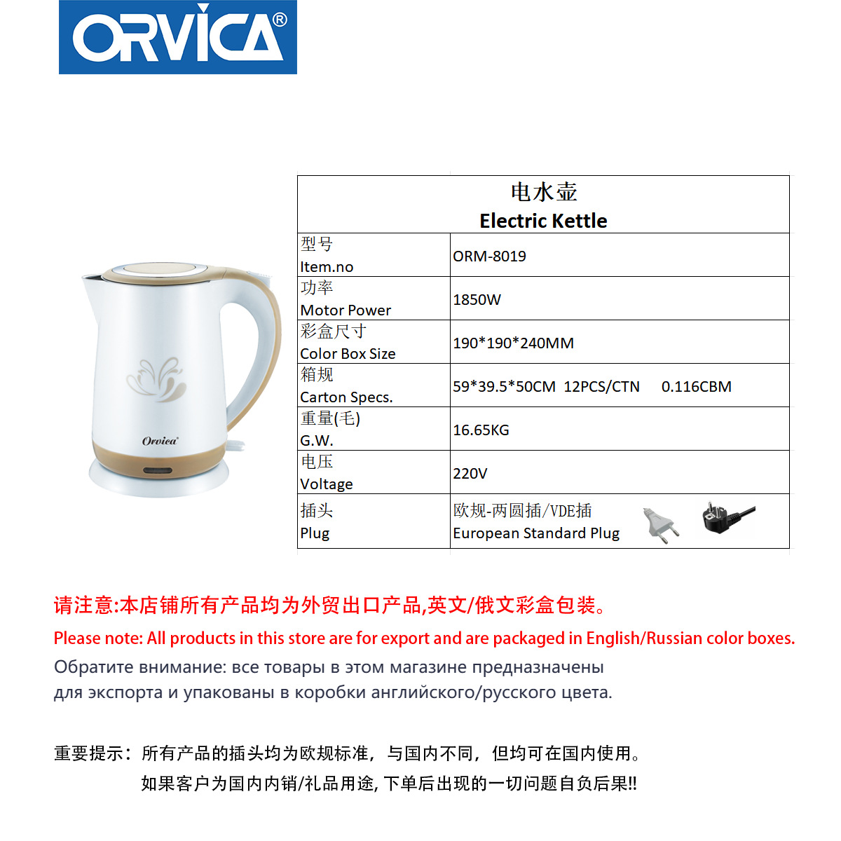 品牌: ORVICA 上市时间: 2022 产地: 浙江 货源类别: 现货 产品类别: 电热水壶 操作方式: 按键式 加热方式: 底盘加热 电热水壶容积: 1L(含)-2L(含) 壶体层数: 双层 电磁炉炉头: 1个 重量: 10.0 kg/个