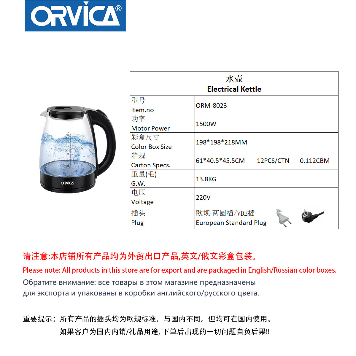 ORVICA跨境电热水壶大容量煮茶壶多功能家用烧水壶欧规热水壶