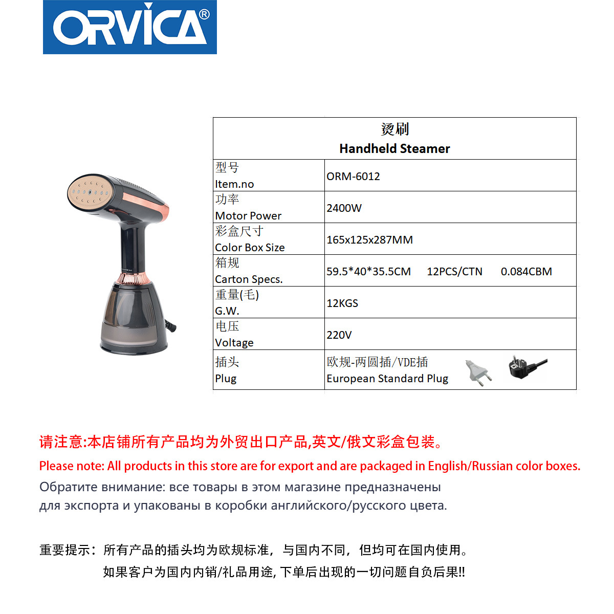 ORVICA跨境新款手持挂烫机家用金色手持蒸汽熨斗刷烫衣机欧规220V 投诉