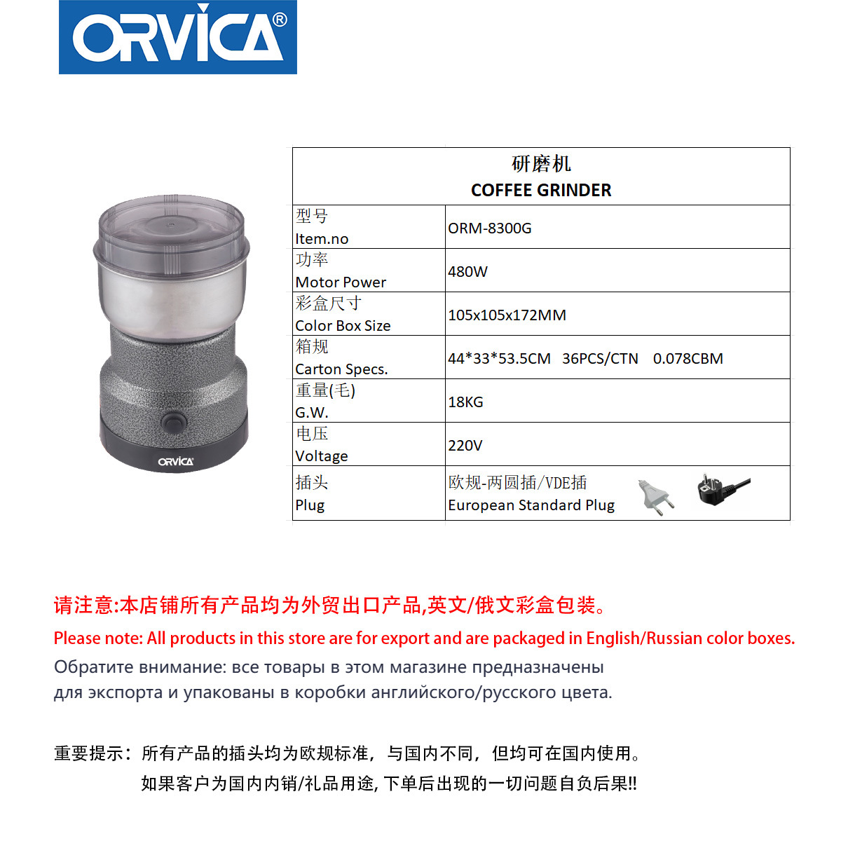 ORVICA跨境欧规爆款电动调料磨豆机便携咖啡豆打粉机器 投诉