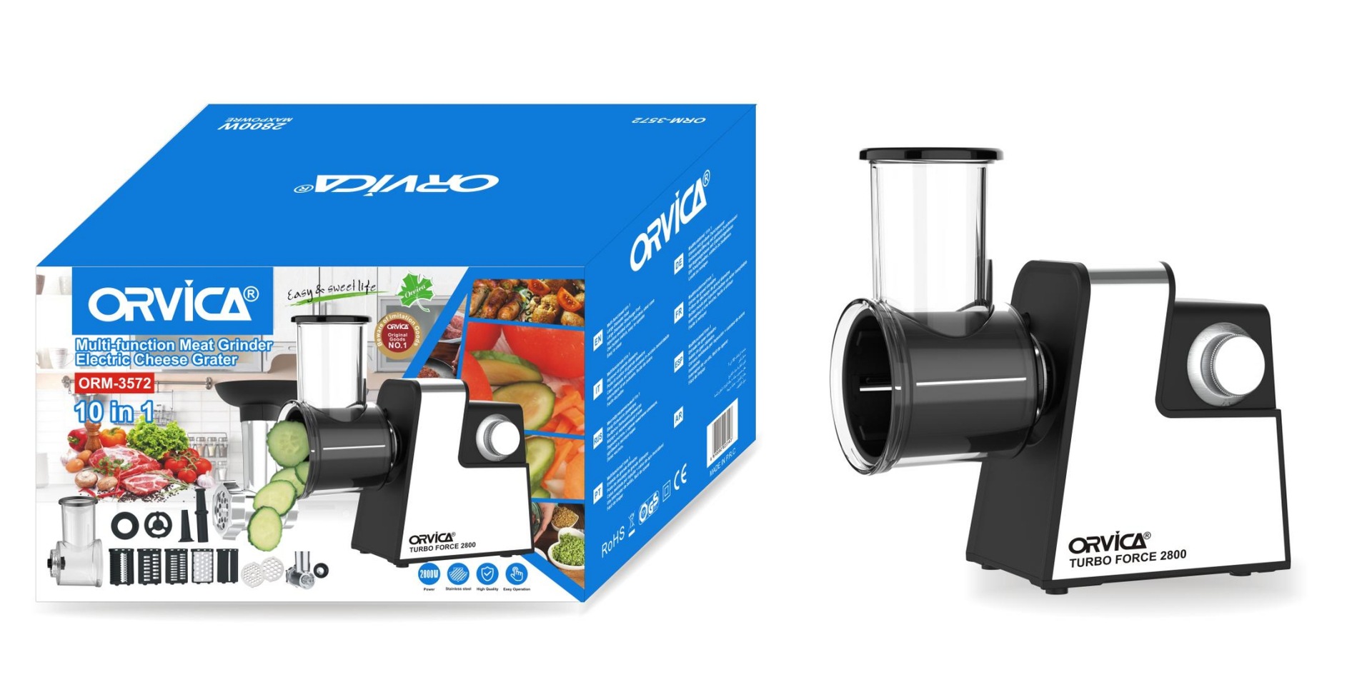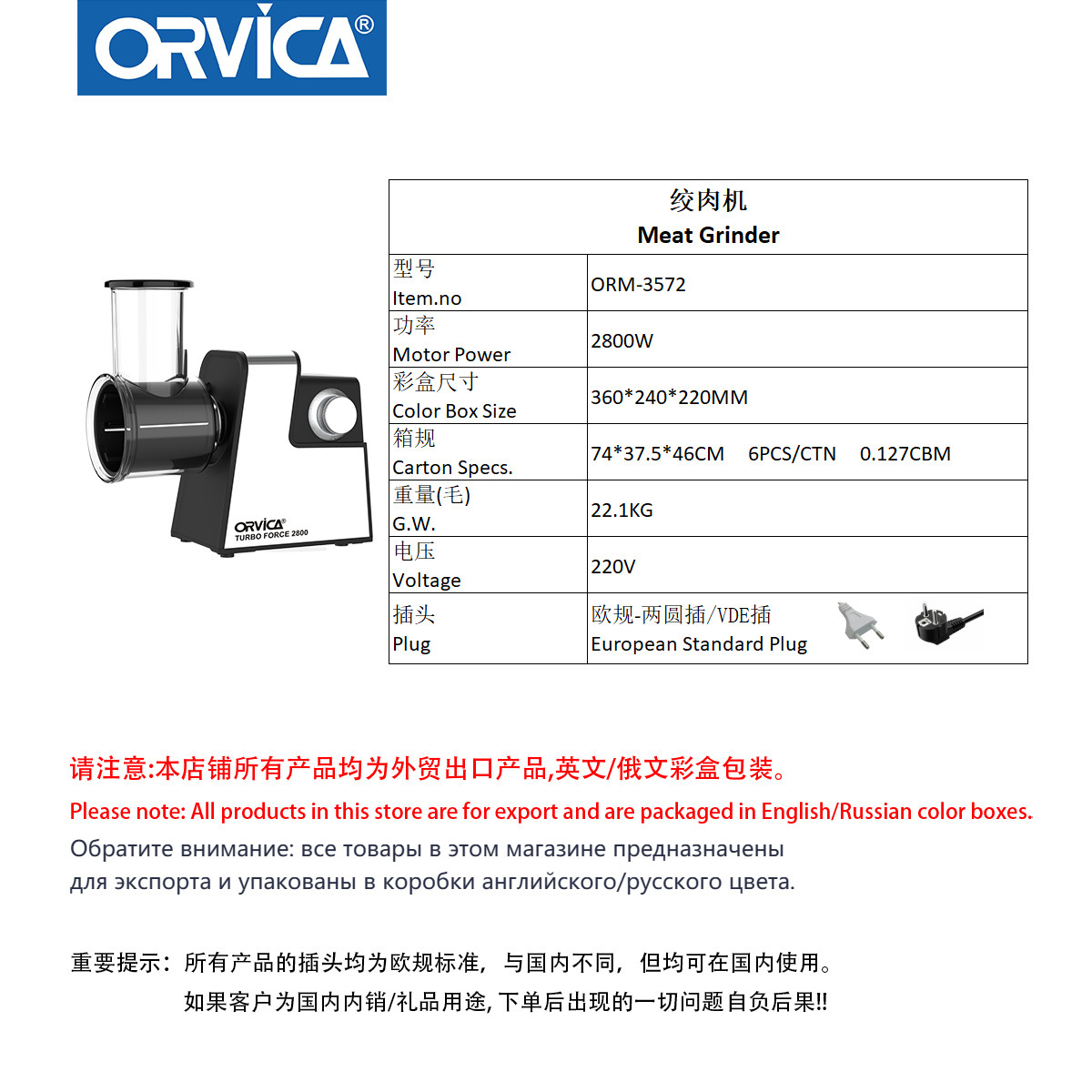 产品类别: 绞肉机 品牌: ORVICA 型号: ORM-3572 货号: ORM-3572 额定电压: 110-240V 额定功率: 2800W 额定频率: 50/60Hz 颜色: ORM-3572 产品规格: 欧规彩盒包装 主要下游平台: ebay,亚马逊,wish,速卖通,独立 重量: 10.0 kg/台