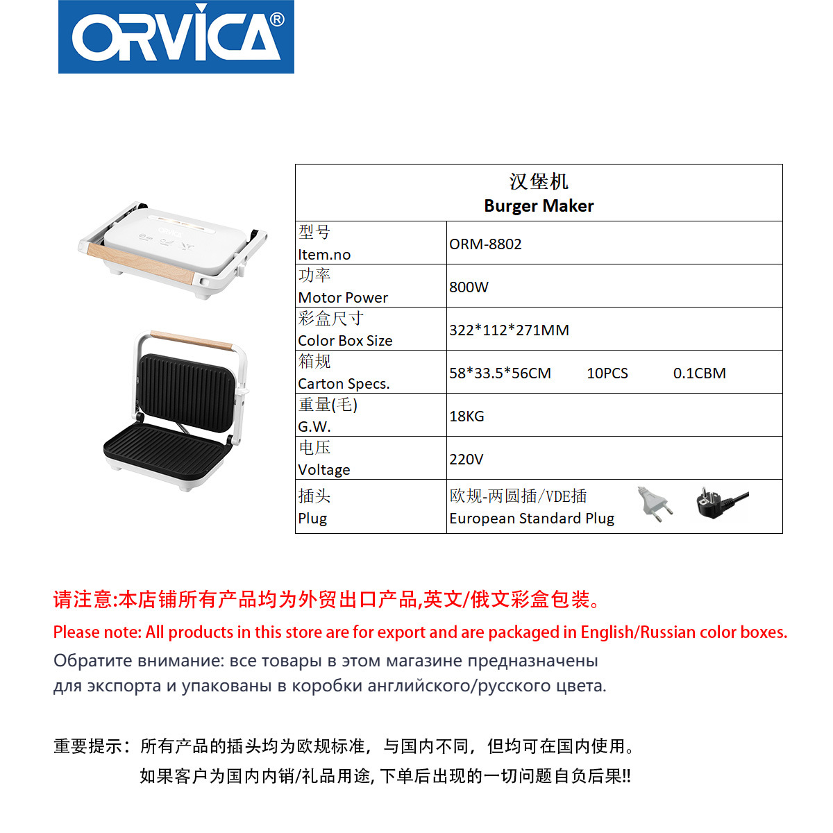 品牌: ORVICA 型号: ORM-8802 货号: ORM-8802 饼铛类型: 电饼铛 功能: 其他 电饼铛加热: 双面加热 饼铛口径: 25cm及以下 烙盘设计: 非悬浮式 控制方式: 机械式 额定电压: 220V 重量: 10.0 kg/台
