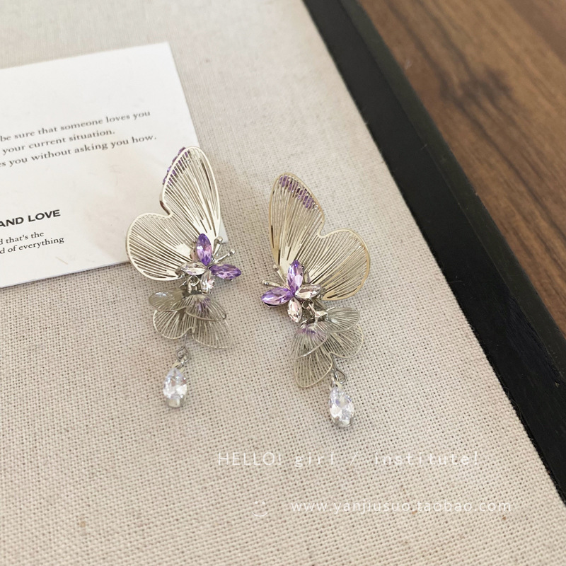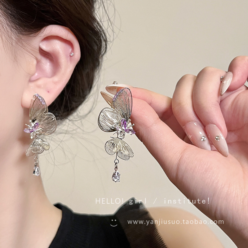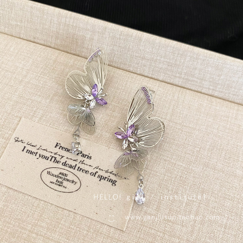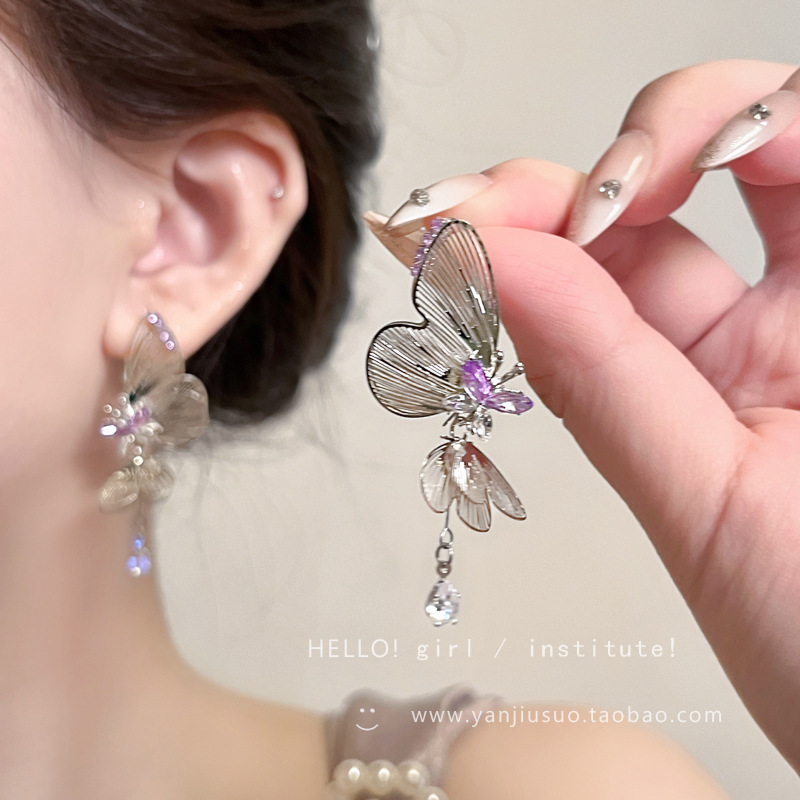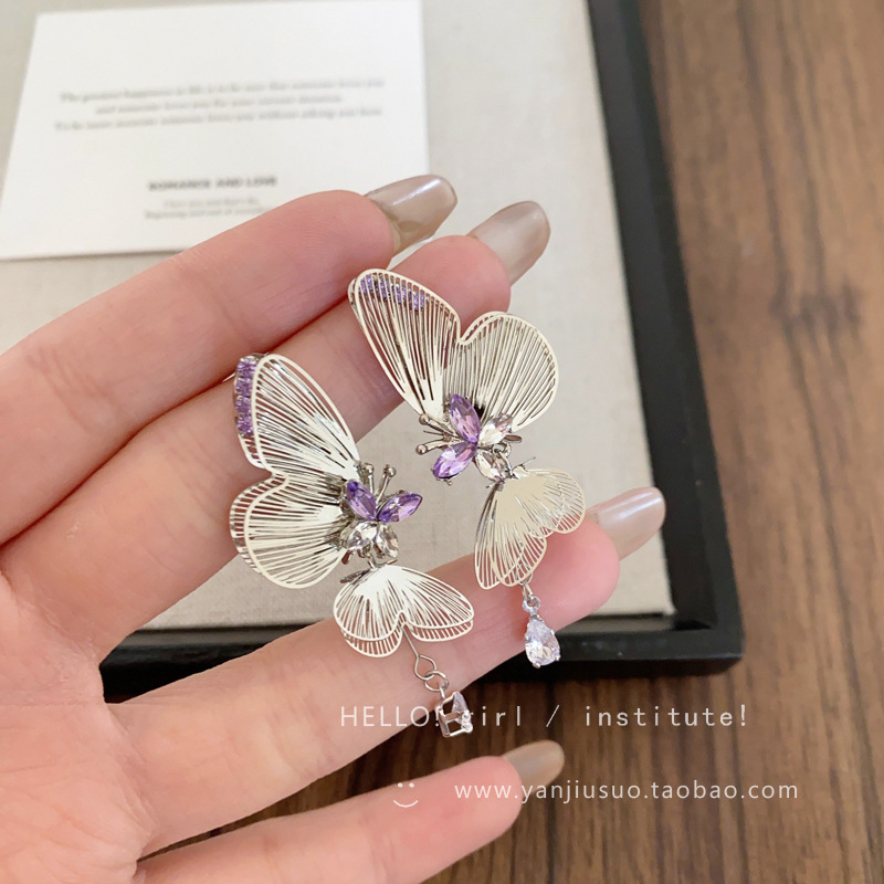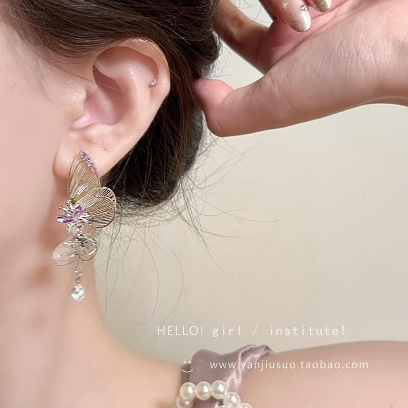 超仙清冷感紫色镂空线条双层灵动蝴蝶耳环女轻奢小众流苏耳钉耳饰