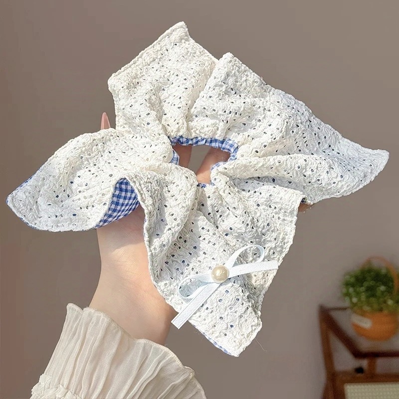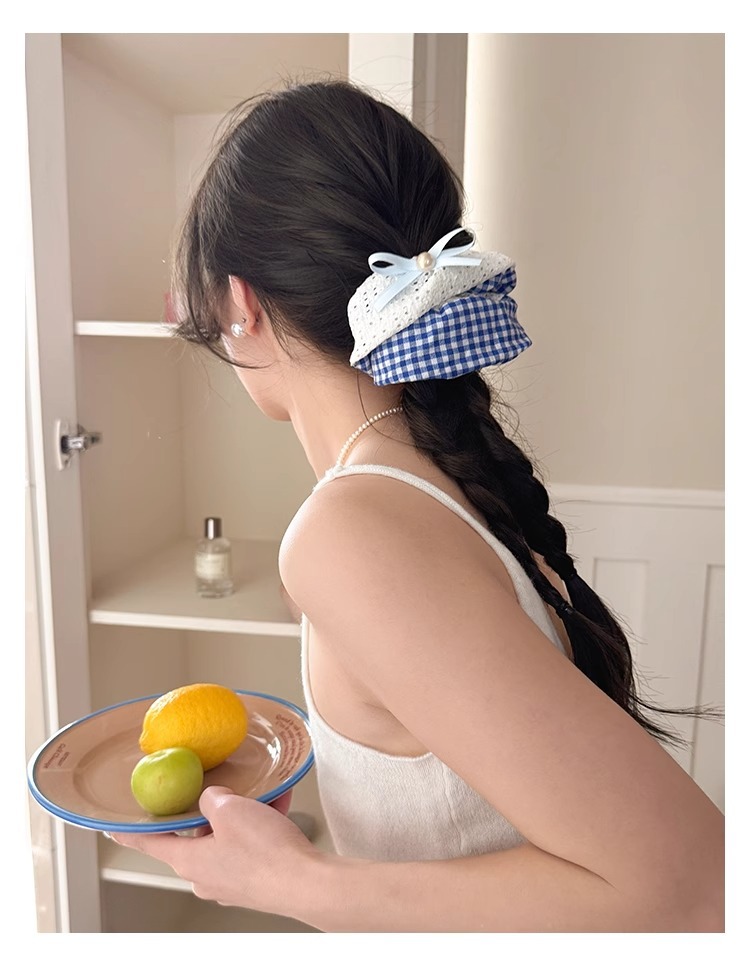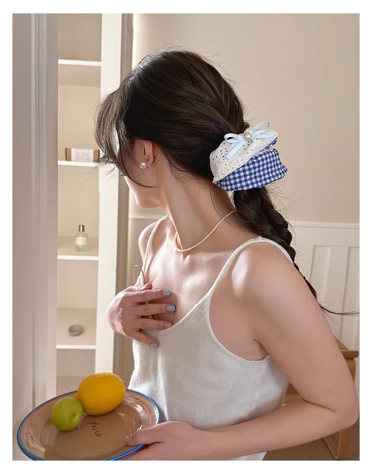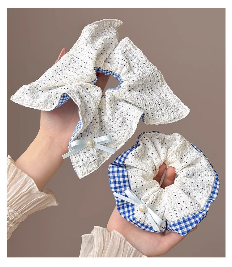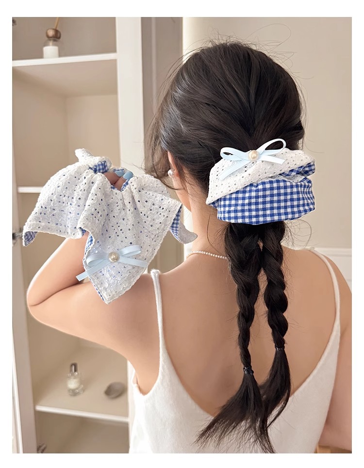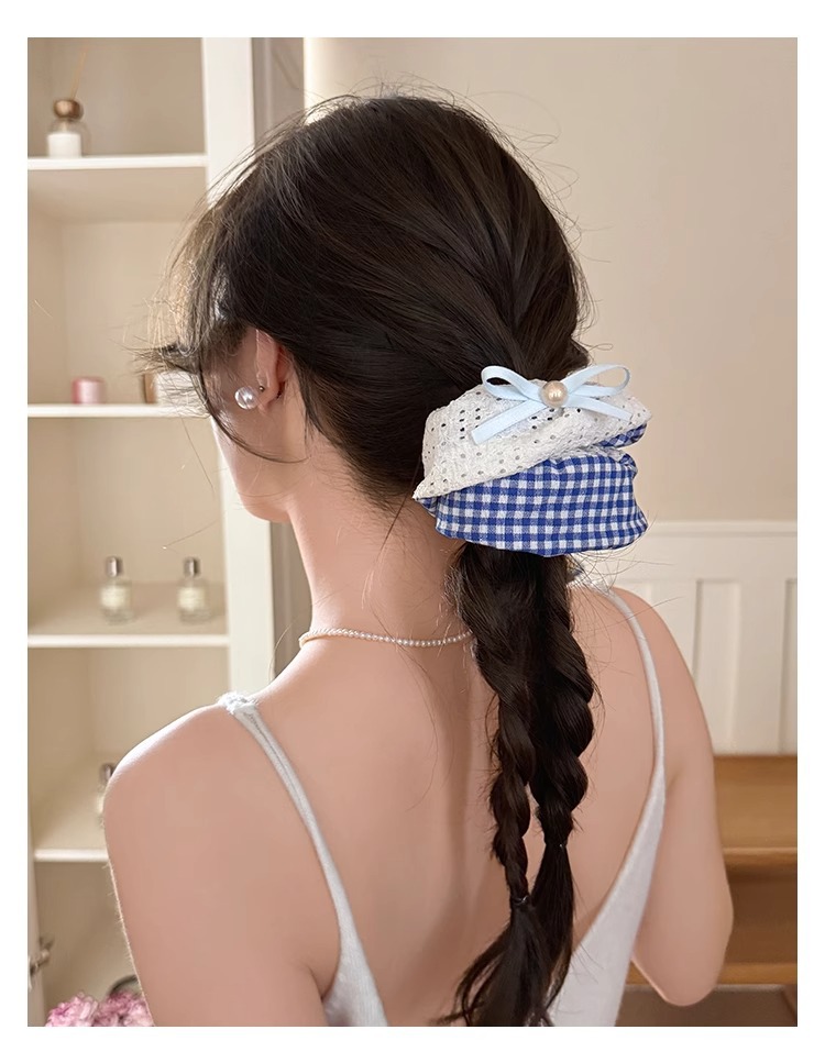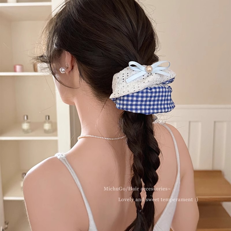 韩系蓝色格子方巾大肠发圈女高级感扎头发绳丸子头低马尾头绳发饰