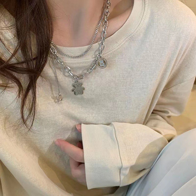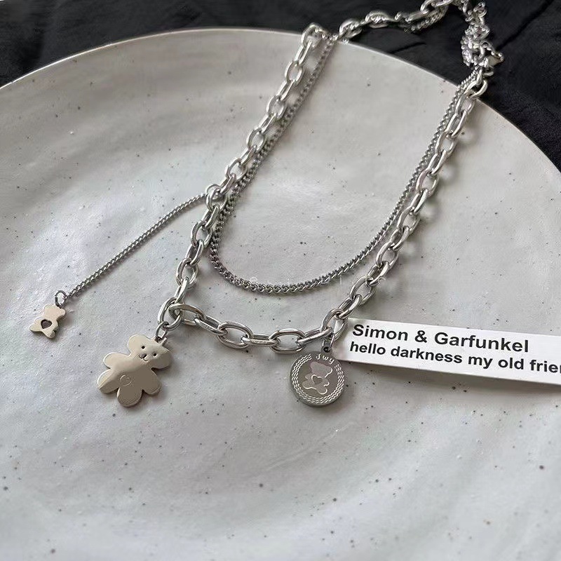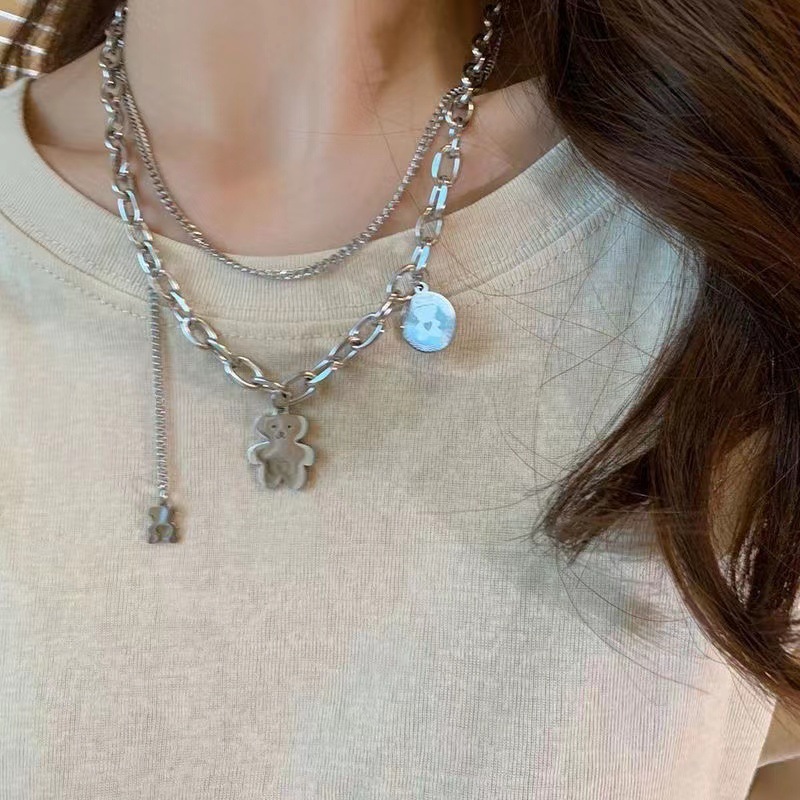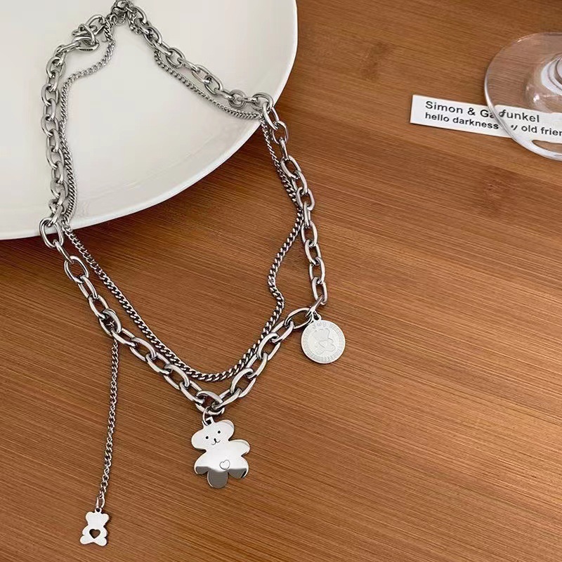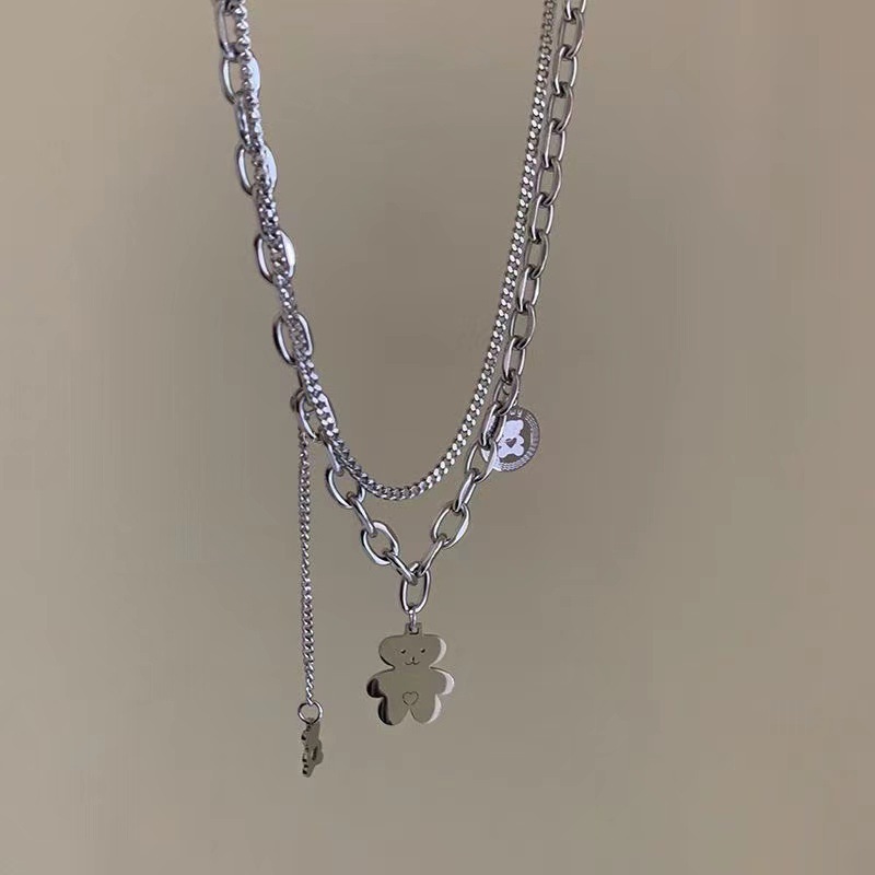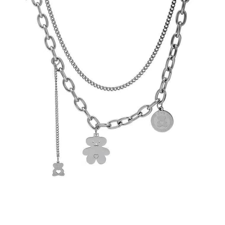 银色双层小熊吊坠钛钢项链女嘻哈辣妹潮牌锁骨链冷淡风叠戴卫衣链