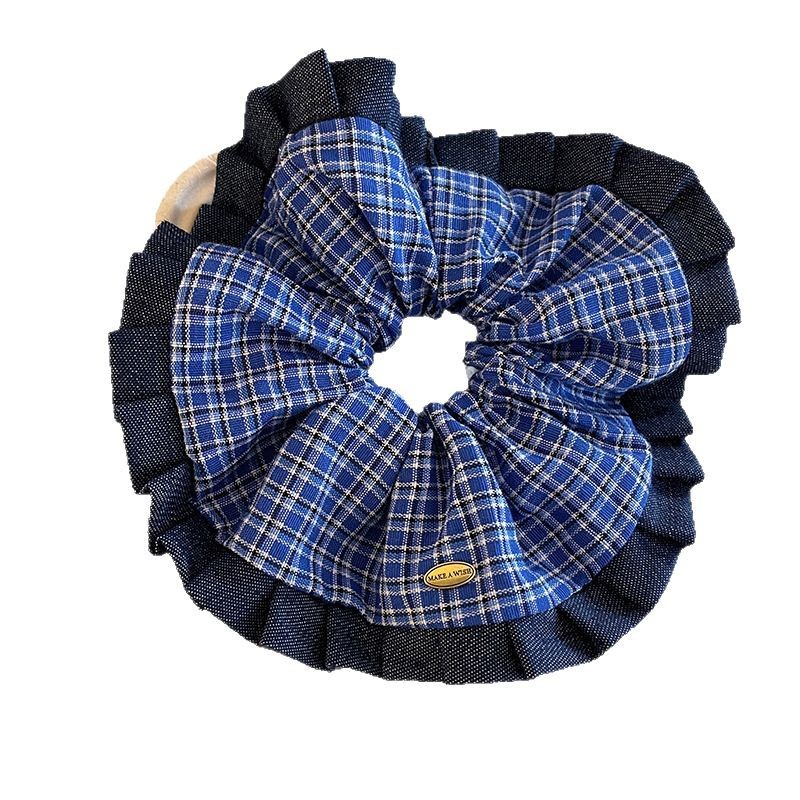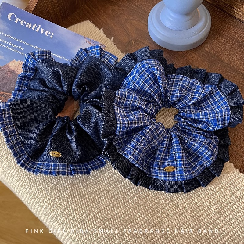 学院风牛仔蓝格子大肠发圈女2025新款气质扎低马尾发绳慵懒风头饰
