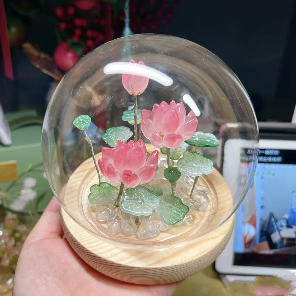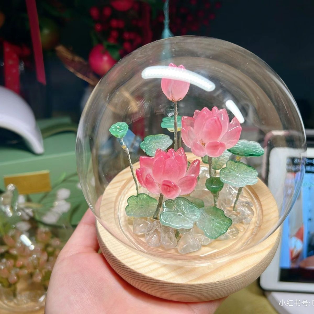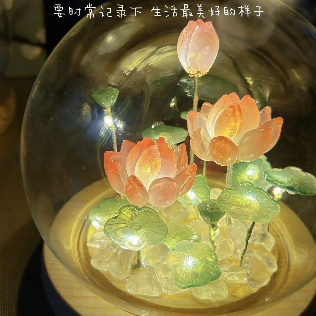 材质(玻璃灯罩+原木底座+琉璃花瓣荷叶