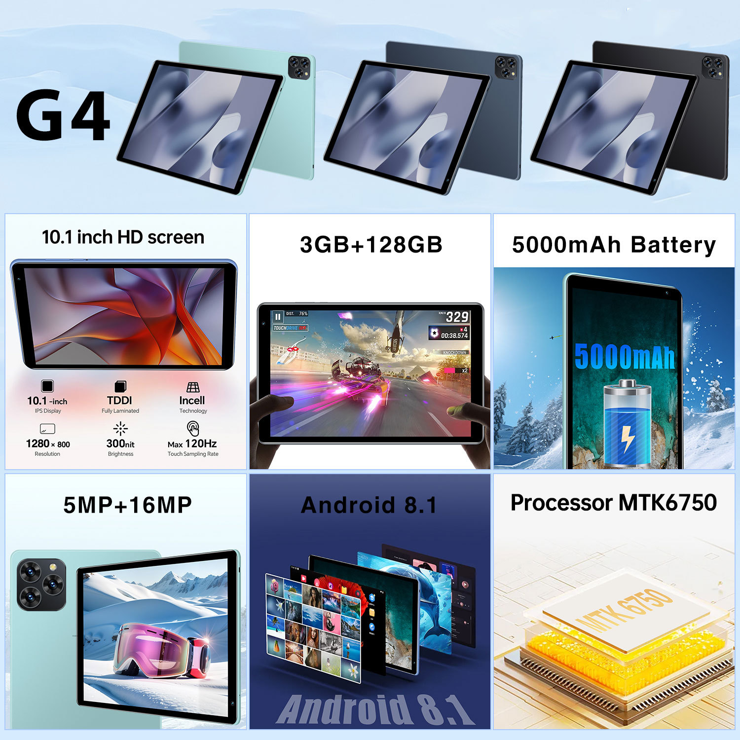 型号: G4 货号: G4 上市时间: 2024年 货源类别: 现货 操作系统: ANDROID 处理器: MTK 存储类型: 其他存储类型 硬盘容量: 128GB 屏幕尺寸: 10.1英寸 摄像头: 1600 重量: 0.5 kg/件