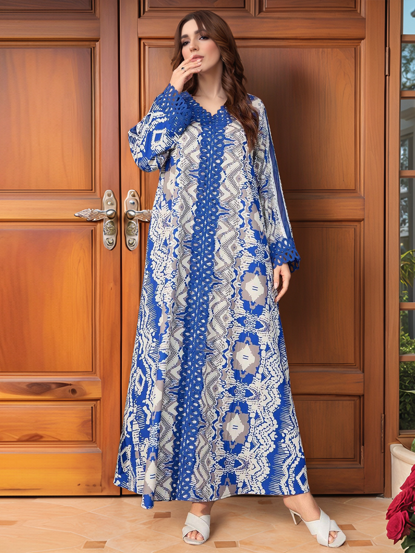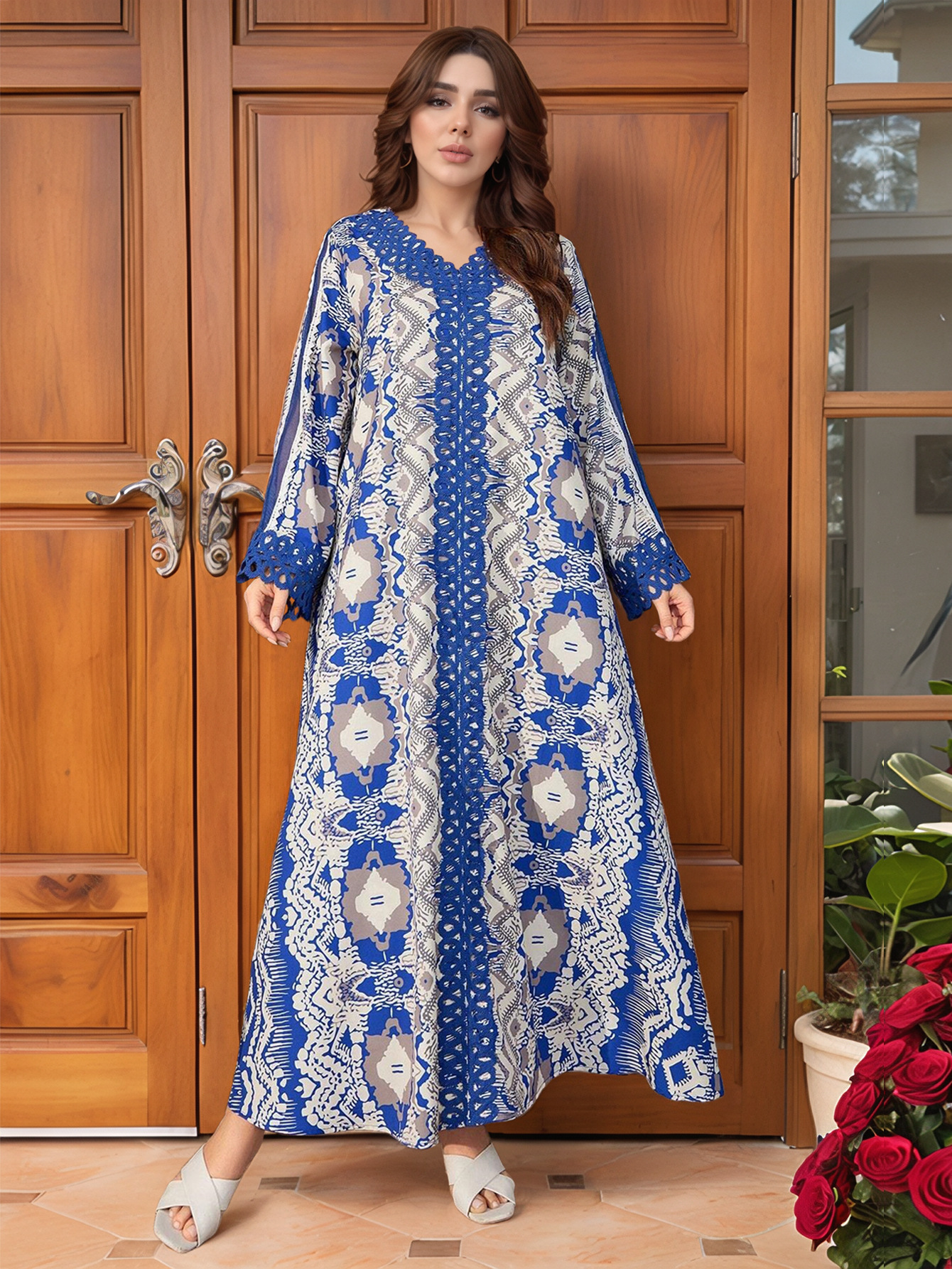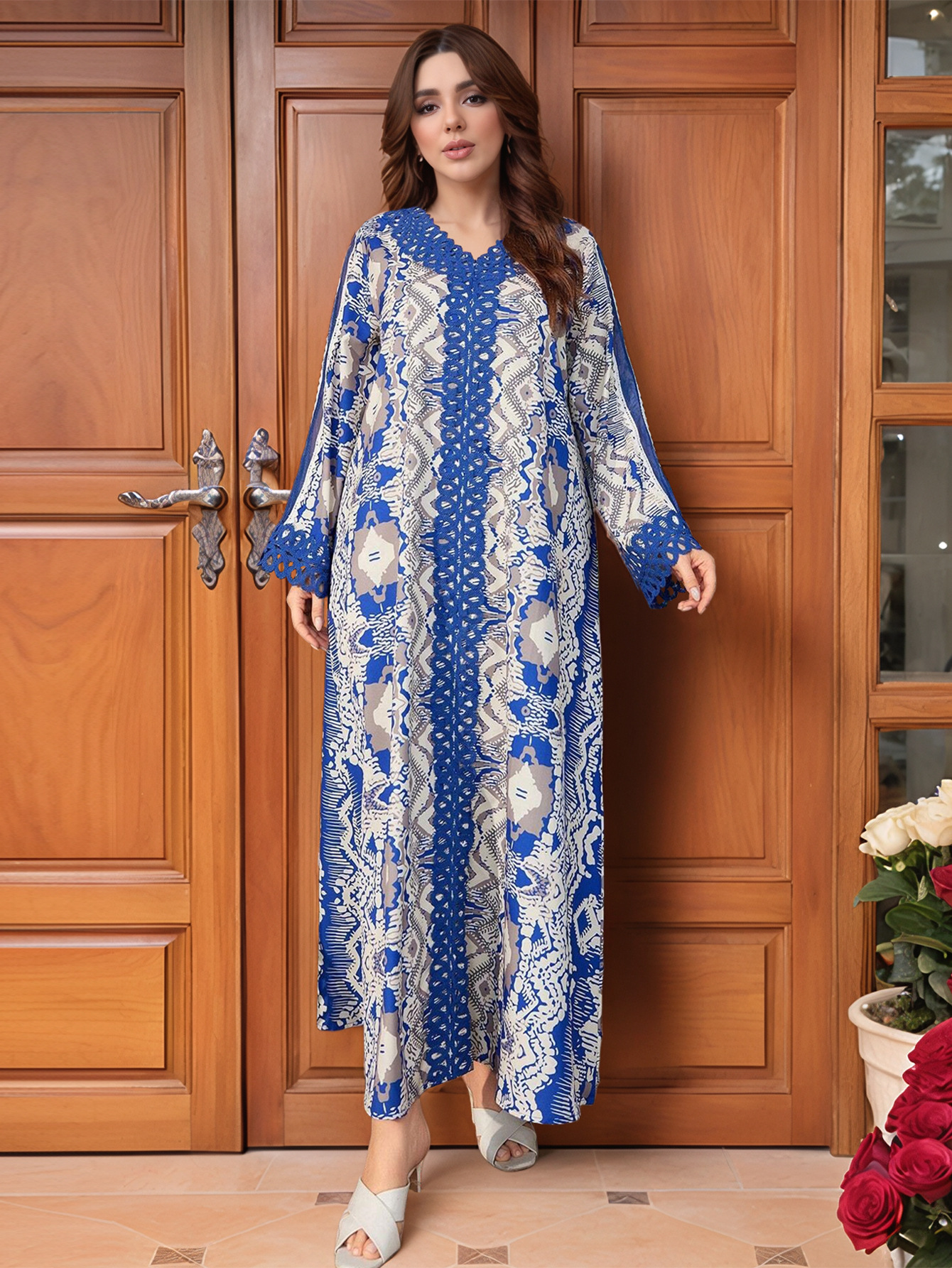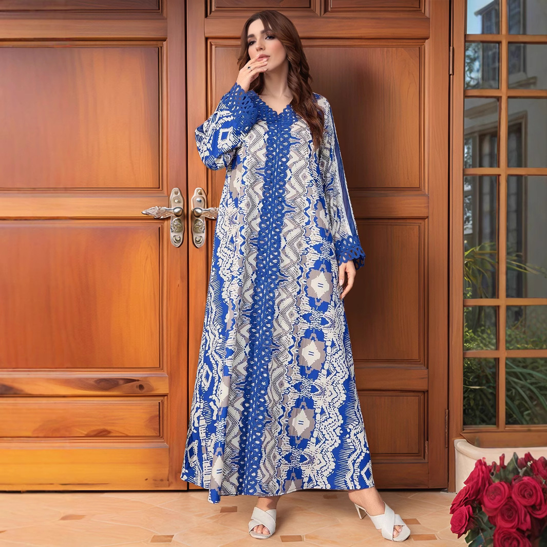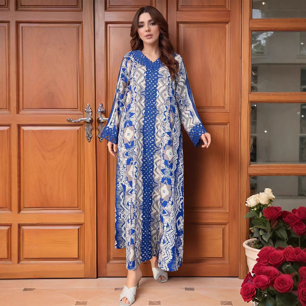 跨境中东阿拉伯长袍穆斯林连衣裙花边拼接搂空宽松大码长裙 English | 投诉