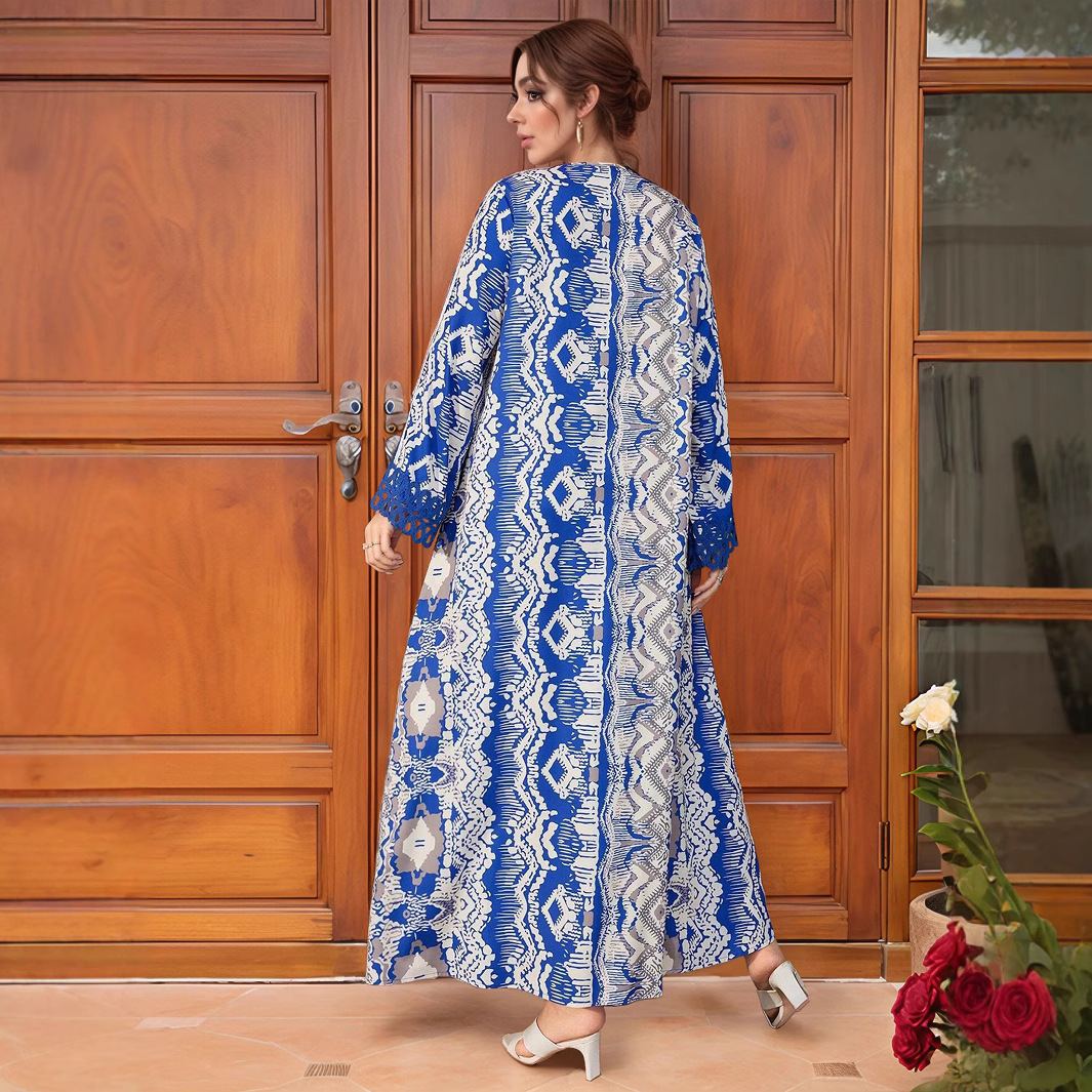 跨境中东阿拉伯长袍穆斯林连衣裙花边拼接搂空宽松大码长裙