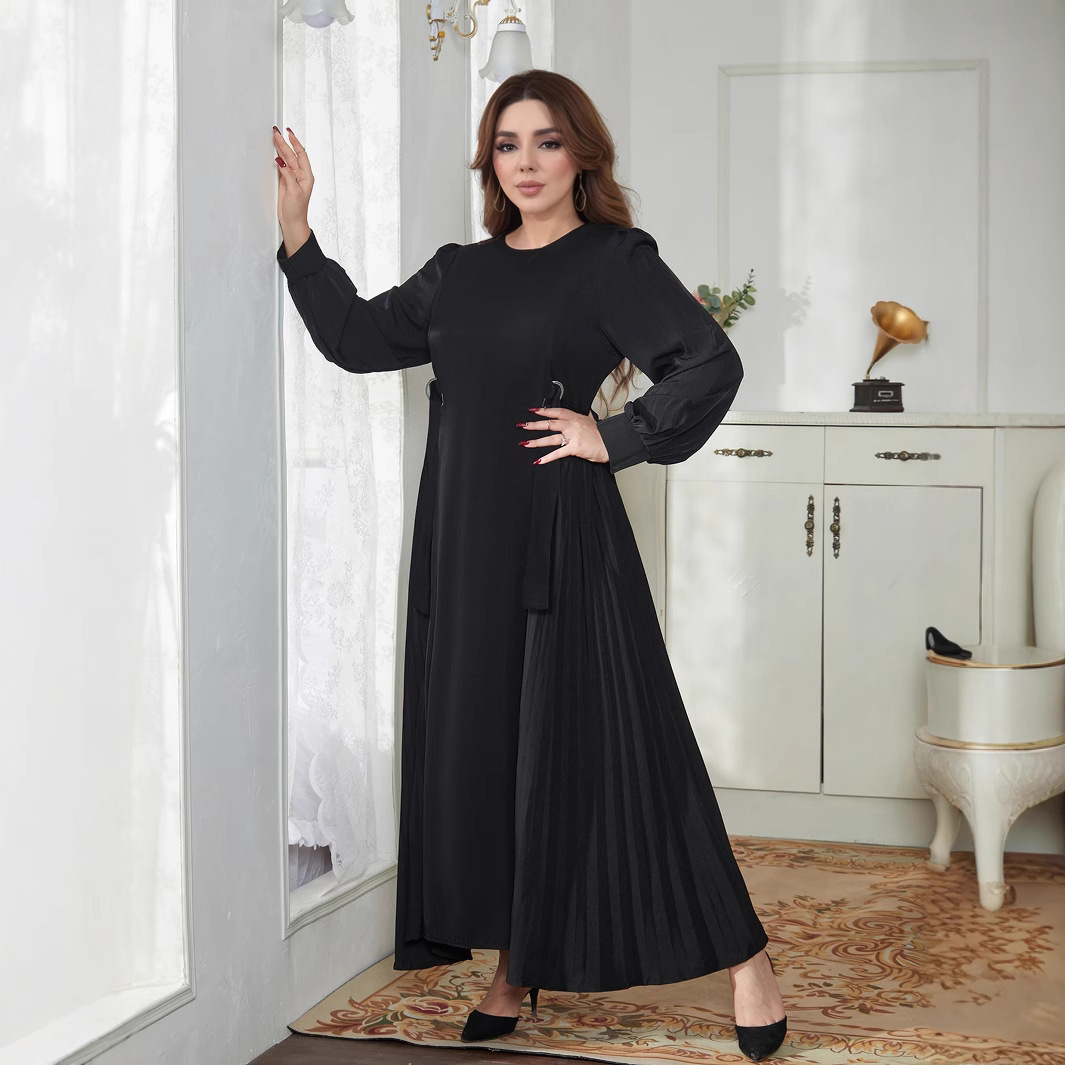 跨境穆斯林女装中东迪拜优雅连衣裙收腰百褶宽松长裙长袍