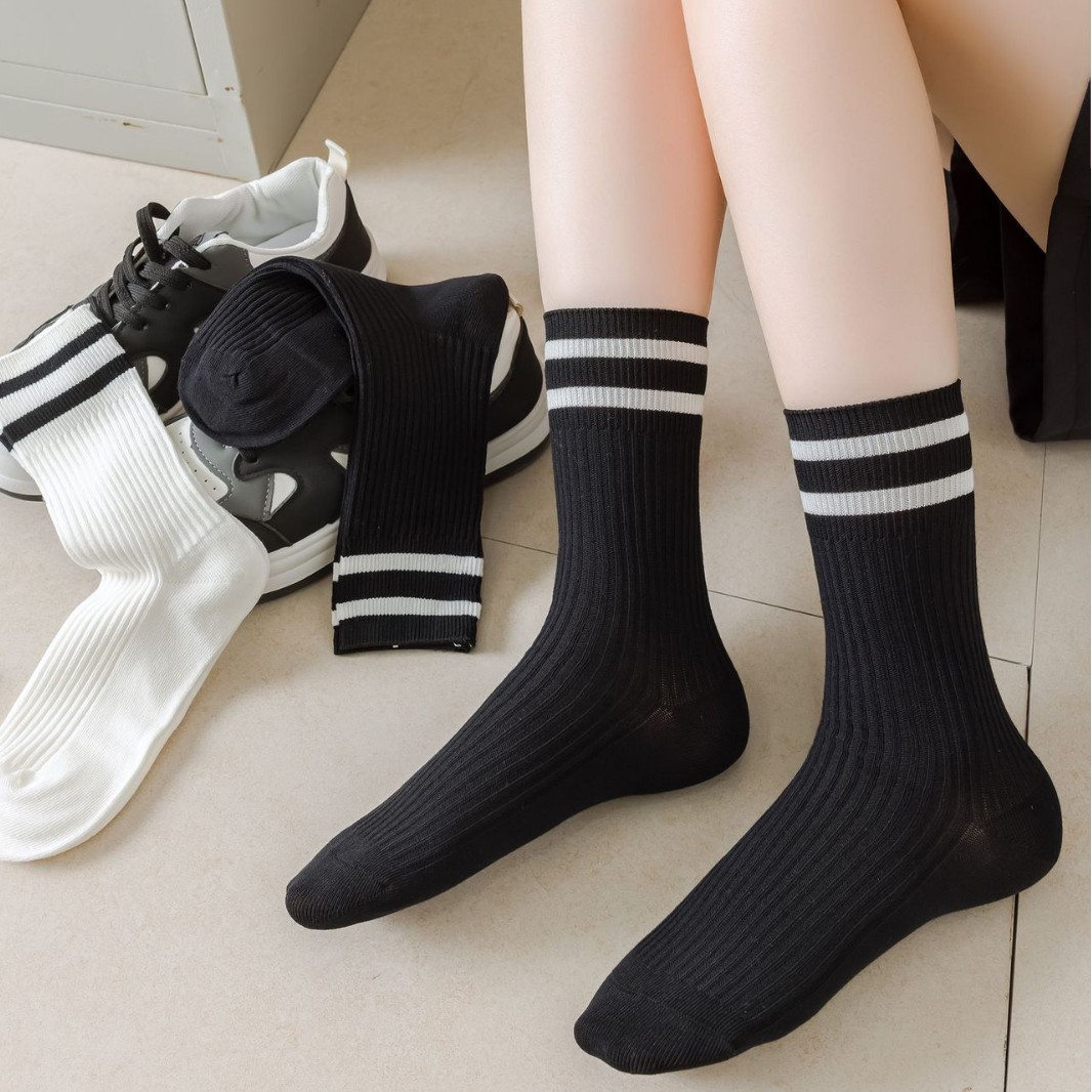 长绒棉双杠堆堆女春秋季日系吸汗防臭女士中筒袜