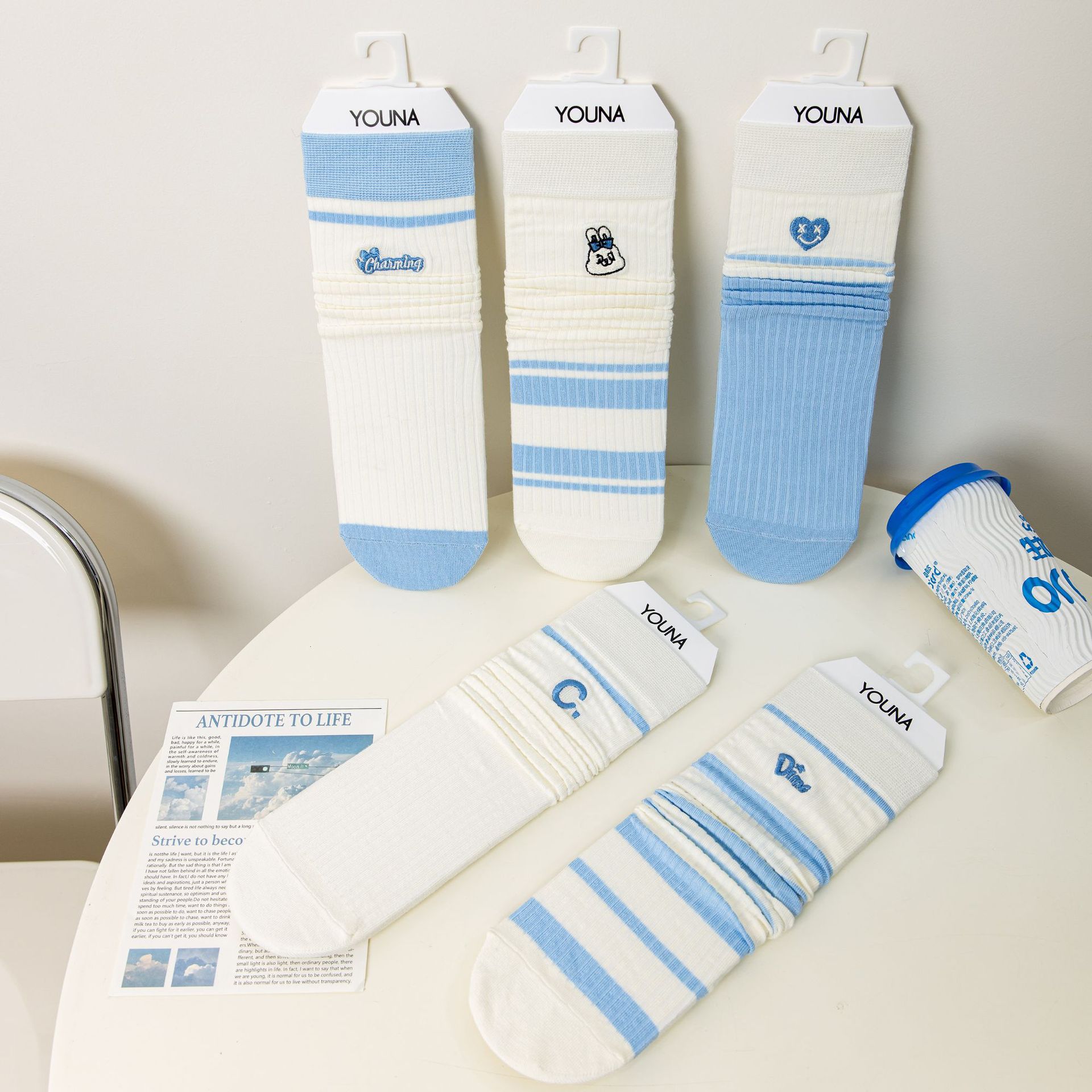 女春秋款蓝色条纹刺绣长筒堆堆袜简约时尚百搭