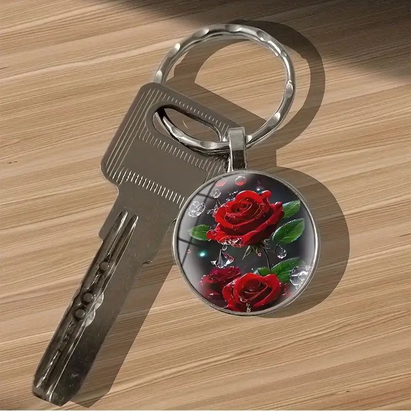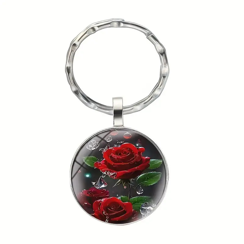 优雅红玫瑰圆形吊坠钥匙扣跨境欧美热销金属钥匙圈环挂件礼物
