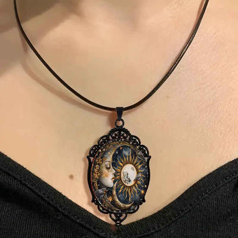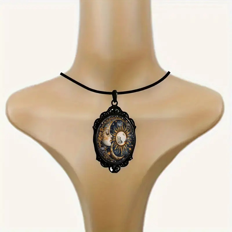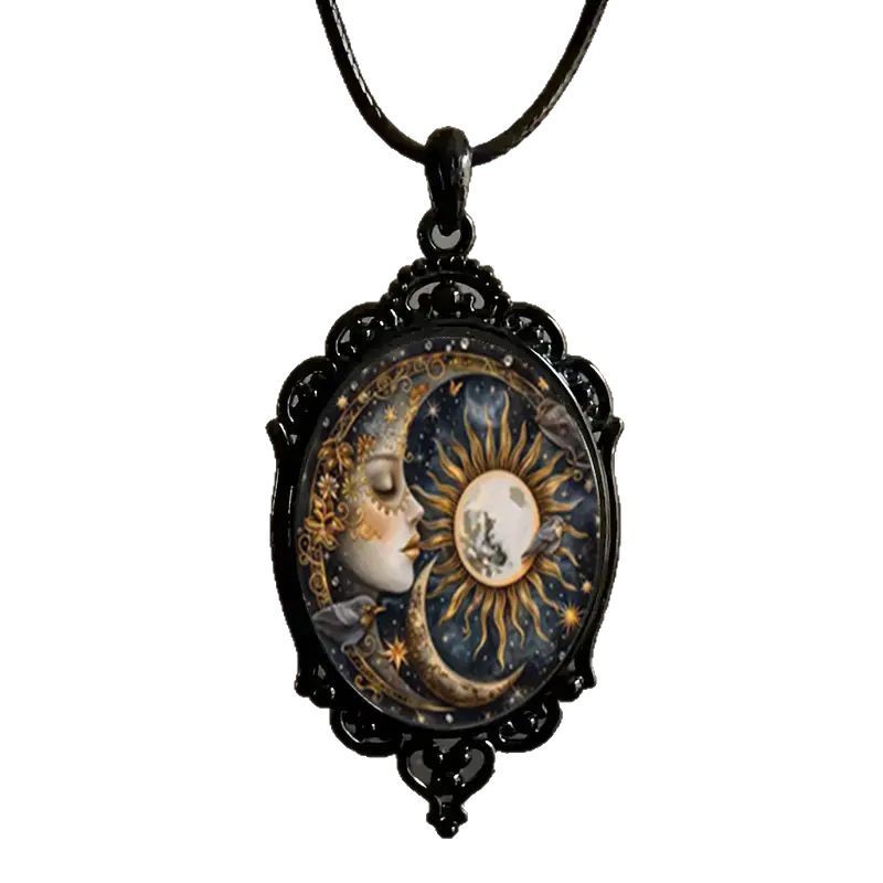 优雅的椭圆形水晶吊坠项链,优美风景图案和黑色框架复古浪漫珠宝