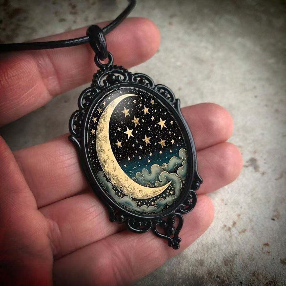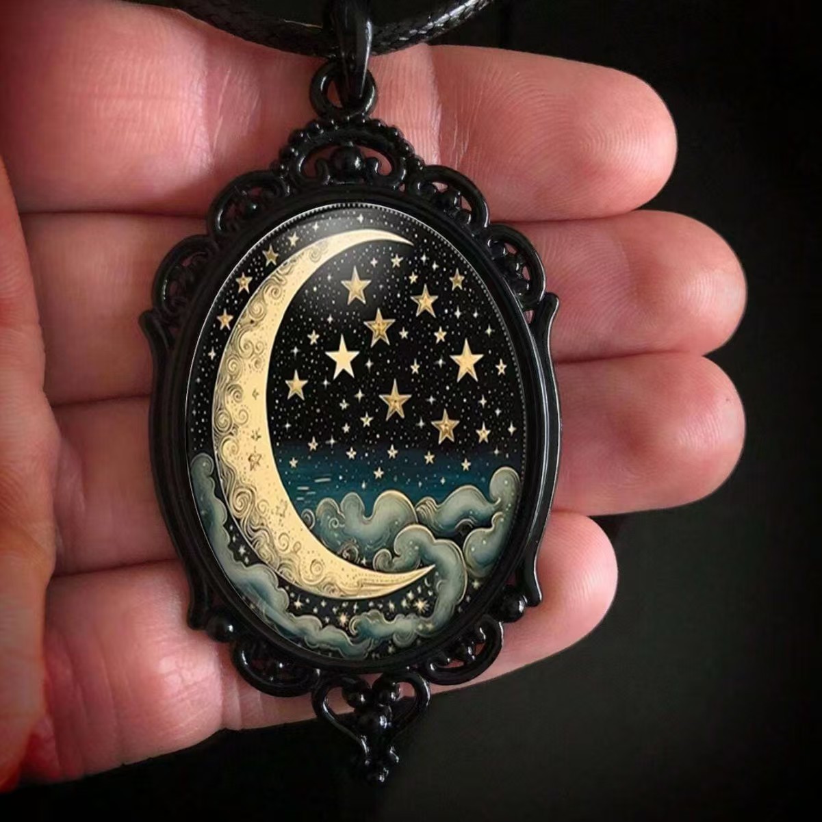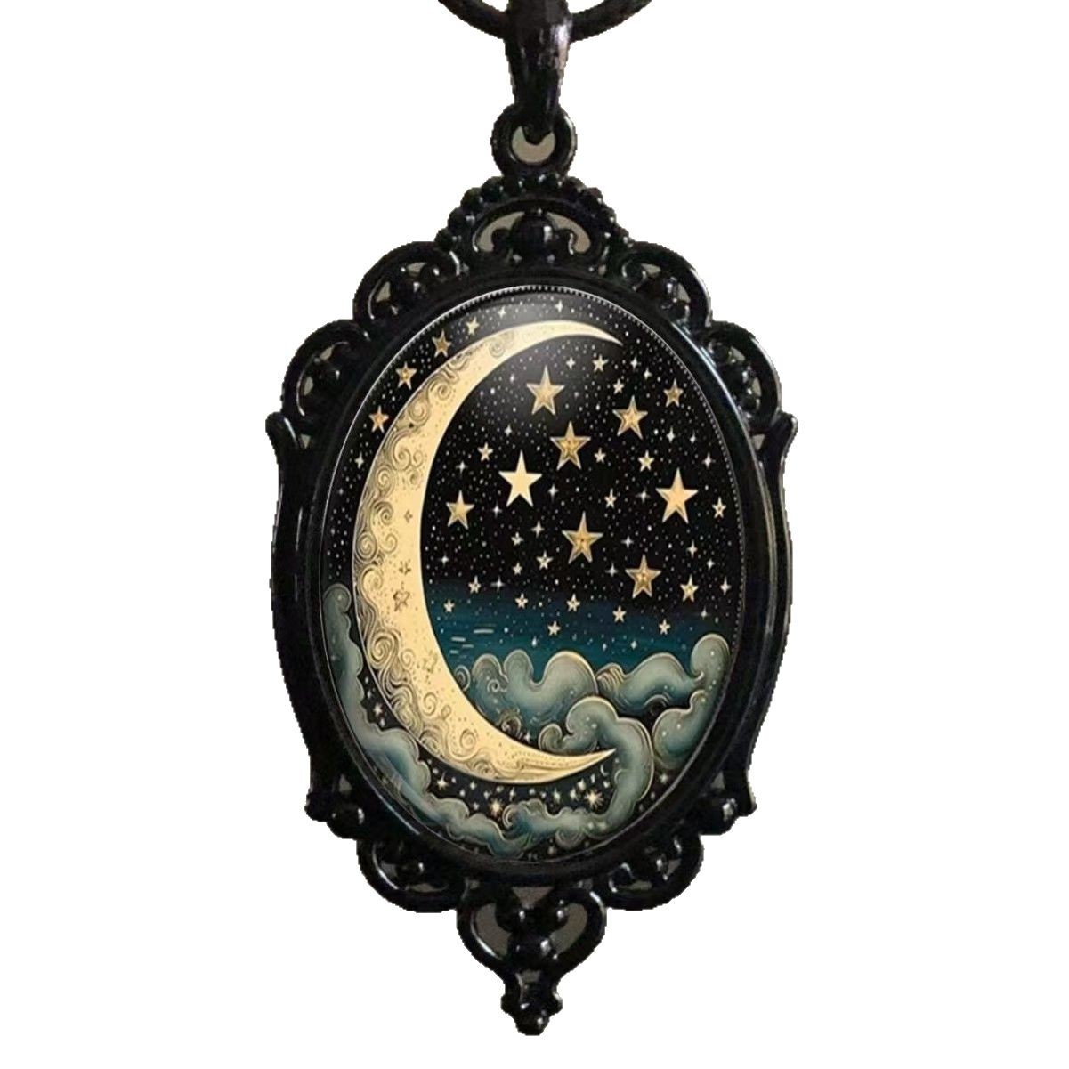 黑色玻璃吊坠项链,哥特式月亮和星空图案,适合女性日常使用 English | 投诉