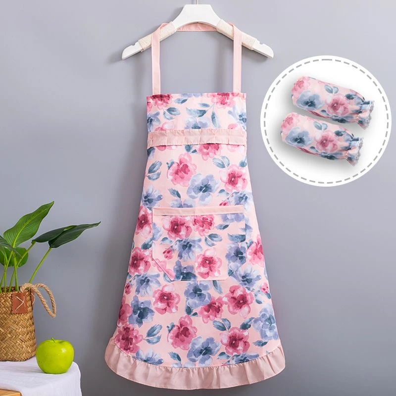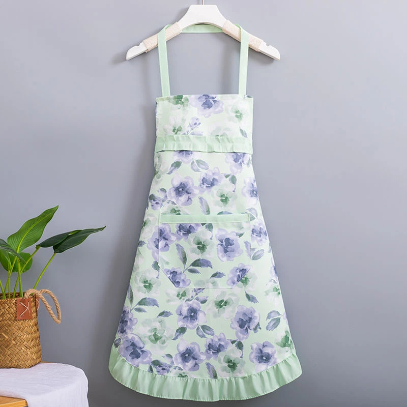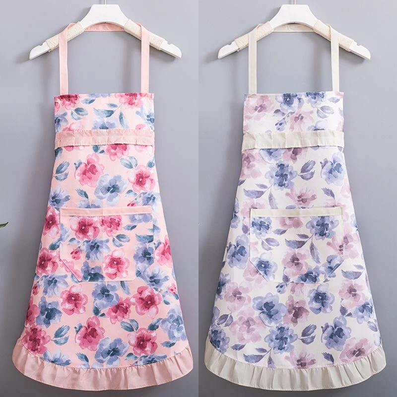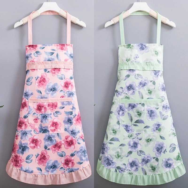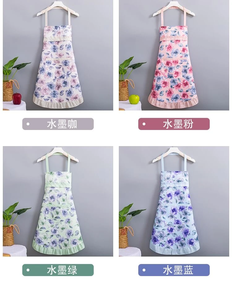 新款简约洋气公主挂脖碎花款围裙夏季薄款厨房家用透气围腰套袖女