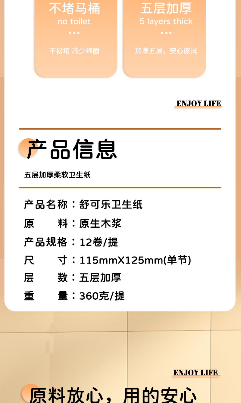 品牌: 舒可乐 是否含芯: 无芯卷纸 单卷净重: 30g 卷数: 12卷 单节尺寸: 115X125mm 层数: 5层 适用场合: 家用 原料成分: 木浆 是否印花: 无印花 重量: 0.5 kg/件