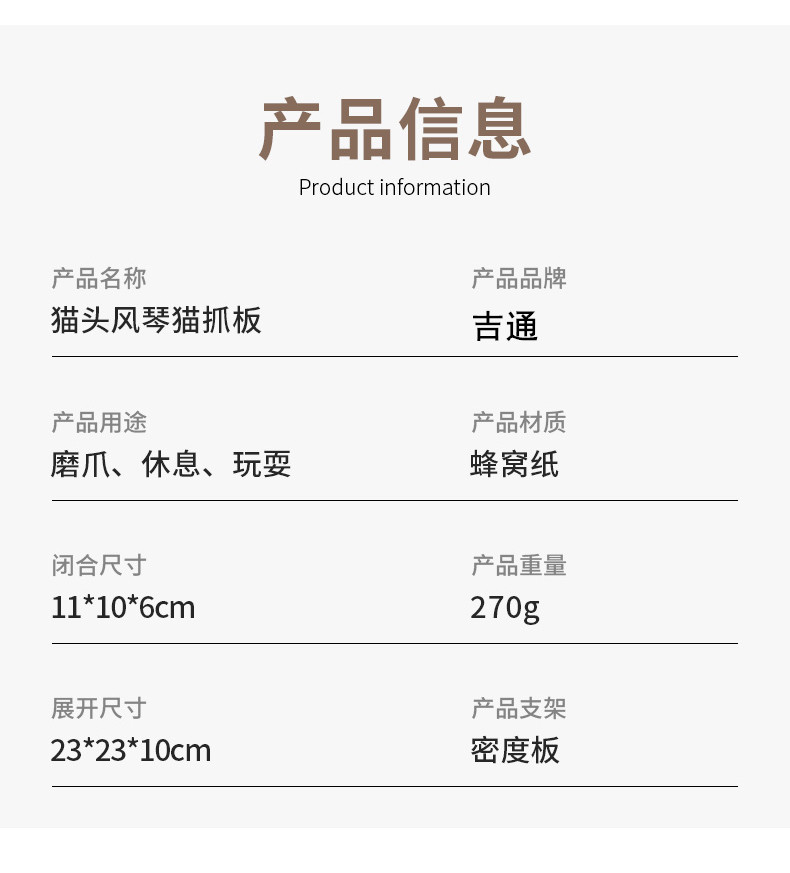 产地: 温州 是否进口: 否 产品类别: 猫咪玩具 货号: 猫头风琴 重量: 1kg 品牌: 吉通 是否专利货源: 否 颜色: 猫头风琴猫抓板 是否跨境出口专供货源: 否 是否属于礼品: 否
