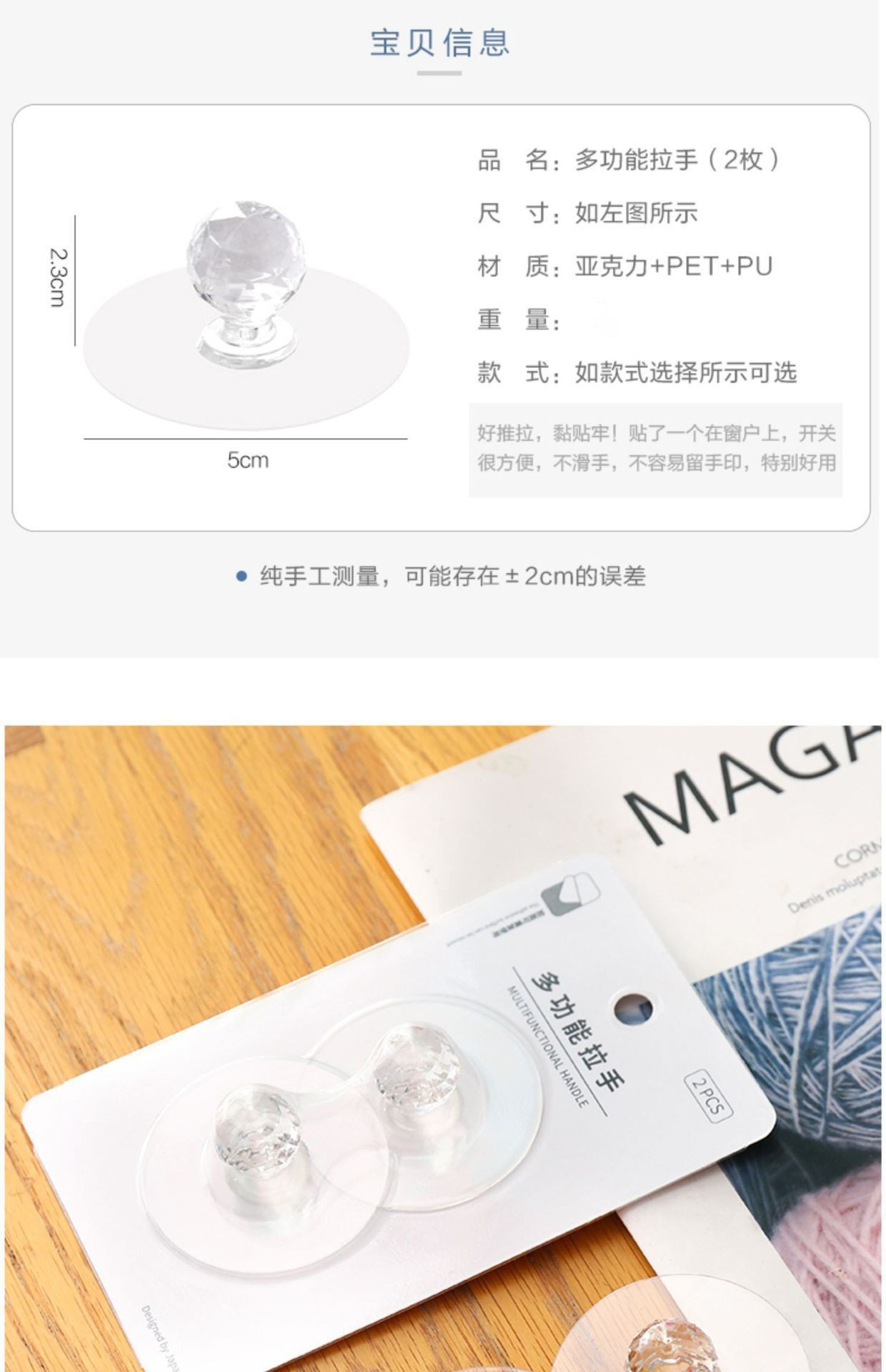 品牌: 其他 是否进口: 否 产品类别: 吸盘挂钩 材质: 亚克力 款式: 单钩 颜色: 拉手贴 货号: 水晶拉手贴 最大承重: 5kg 价格段: 5元以内 产品上市时间: 2013年春