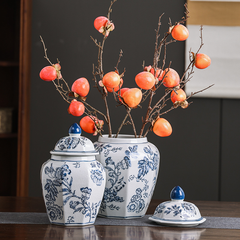 现货青花瓷手绘缠枝花纹八角将军罐客厅陶瓷摆件仿古装饰景德镇陶