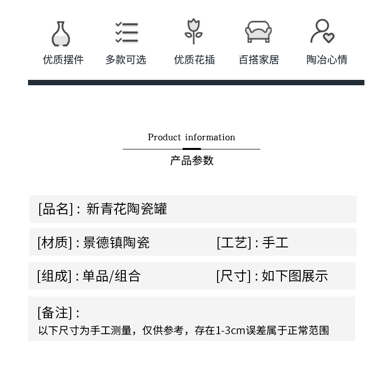 温馨提示:陶瓷罐是带盖子的,盖子是配套发出的,盖子在包裹里面,没找到盖子,不要扔包裹!请耐心找寻!感谢您的理解!如果扔了包裹,我们不补发盖子,谢谢!