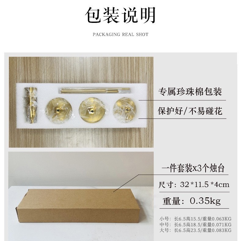 产品编号: J0088 货号: J0088 器皿种类: 烛台 材质: 金属 包装: 纸盒装 工艺: 电镀 是否专利货源: 否 是否进口: 否 尺寸: 铜色三件套,金色三件套,黑色三件套,珍珠 主要下游平台: ebay,亚马逊,wish,速卖通,独立 重量: 0.15 kg/套