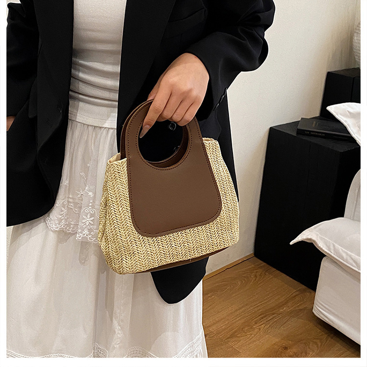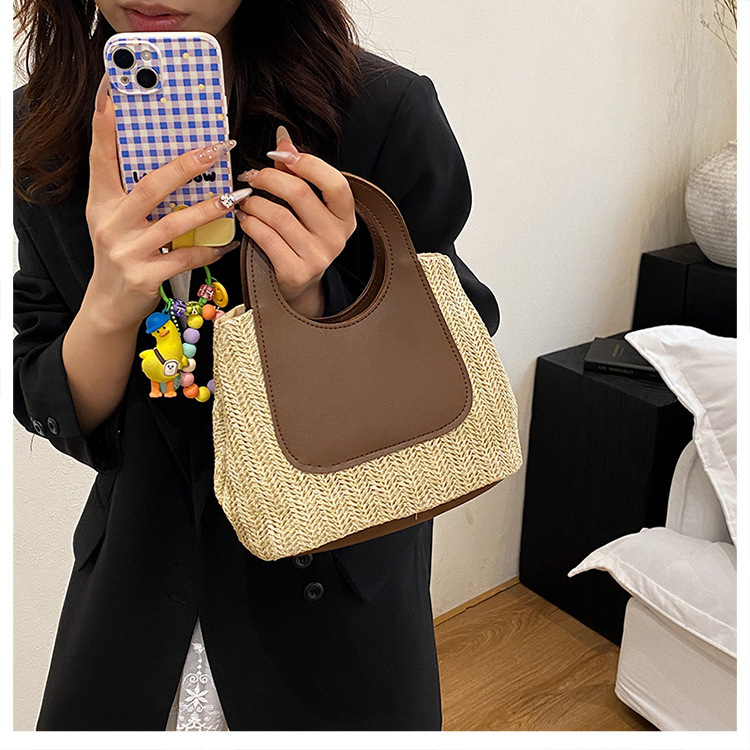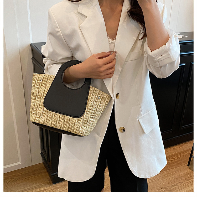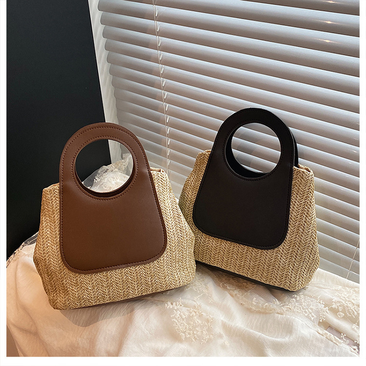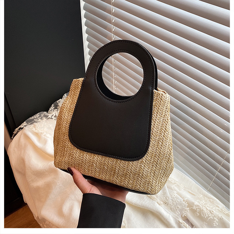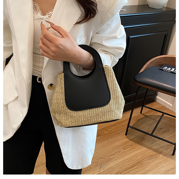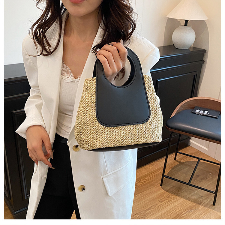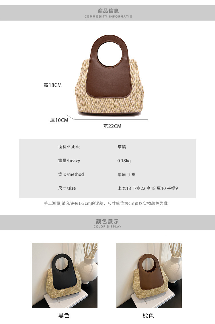 2025夏季复古撞色拼接草编包大容量手工编织包简约时尚单肩手提包