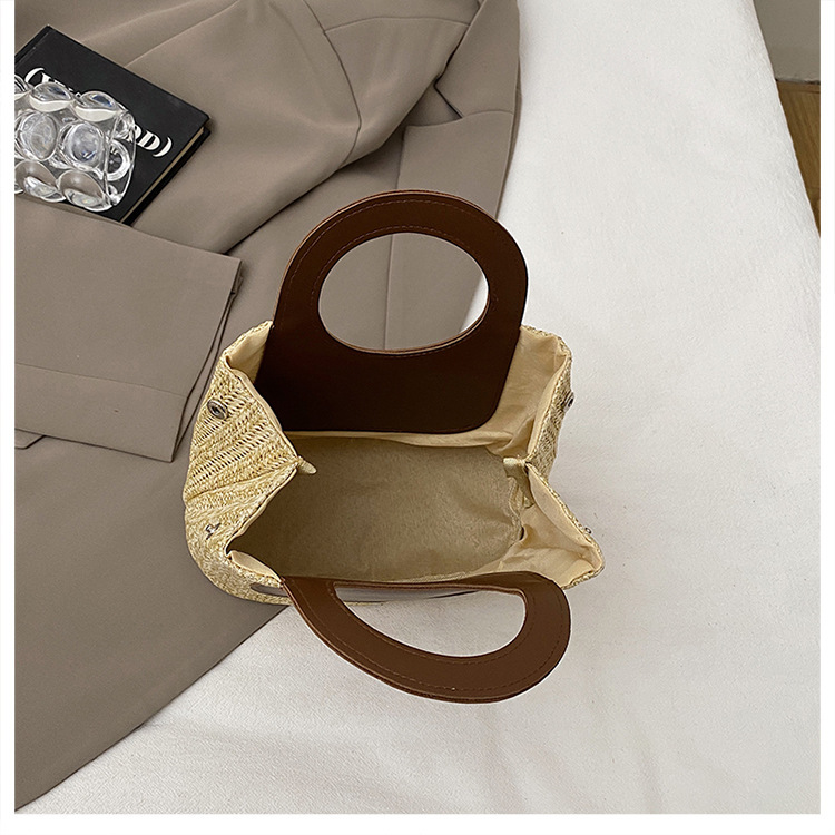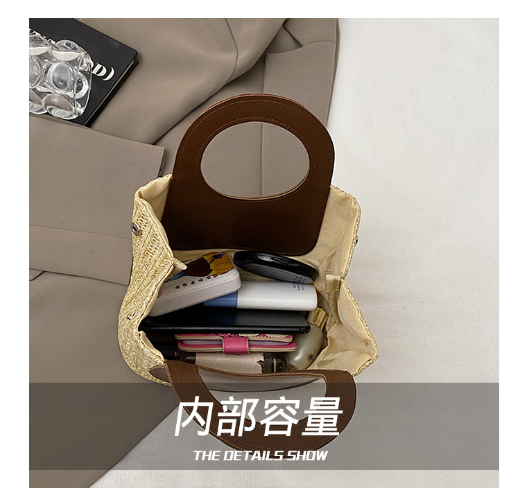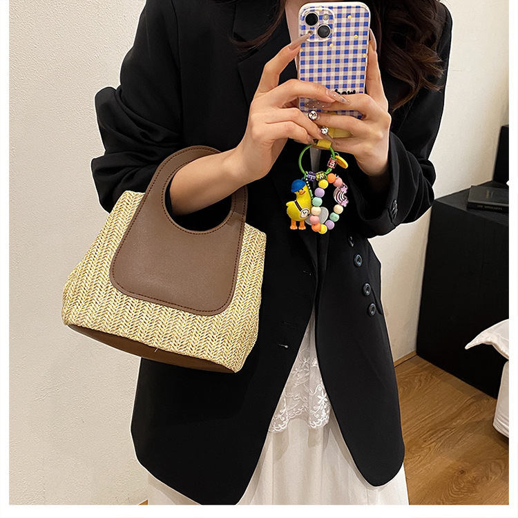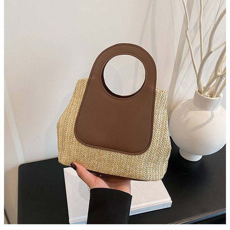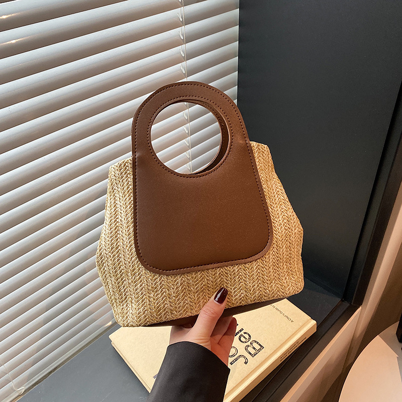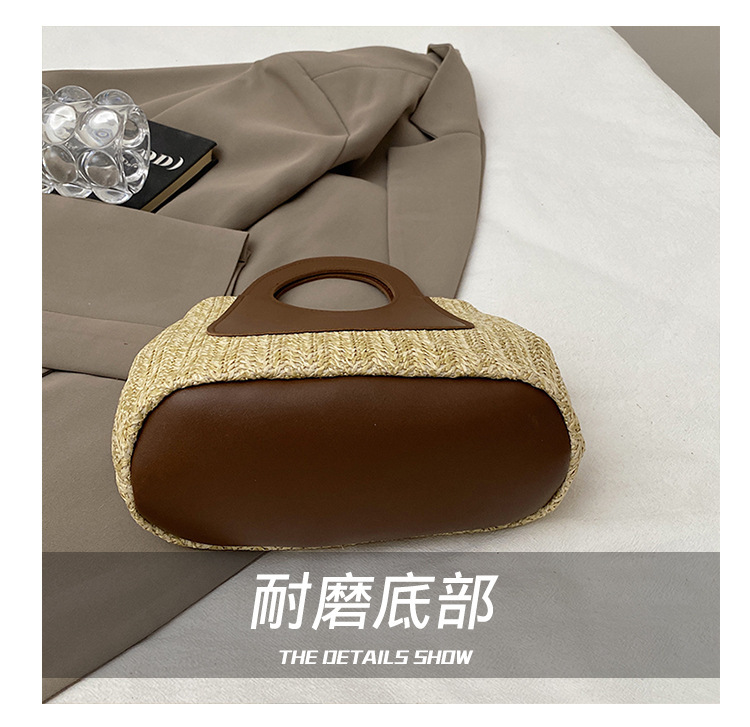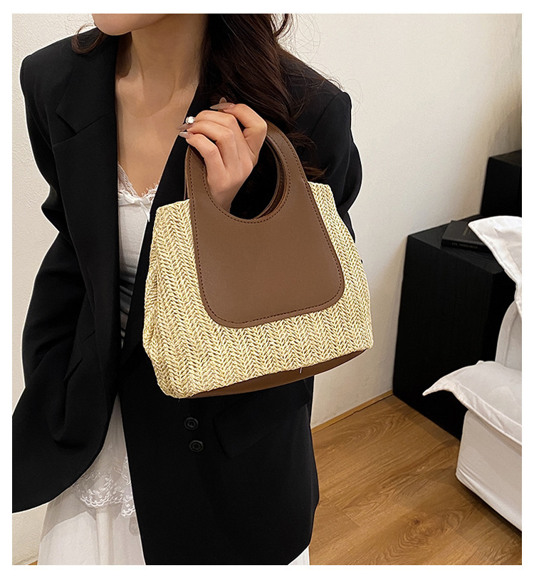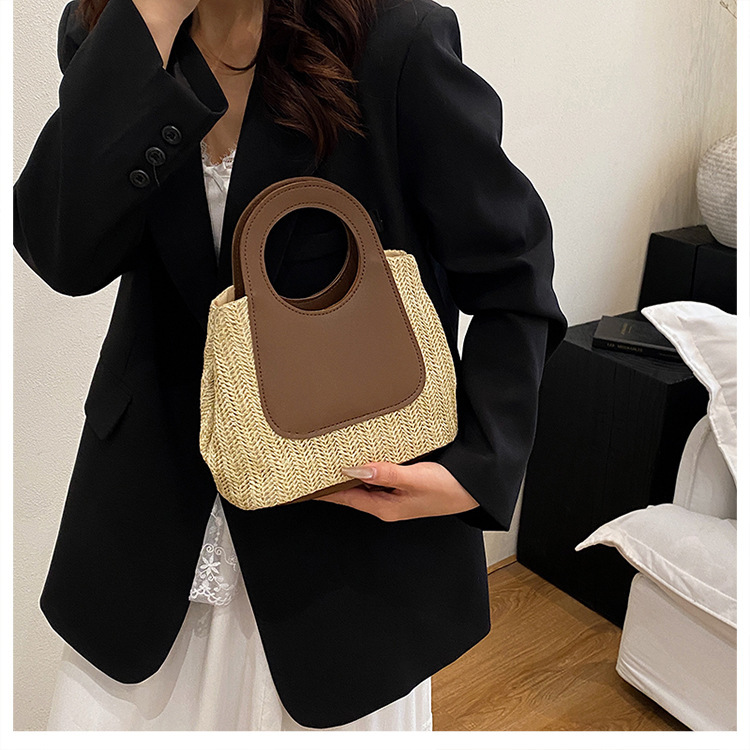 2025夏季复古撞色拼接草编包大容量手工编织包简约时尚单肩手提包
