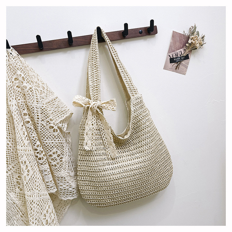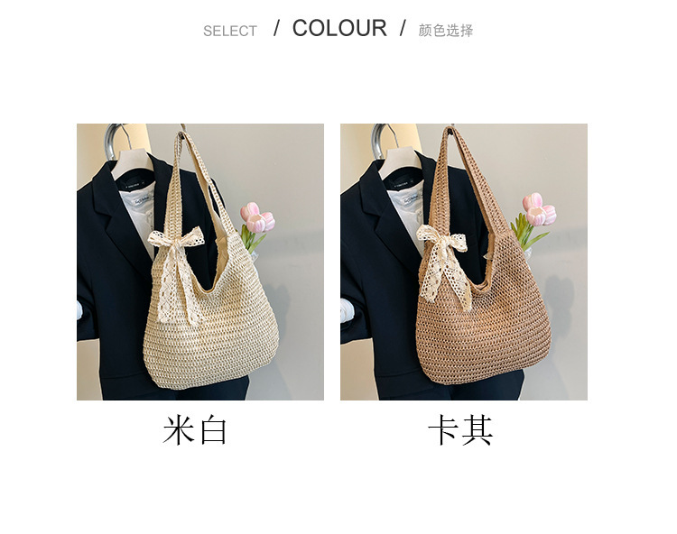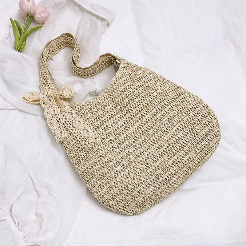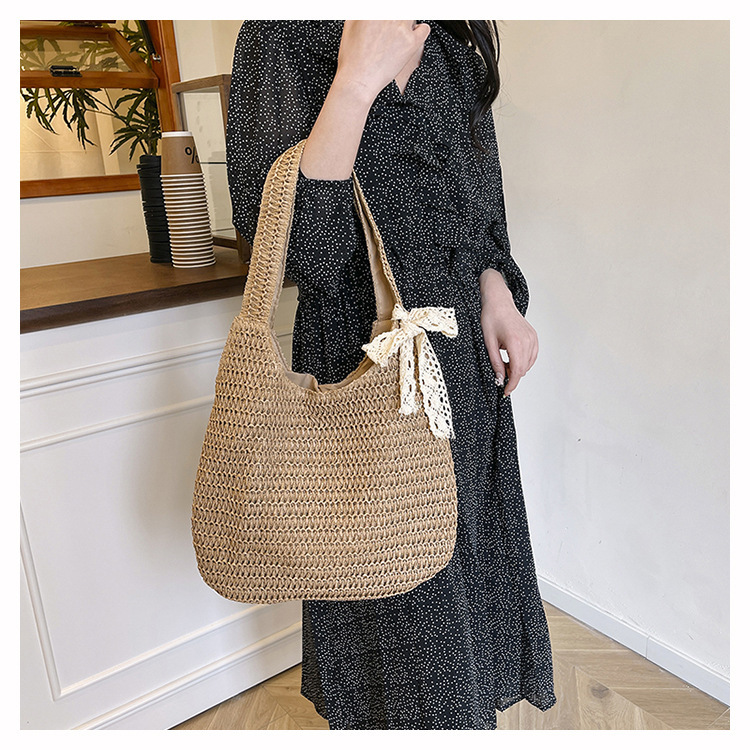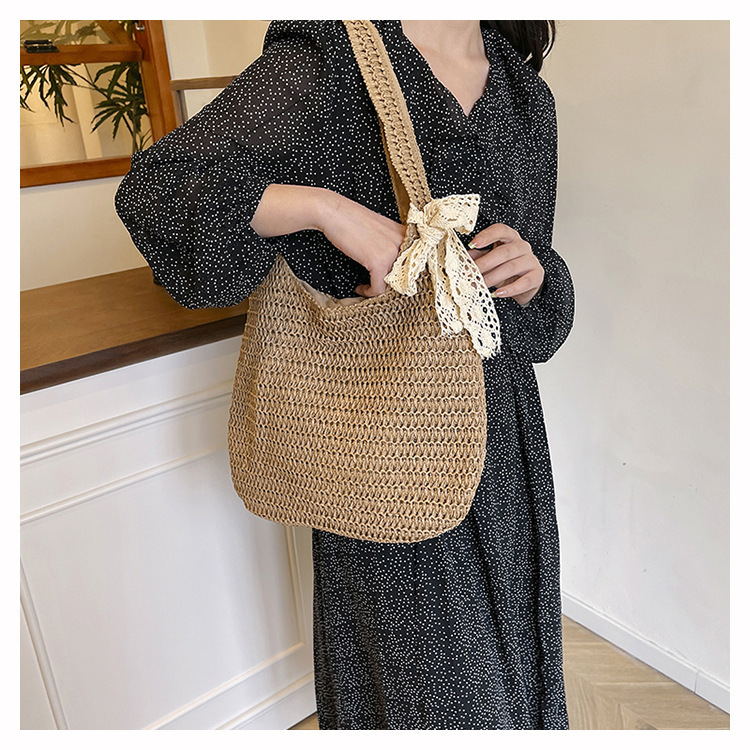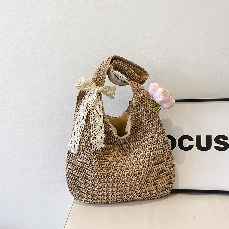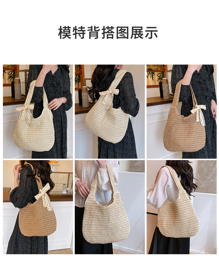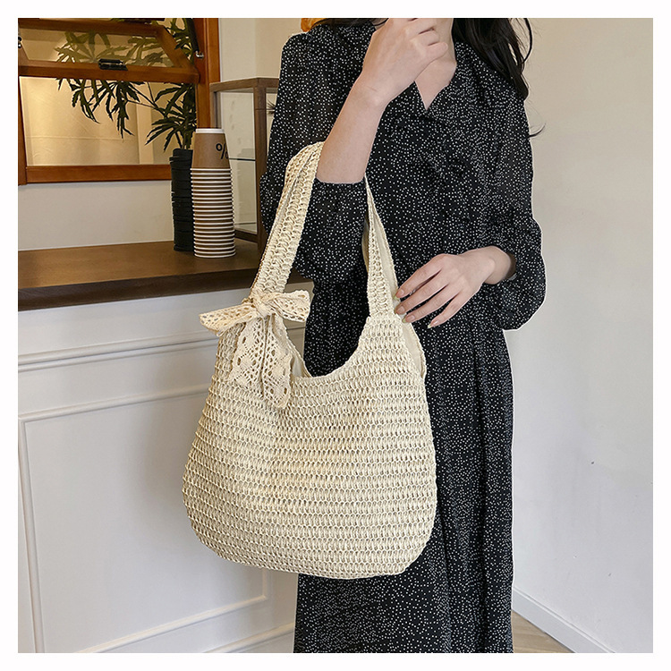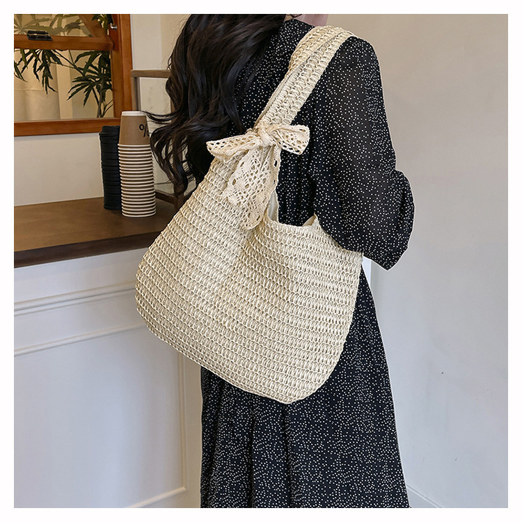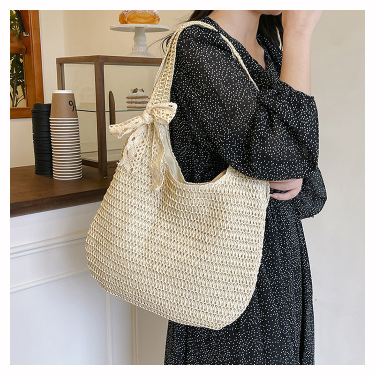 夏季时尚流行沙滩单肩包编织手提托特包草编菜篮子丝巾蝴蝶结女包