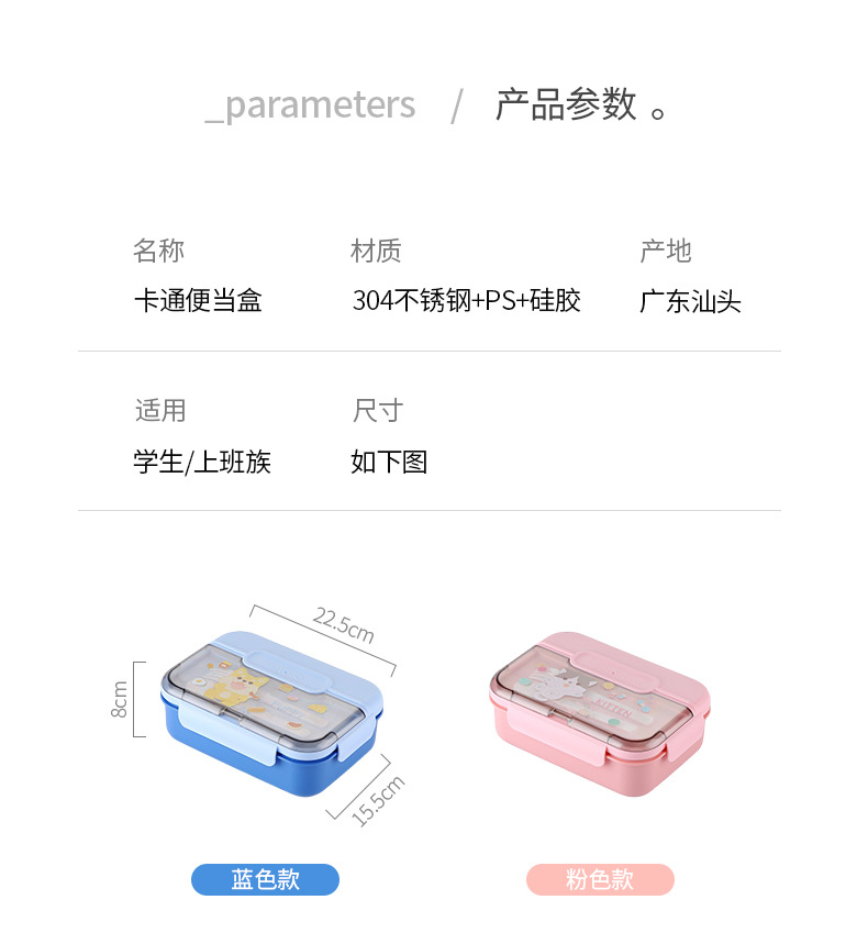 是否进口: 否 材质: 304不锈钢 形状: 长方形 是否保温: 否 微波炉: 可用 风格: 可爱风 图案: 卡通 适用人群: 学生