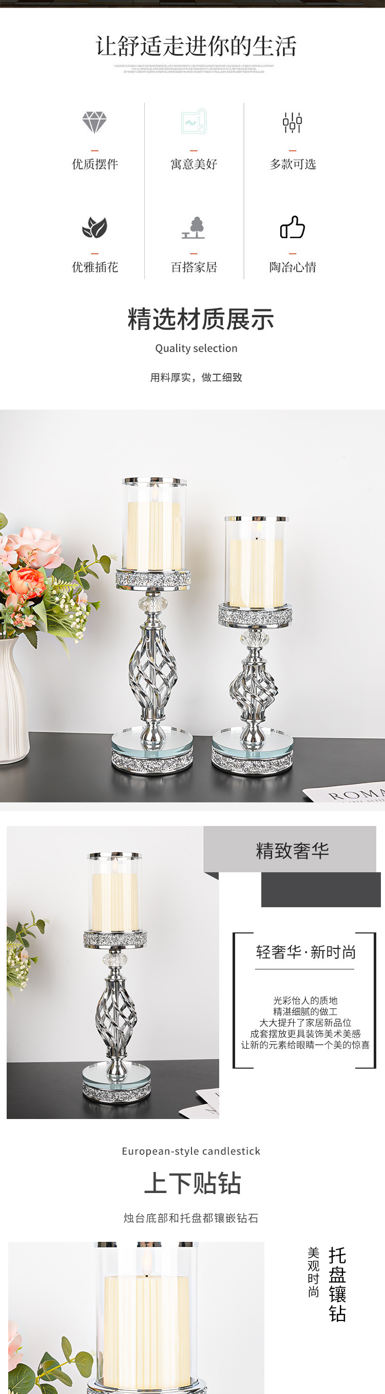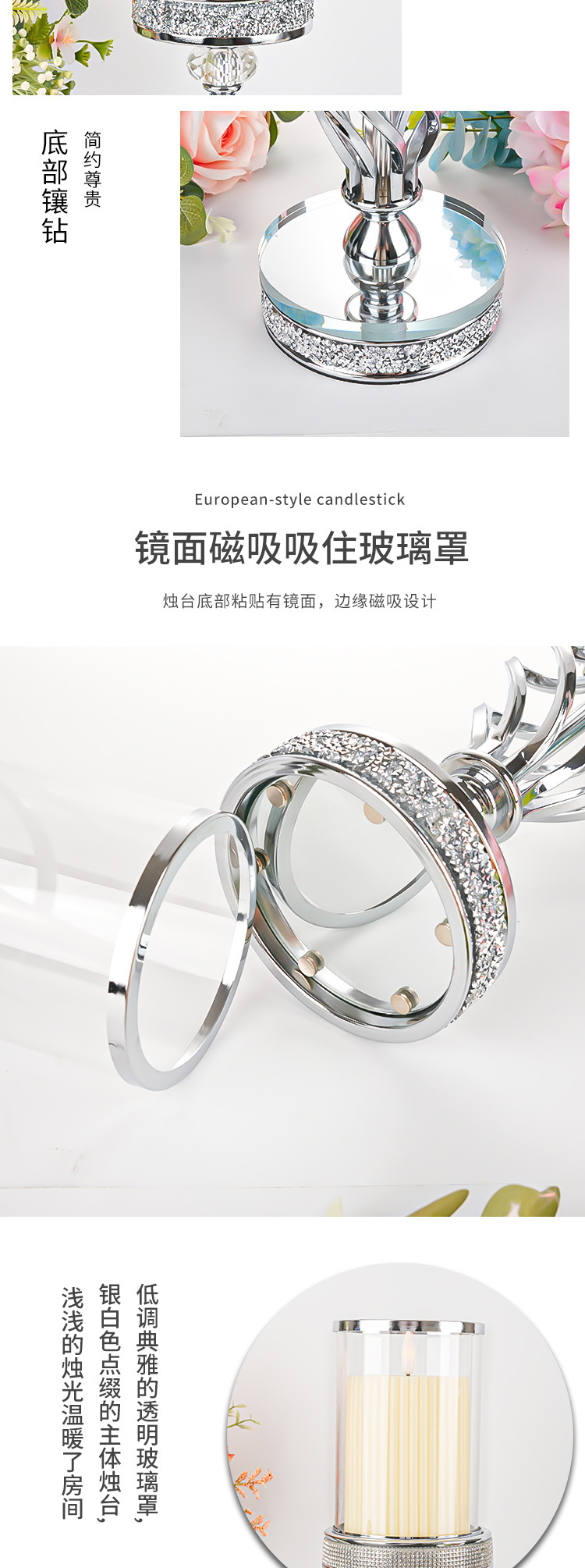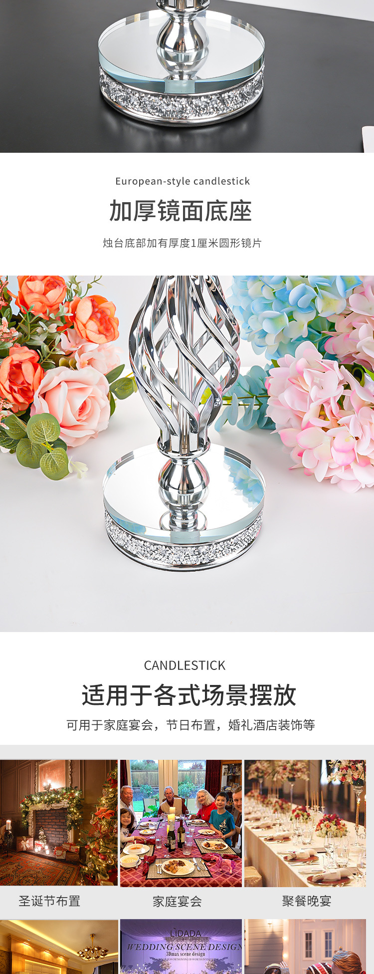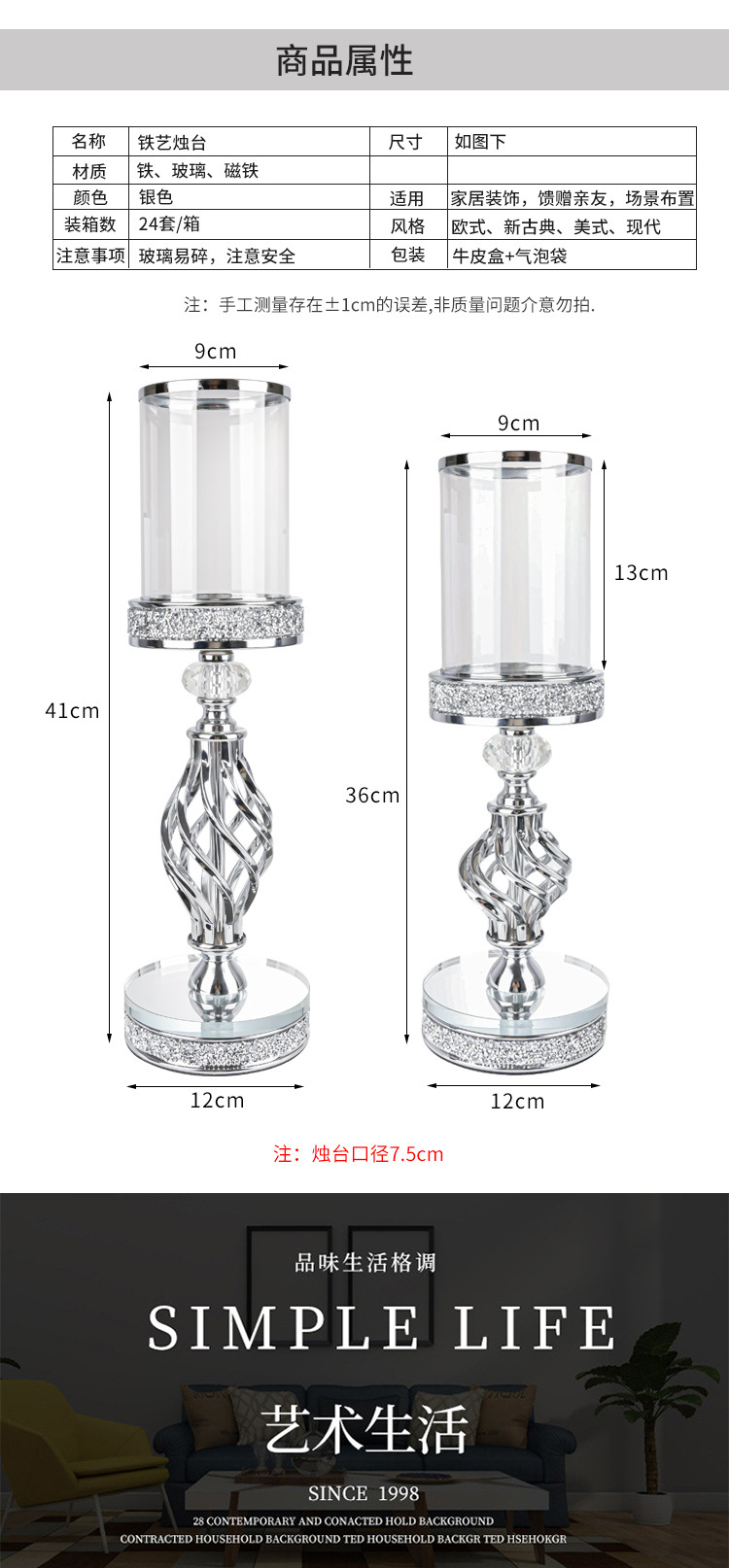 产品编号: HJ24072 货号: HJ24072 器皿种类: 烛台 材质: 金属 包装: 纸盒装 工艺: 电镀 是否专利货源: 否 是否进口: 否 尺寸: 银色散钻中号,银色散钻大号,金色中号,金 是否跨境出口专供货源: 否 重量: 0.9 kg/个