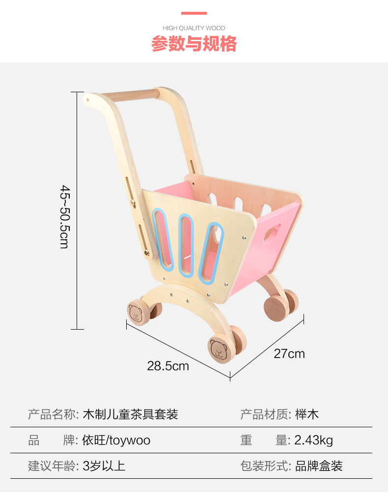 品牌: Toy Woo/依旺 原产地: 中国 适用人群: 不限 特色功能: 仿真玩具 是否进口: 国产 包装: 彩盒 玩具材质: 木制 能力培养: 情感,视觉,互动玩具 货号: - 是否有动漫形象: 否 类型: 仿真购物车 是否专供外贸: 否 3C配置类别: 14岁以下的木制玩具 适用年龄: 婴幼(0-3岁) 重量: 0.5 kg/套
