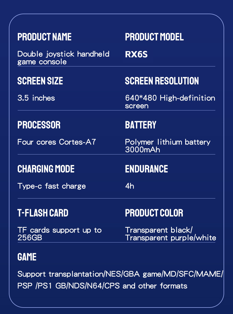 品牌: 中性 型号: RX6S 黑色(64G),RX6S 紫色 货号: RX6S 产地: 深圳 货源类别: 现货 商品类型: 全新 产品类别: 摇杆游戏机 游戏类型: ACT动作游戏 游戏版本: 简装版 操作系统: linux