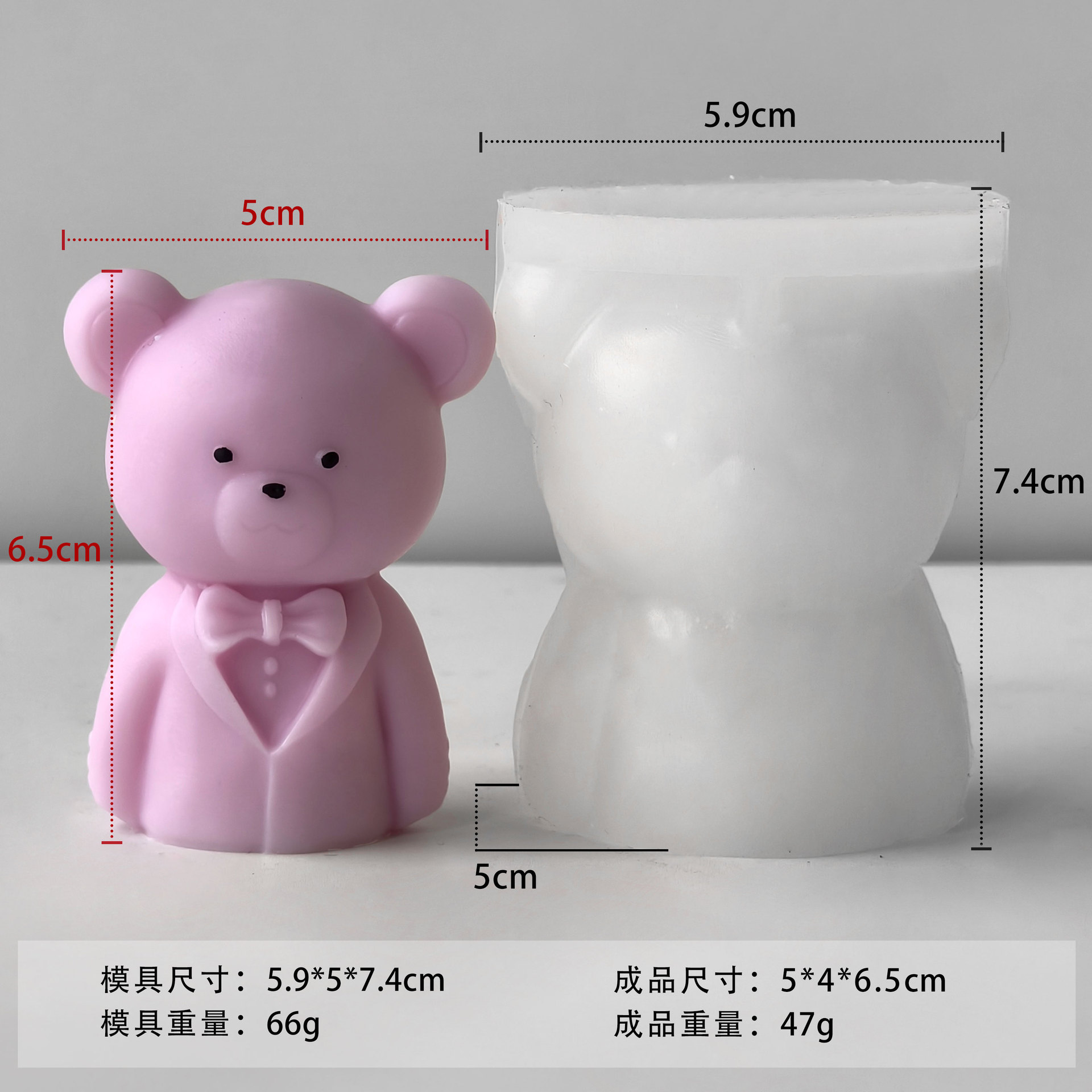 是否进口: 否 产品类别: 蛋糕模 形状: 不规则形 材质: 硅胶 包装规格: opp 产品上市时间: 2025 价格段: 10-20元 是否有专利: 否 用途: 香薰 蜡烛 规格: 小熊(女)模具J-5254,小熊(男)模 重量: 0.066 kg/件