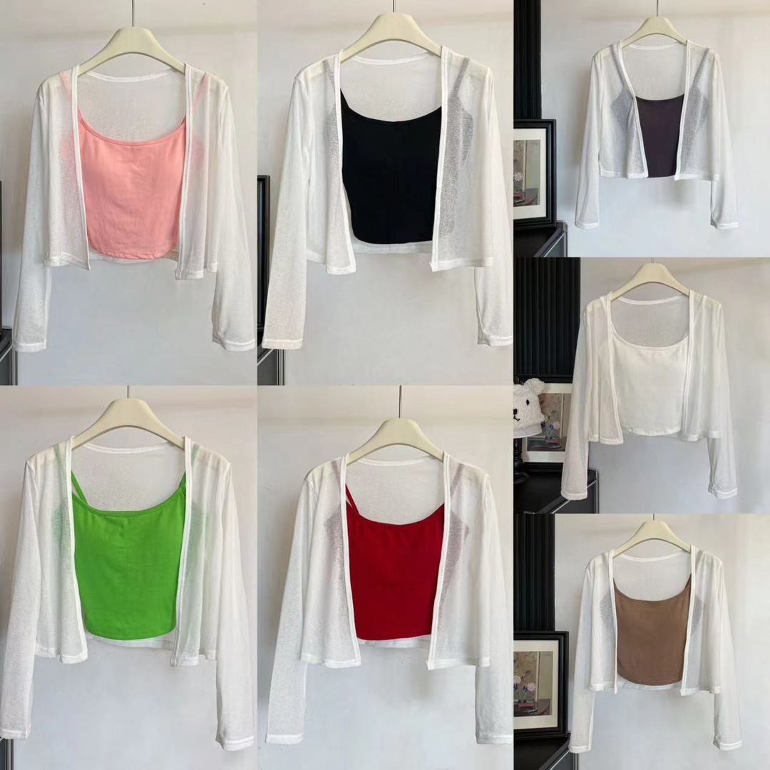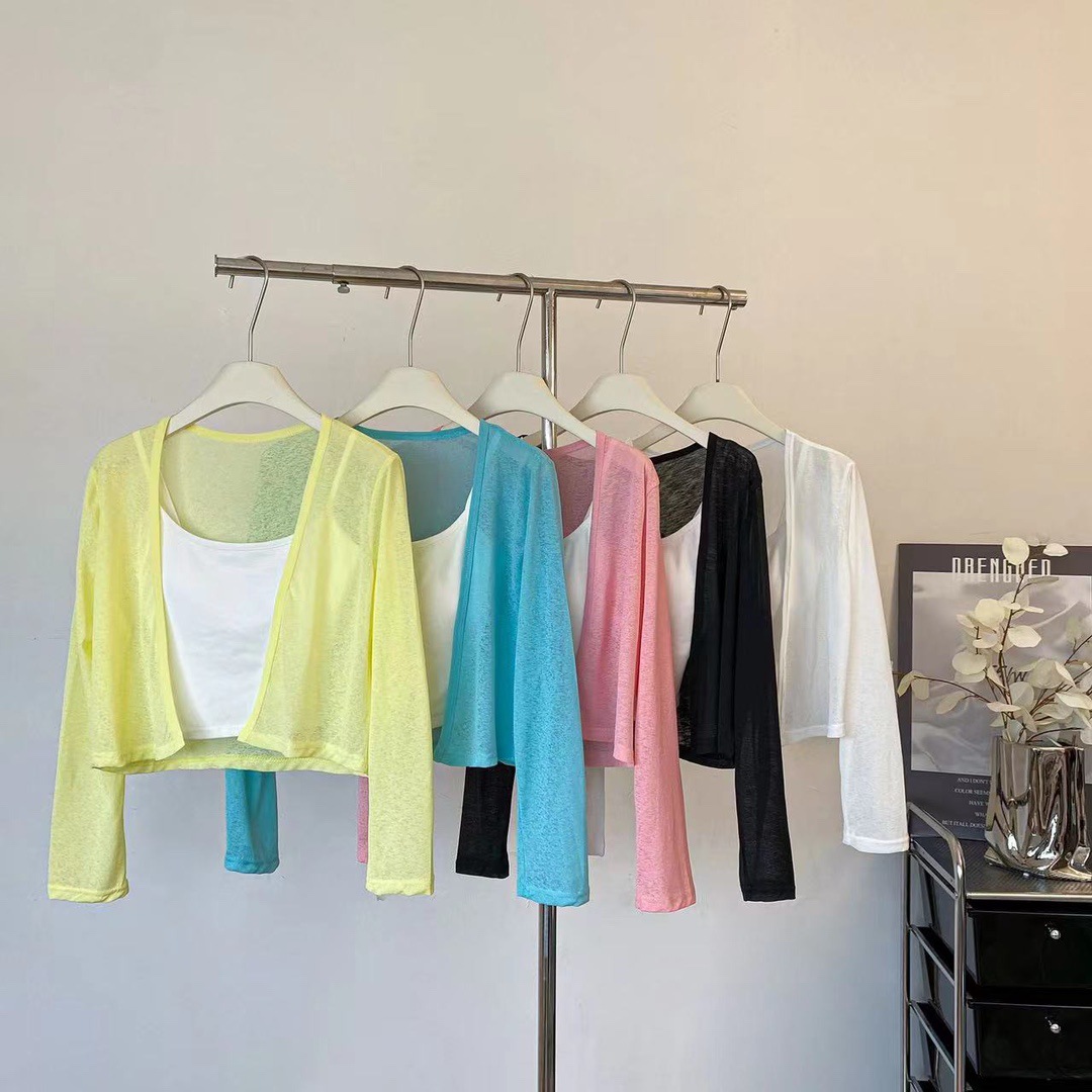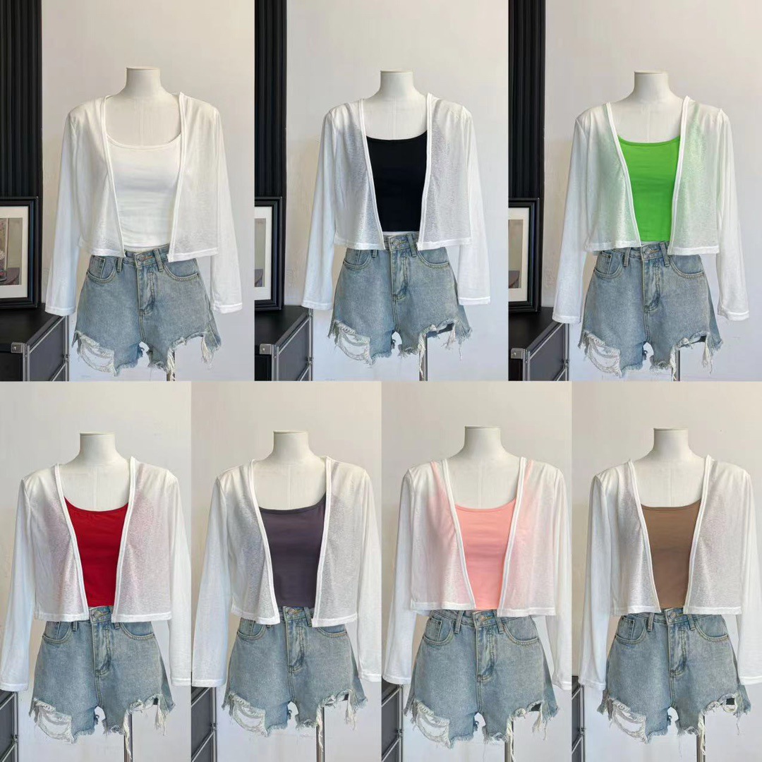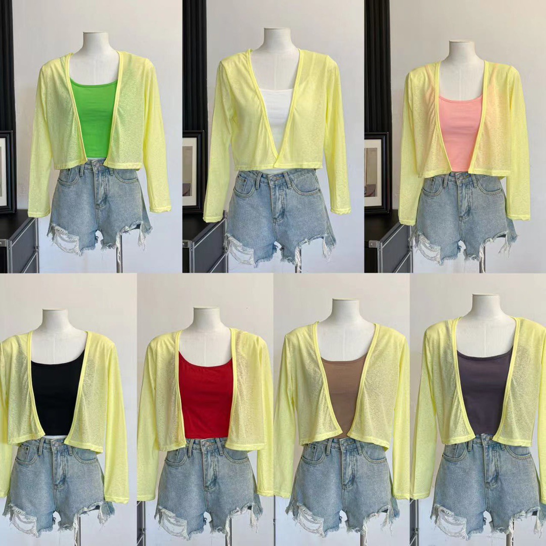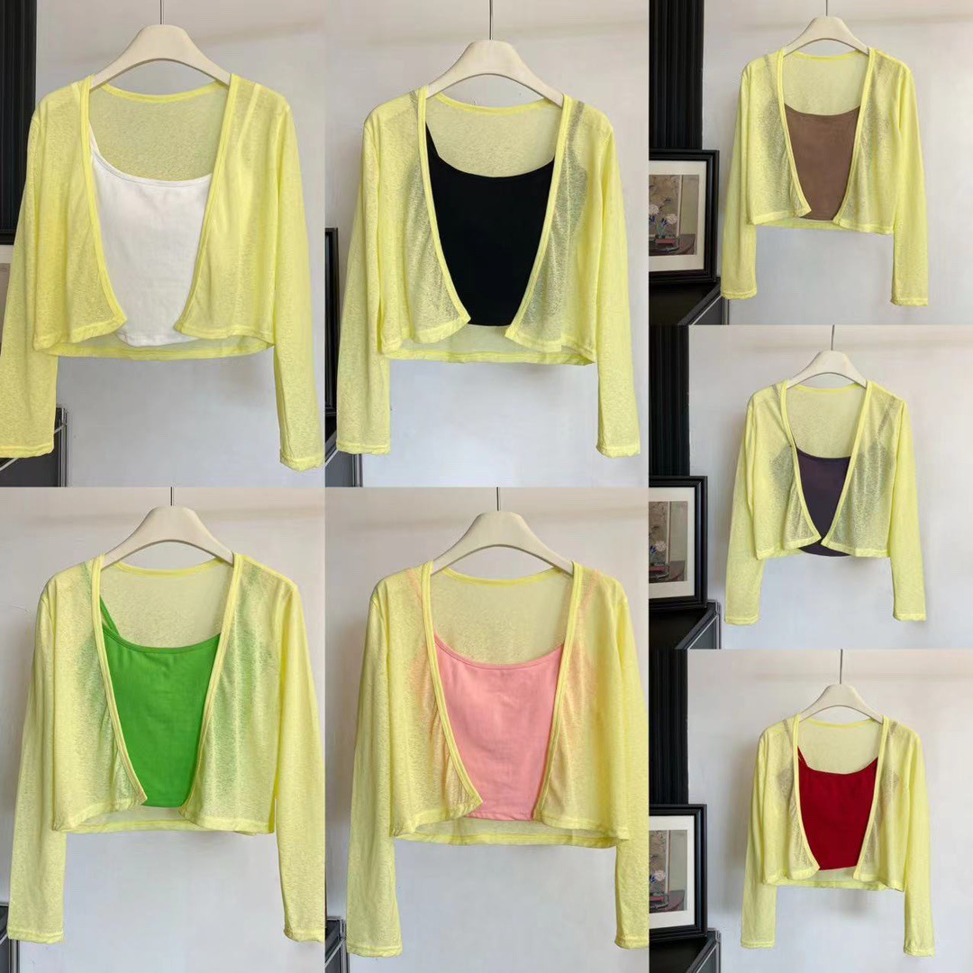 版型: 宽松型 衣长: 短款(40cm《衣长≤50cm) 上市年份/季节: 2024年夏季 颜色: 白色(单开衫),黑色(单开衫),黄色(单 尺码: 均码 货号: 7166 面料名称: 氨纶 风格: 清新风 流行元素: 透视 风格类型: 清新甜美 重量: 0.1 kg/件
