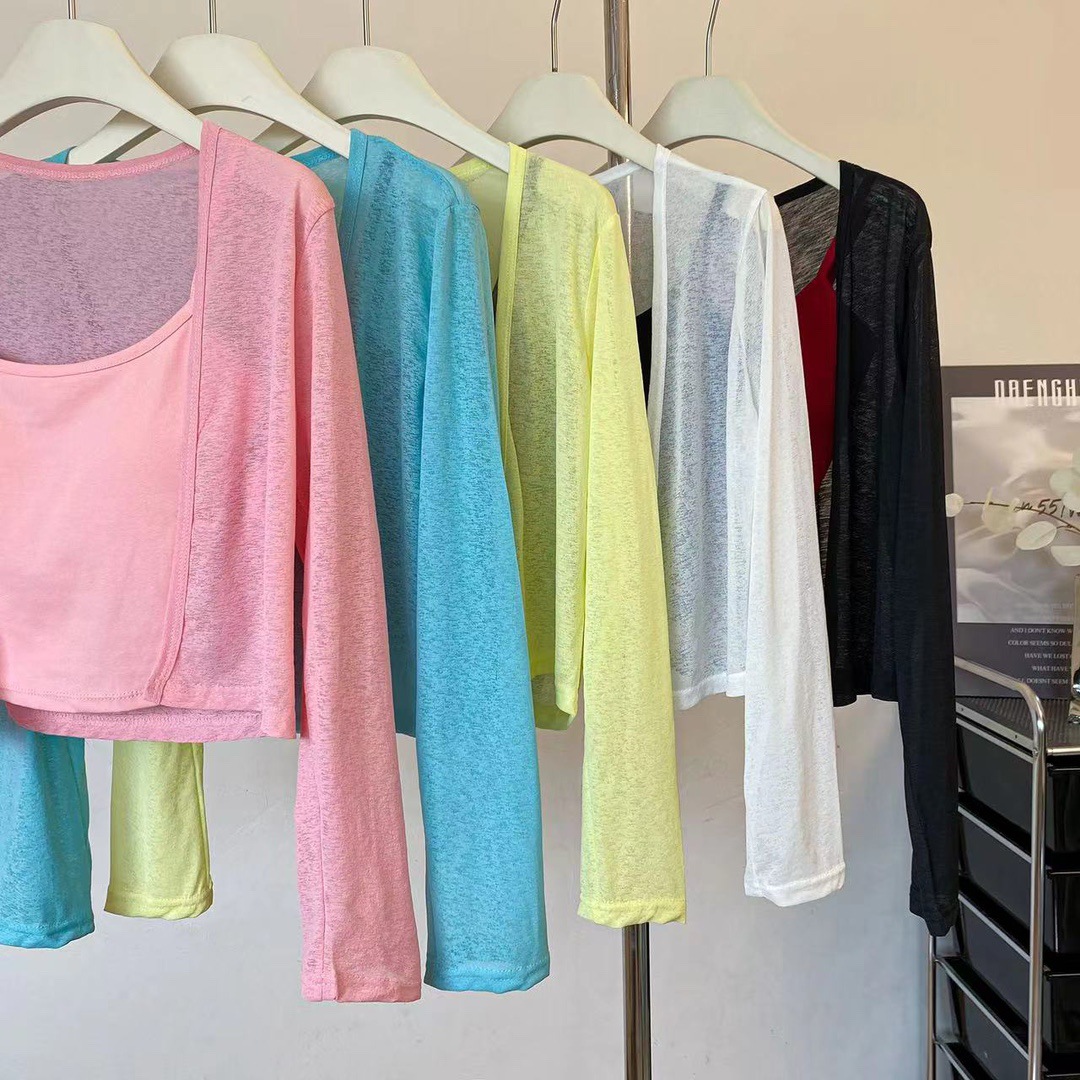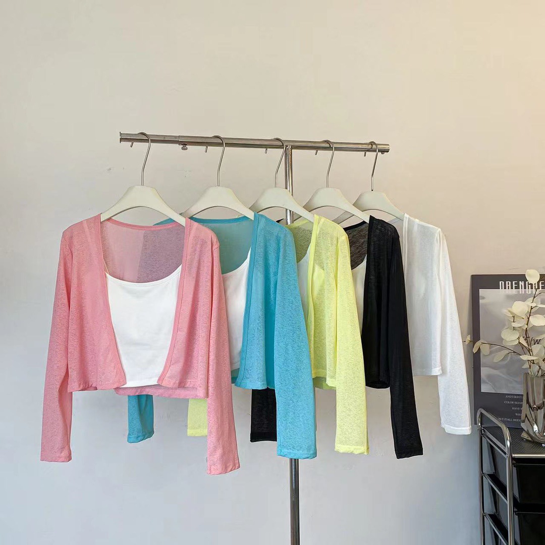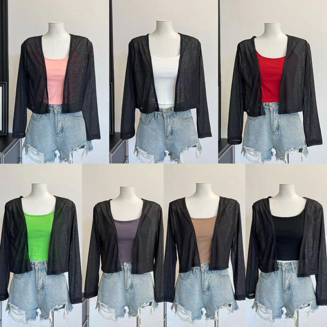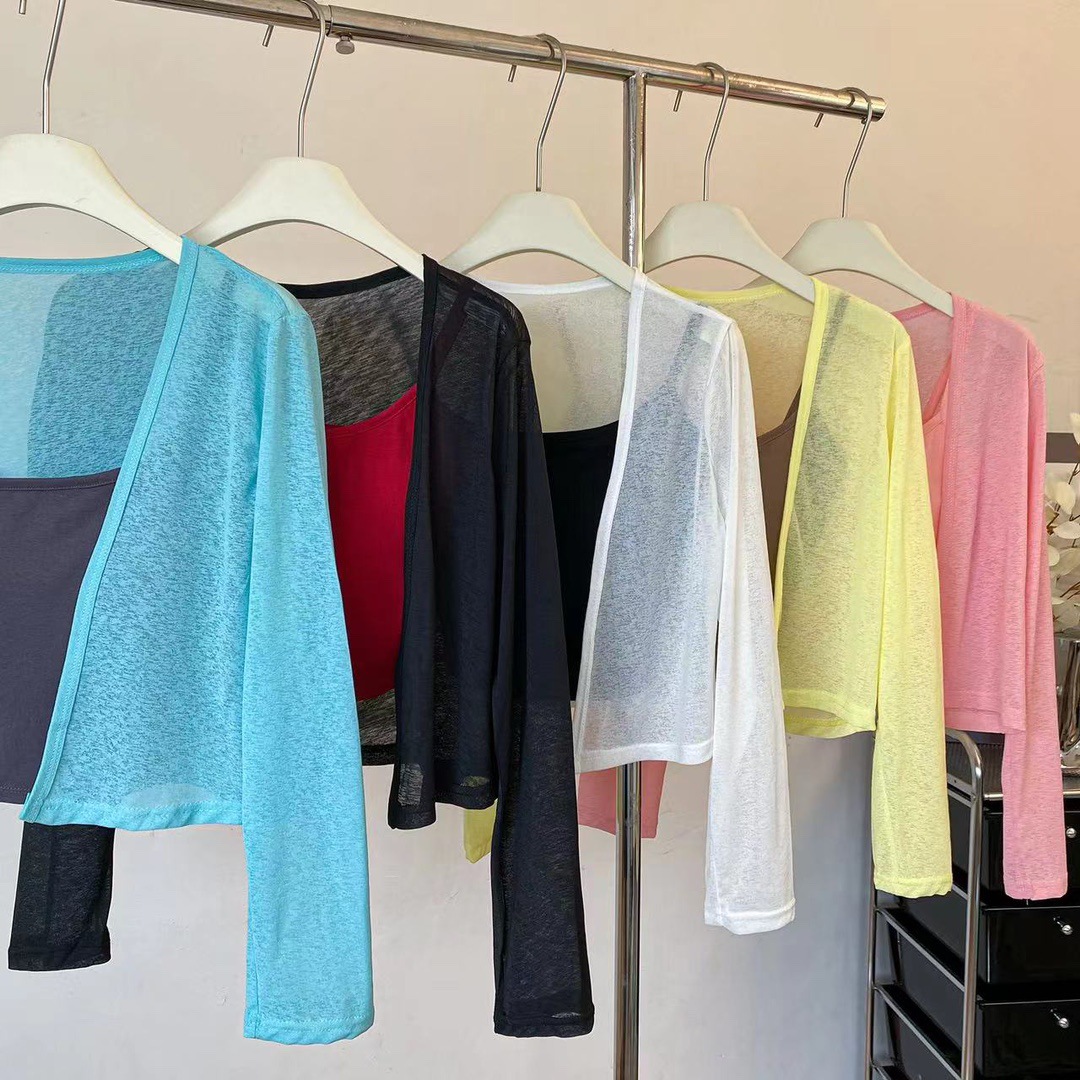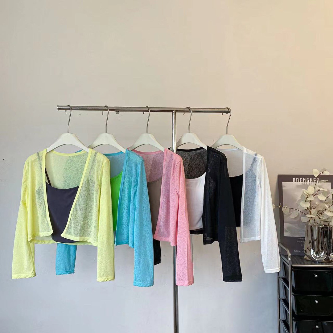 版型: 宽松型 衣长: 短款(40cm《衣长≤50cm) 上市年份/季节: 2024年夏季 颜色: 白色(单开衫),黑色(单开衫),黄色(单 尺码: 均码 货号: 7166 面料名称: 氨纶 风格: 清新风 流行元素: 透视 风格类型: 清新甜美 重量: 0.1 kg/件