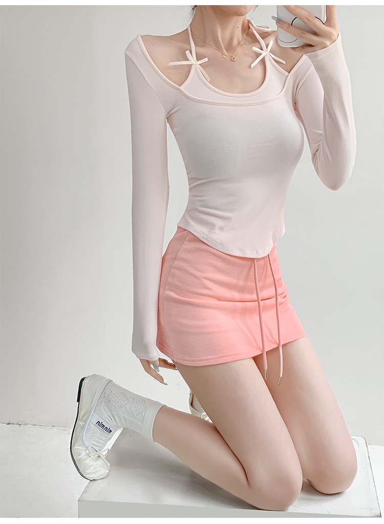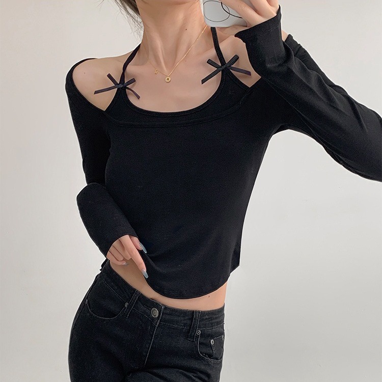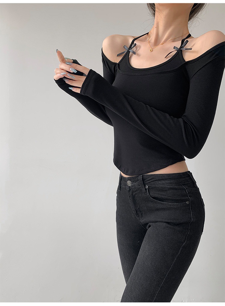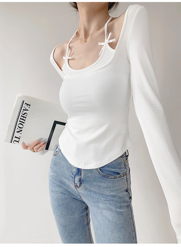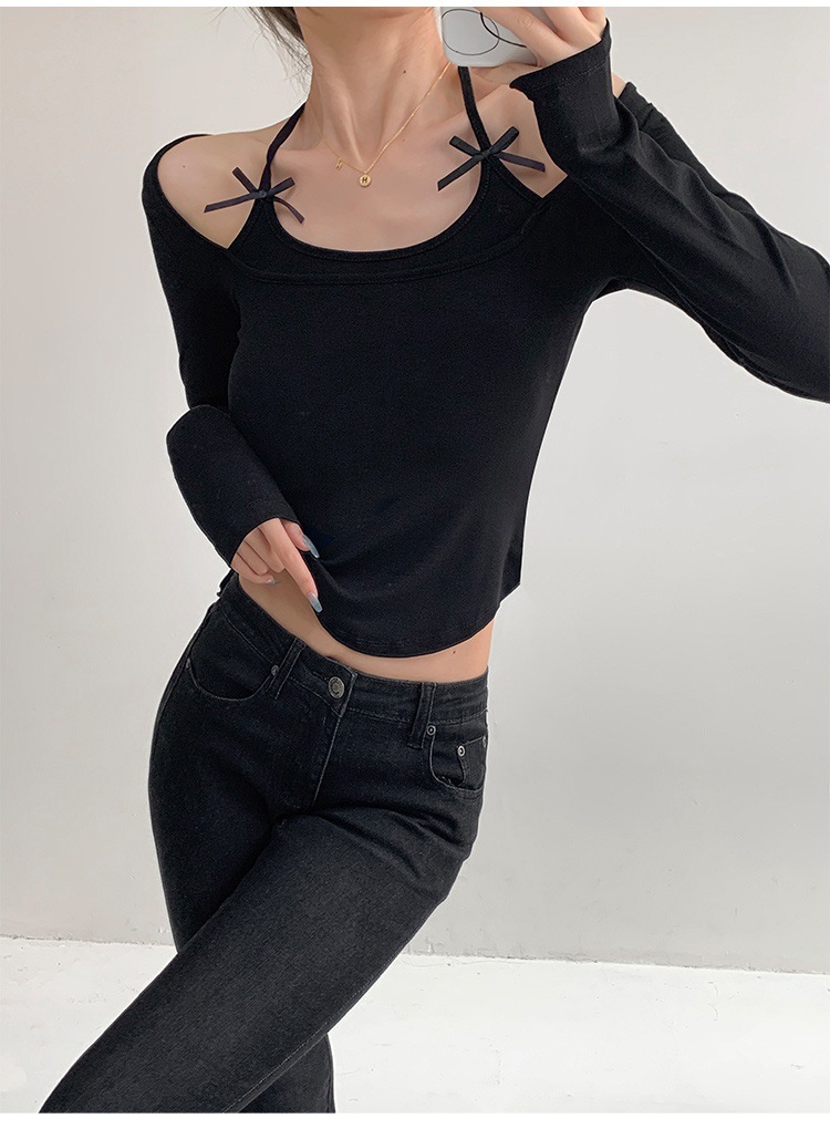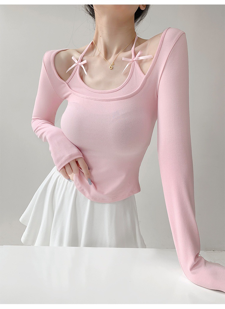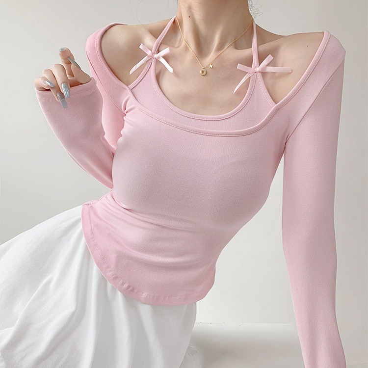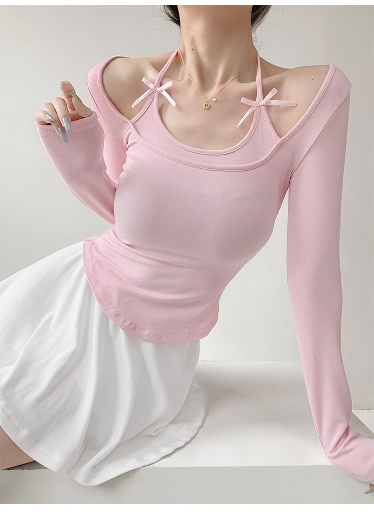 纯欲挂脖假两件磨毛长袖T恤女秋季内搭辣妹蝴蝶结系带打底短上衣 English | 投诉