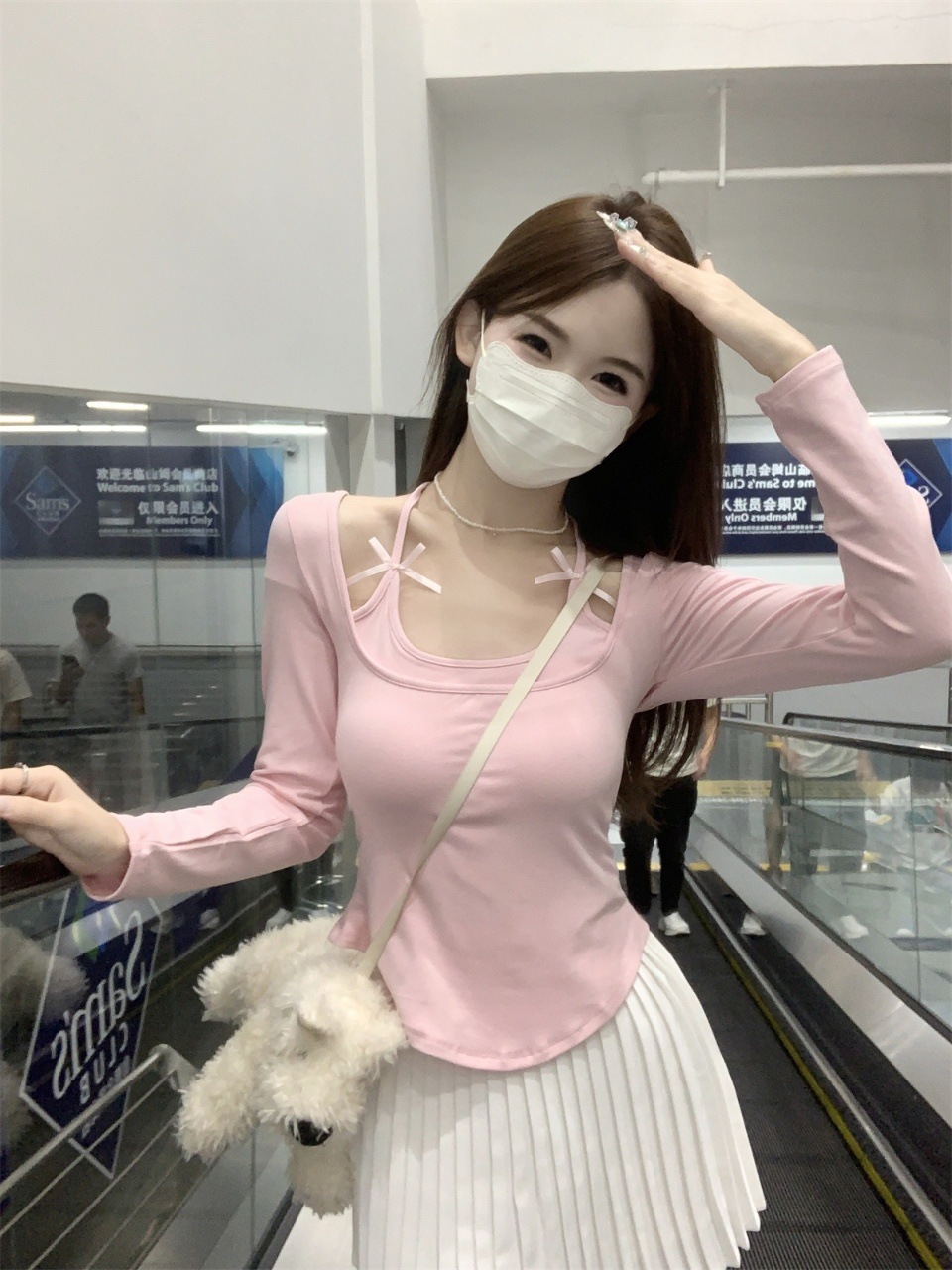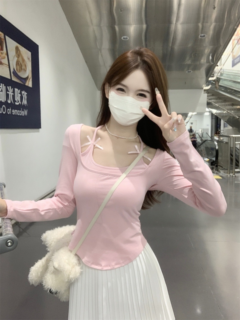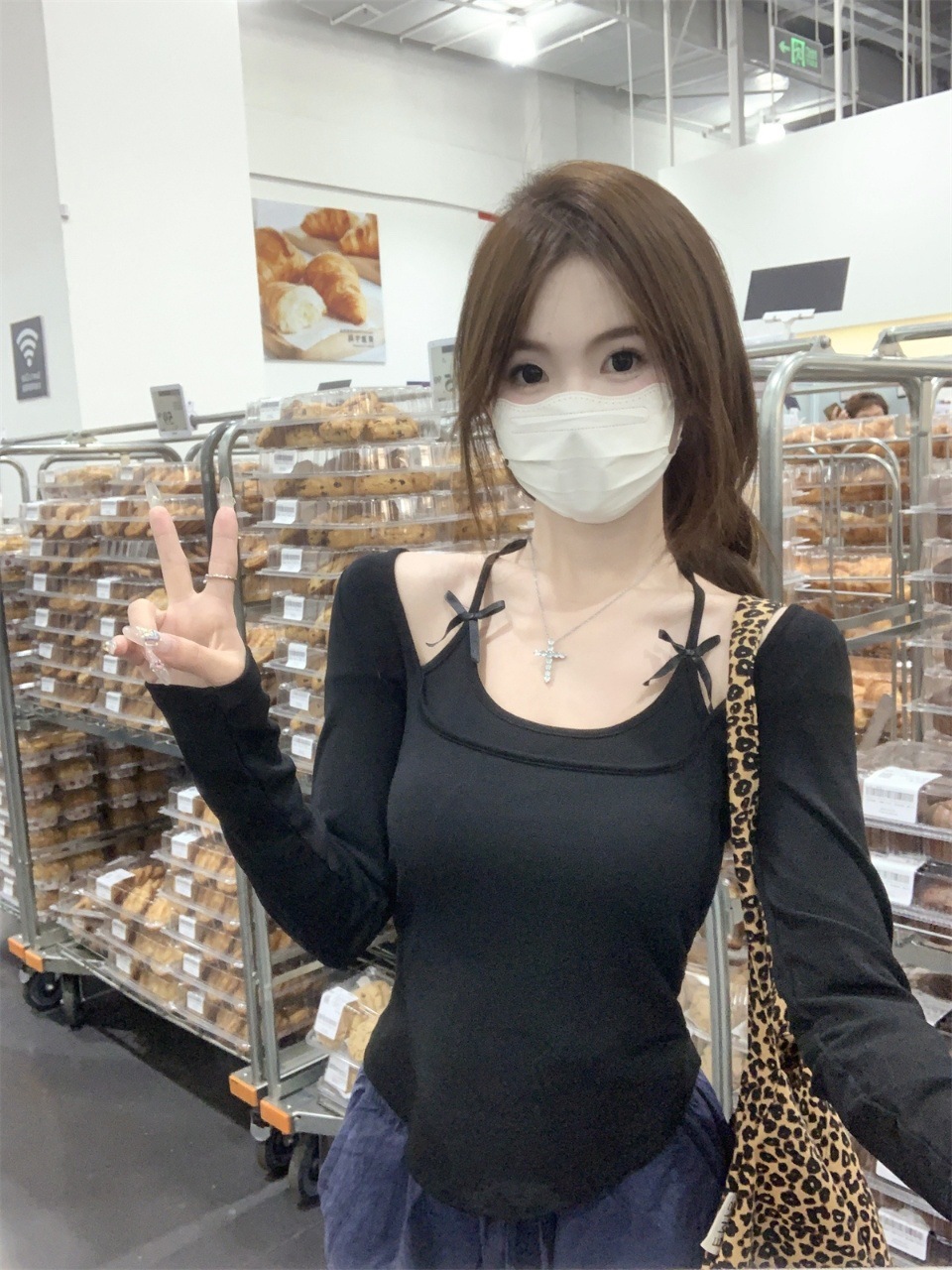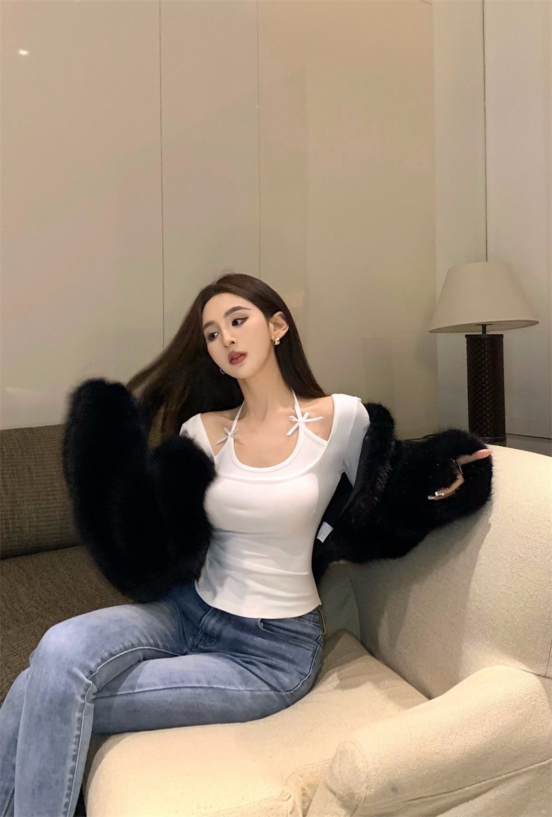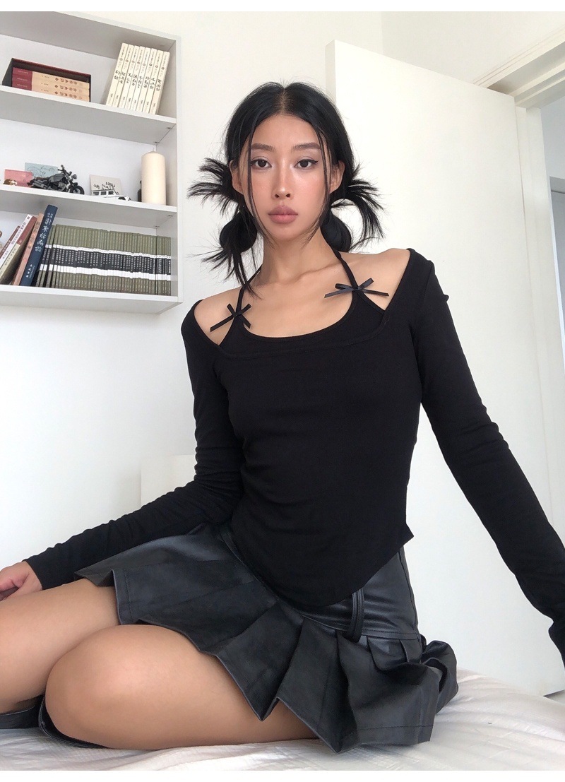 纯欲挂脖假两件磨毛长袖T恤女秋季内搭辣妹蝴蝶结系带打底短上衣 English | 投诉