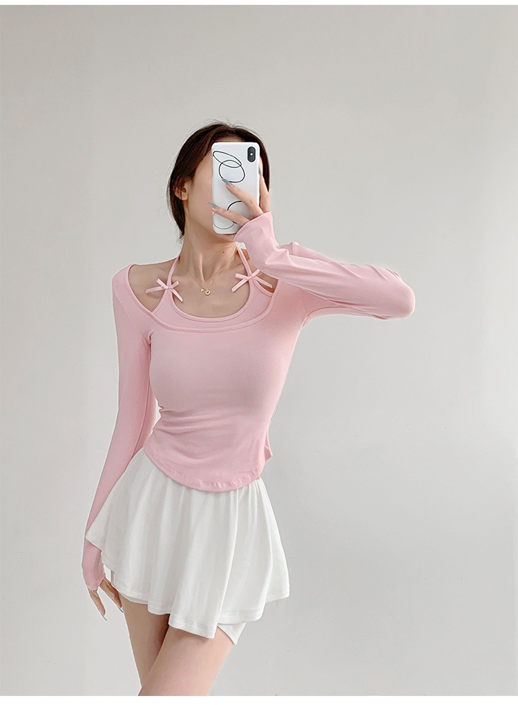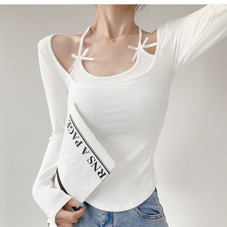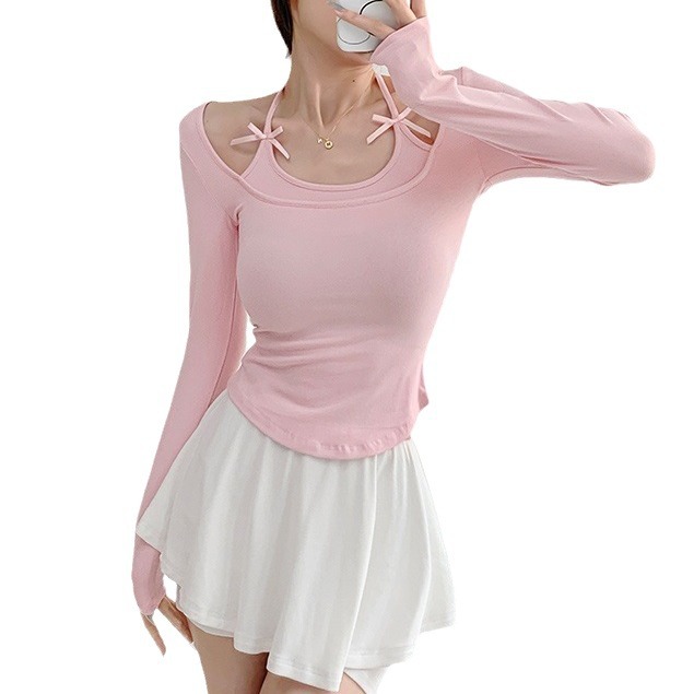 纯欲挂脖假两件磨毛长袖T恤女秋季内搭辣妹蝴蝶结系带打底短上衣