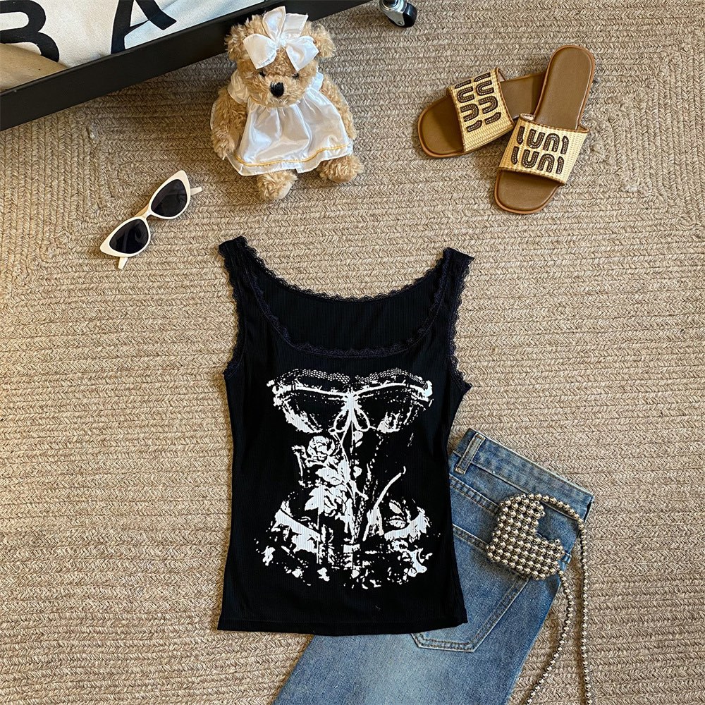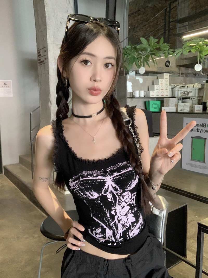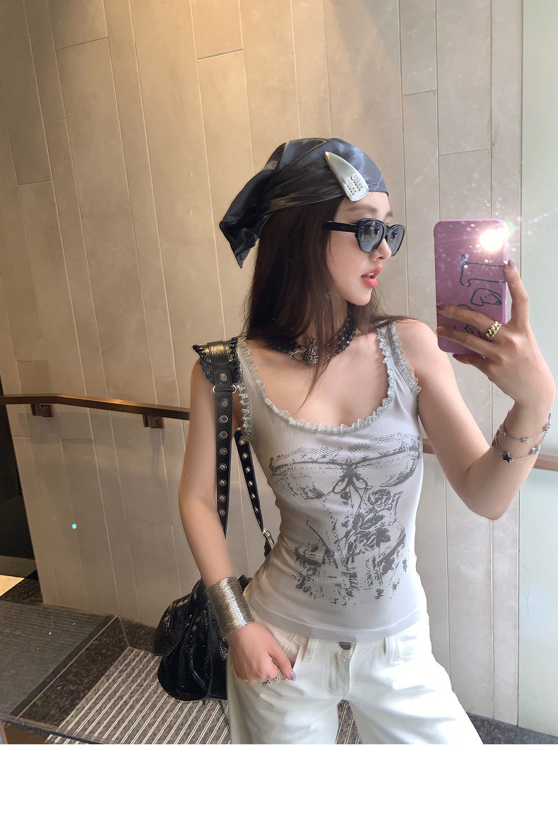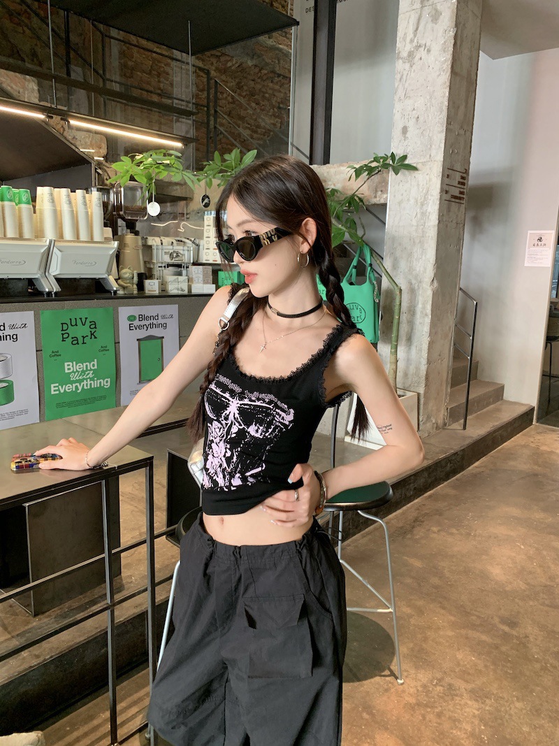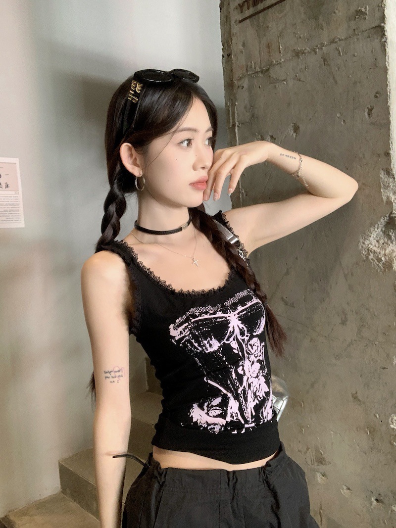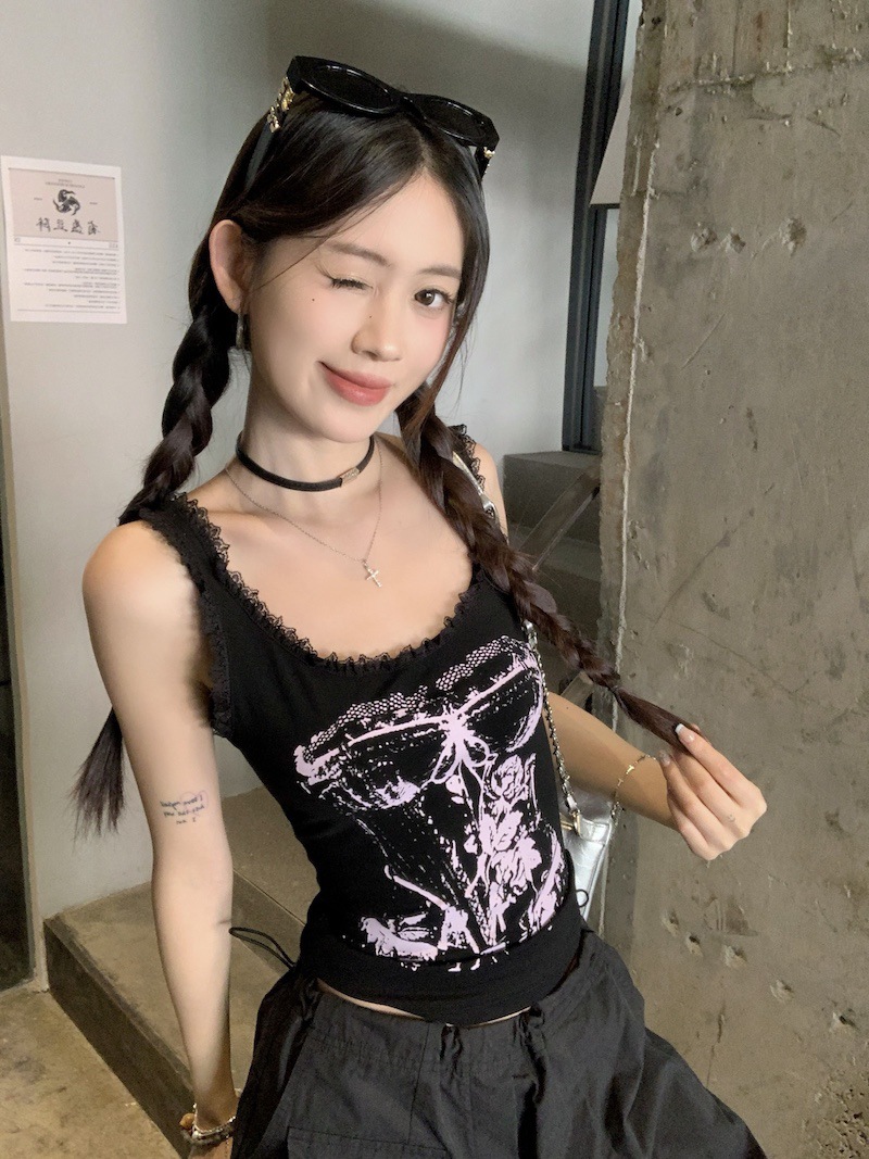 美式甜辣妹吊带背心蕾丝花边个性印花带胸垫内搭紧身外穿无袖上衣 English | 投诉