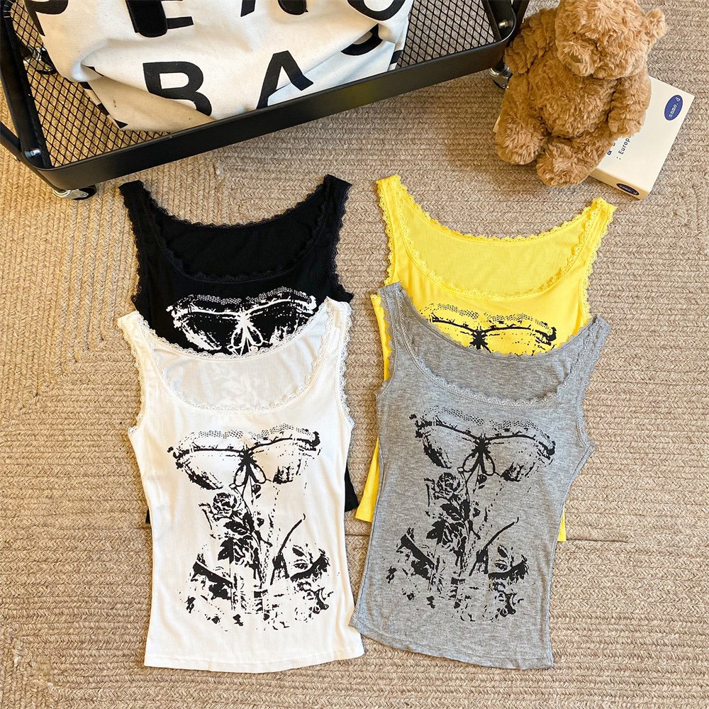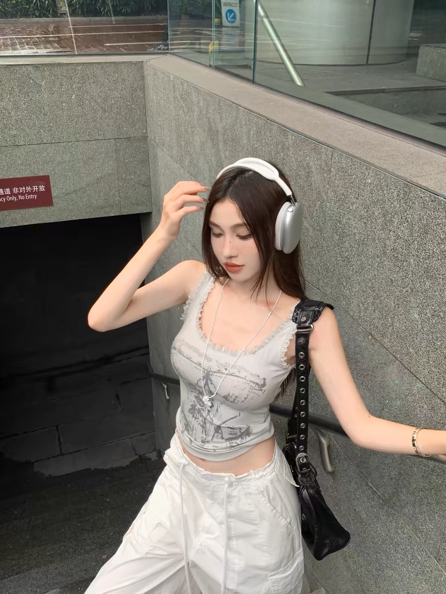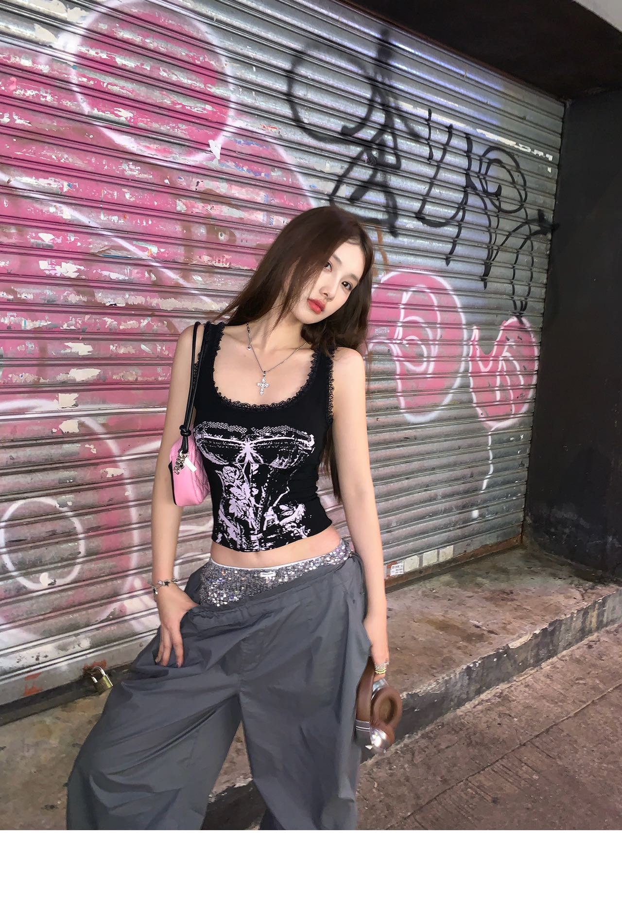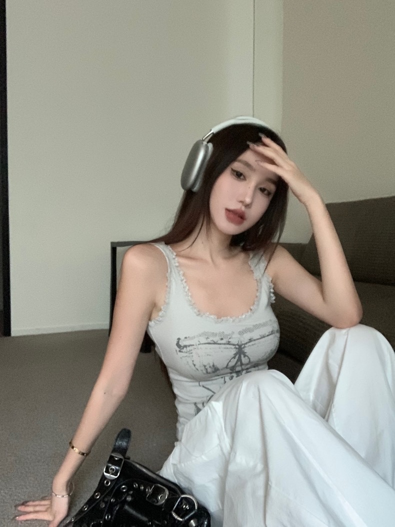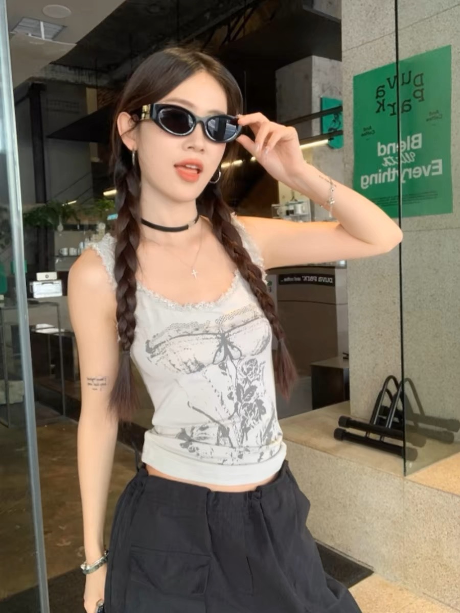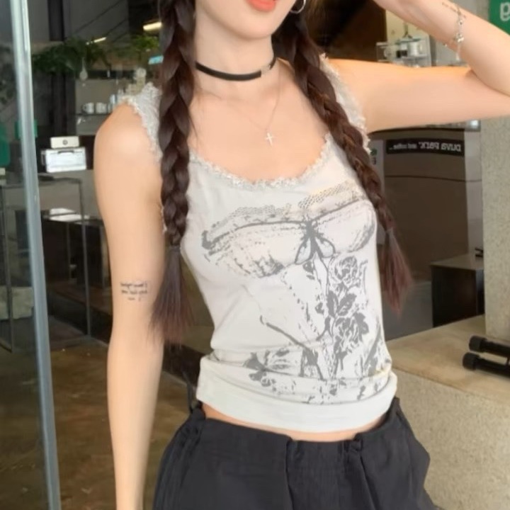 美式甜辣妹吊带背心蕾丝花边个性印花带胸垫内搭紧身外穿无袖上衣 English | 投诉