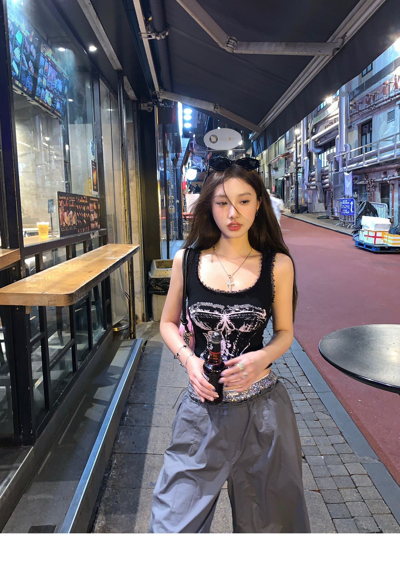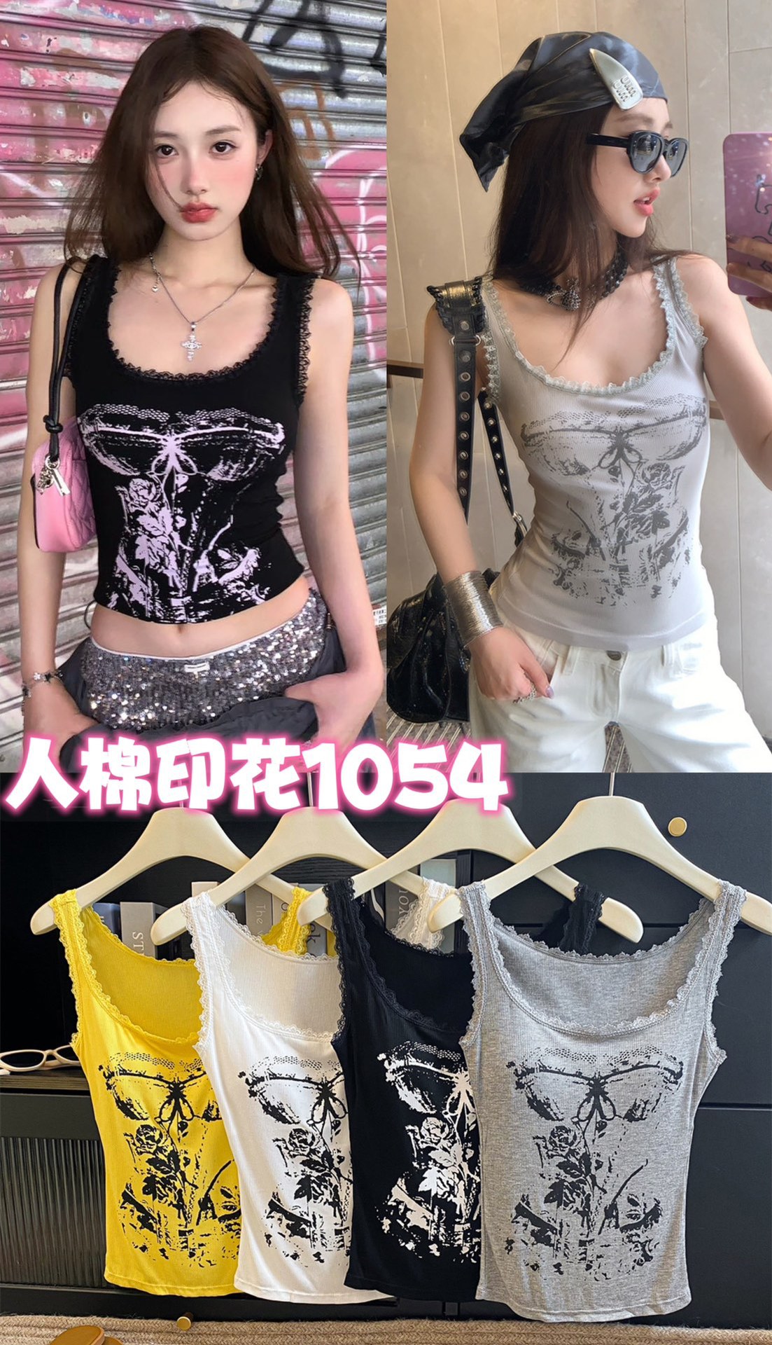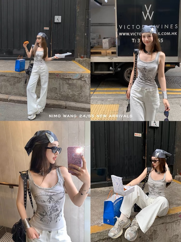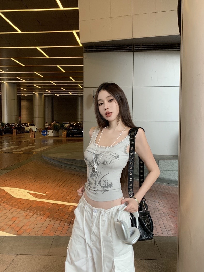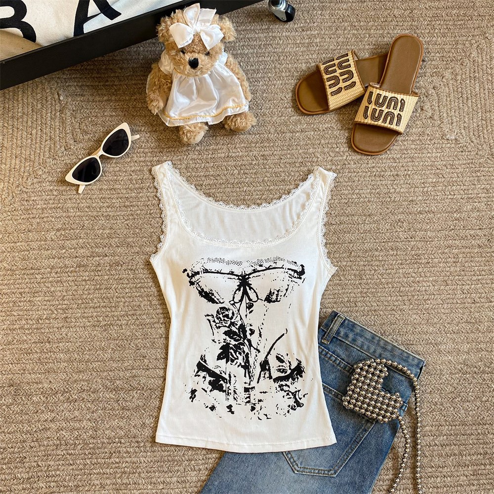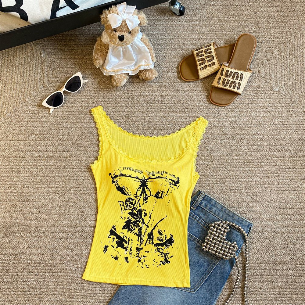 美式甜辣妹吊带背心蕾丝花边个性印花带胸垫内搭紧身外穿无袖上衣 English | 投诉