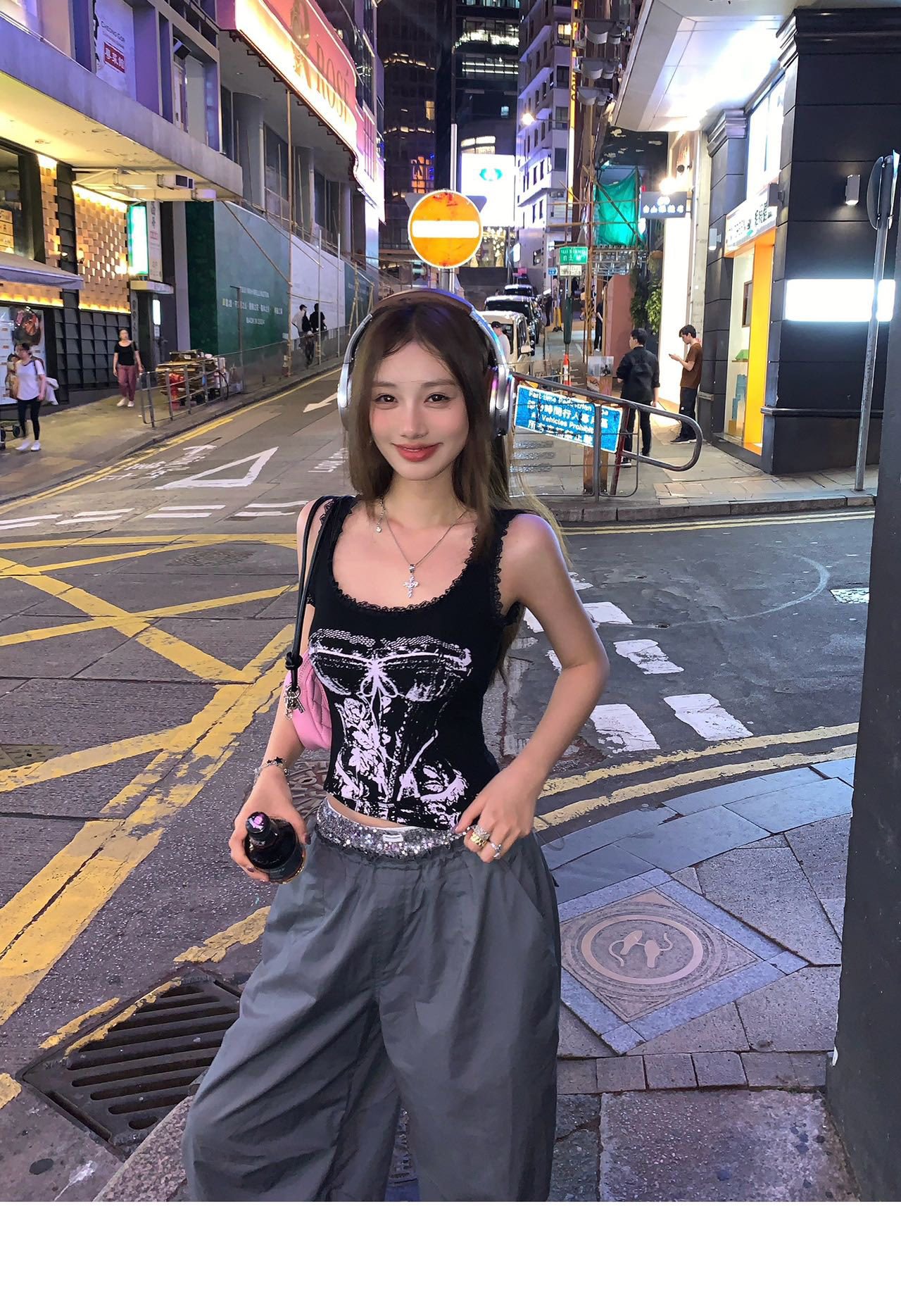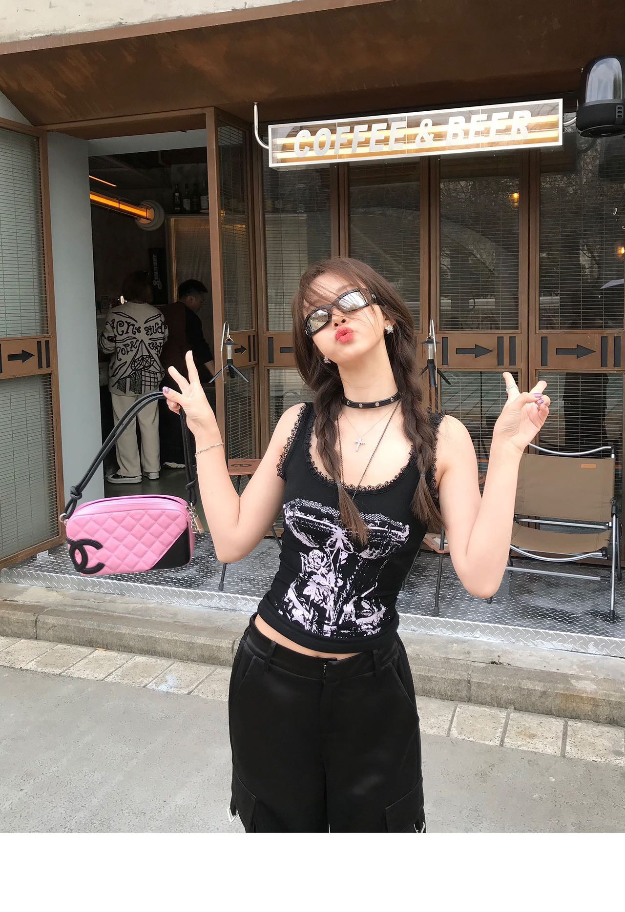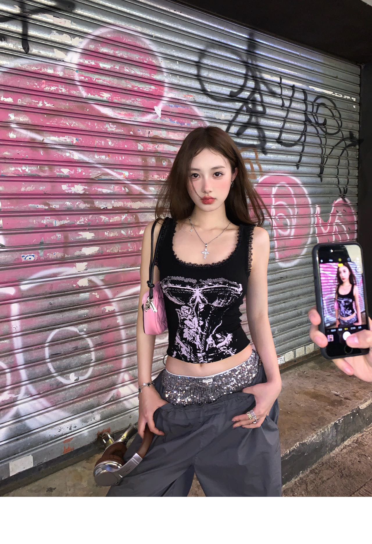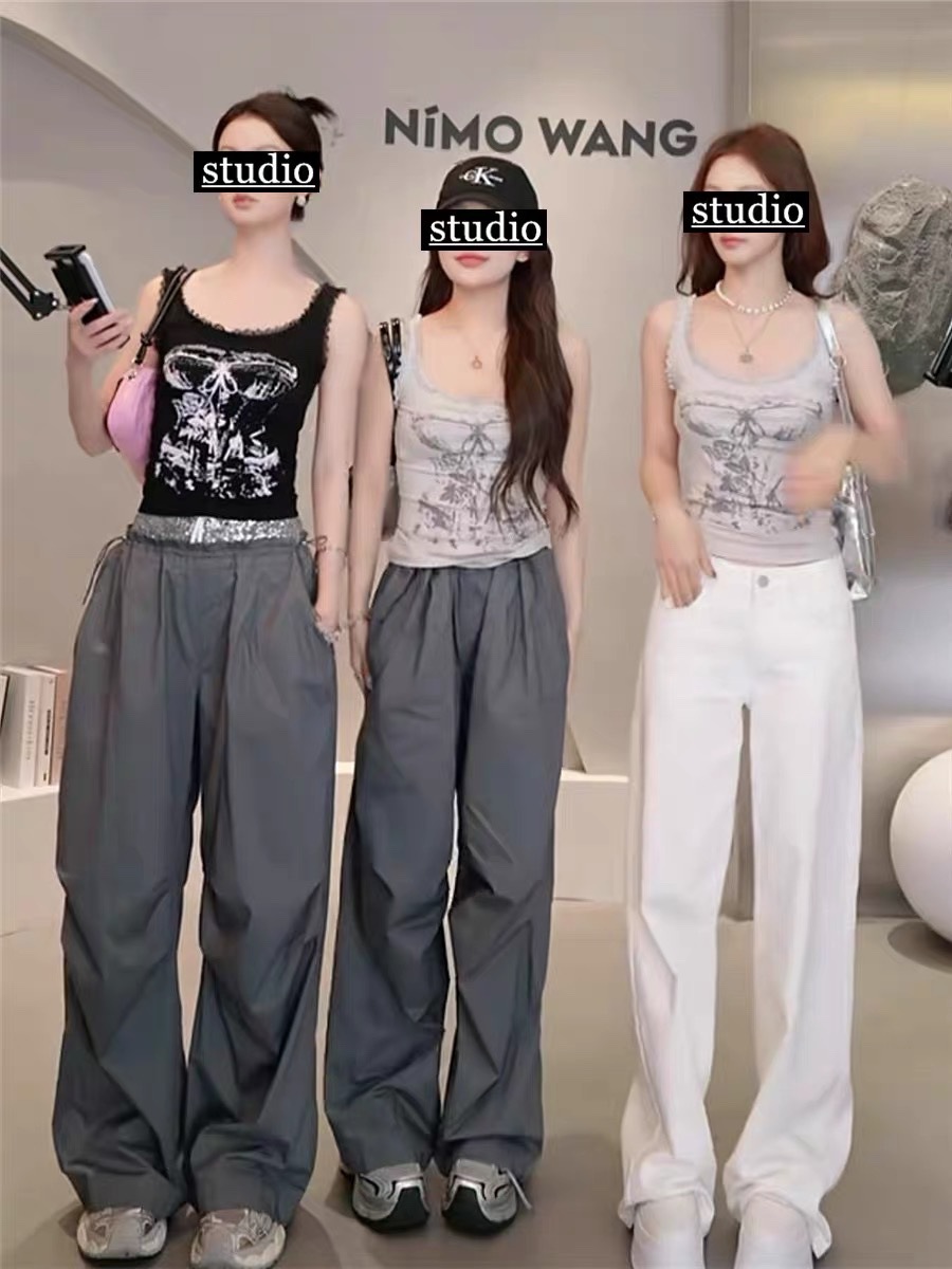 美式甜辣妹吊带背心蕾丝花边个性印花带胸垫内搭紧身外穿无袖上衣 English | 投诉