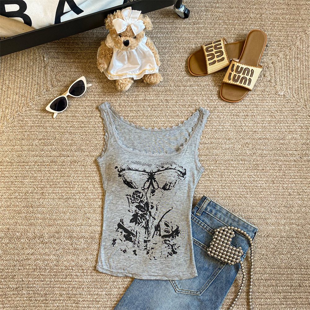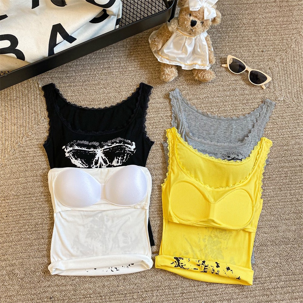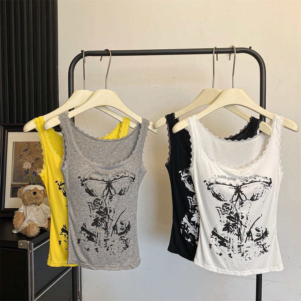 美式甜辣妹吊带背心蕾丝花边个性印花带胸垫内搭紧身外穿无袖上衣