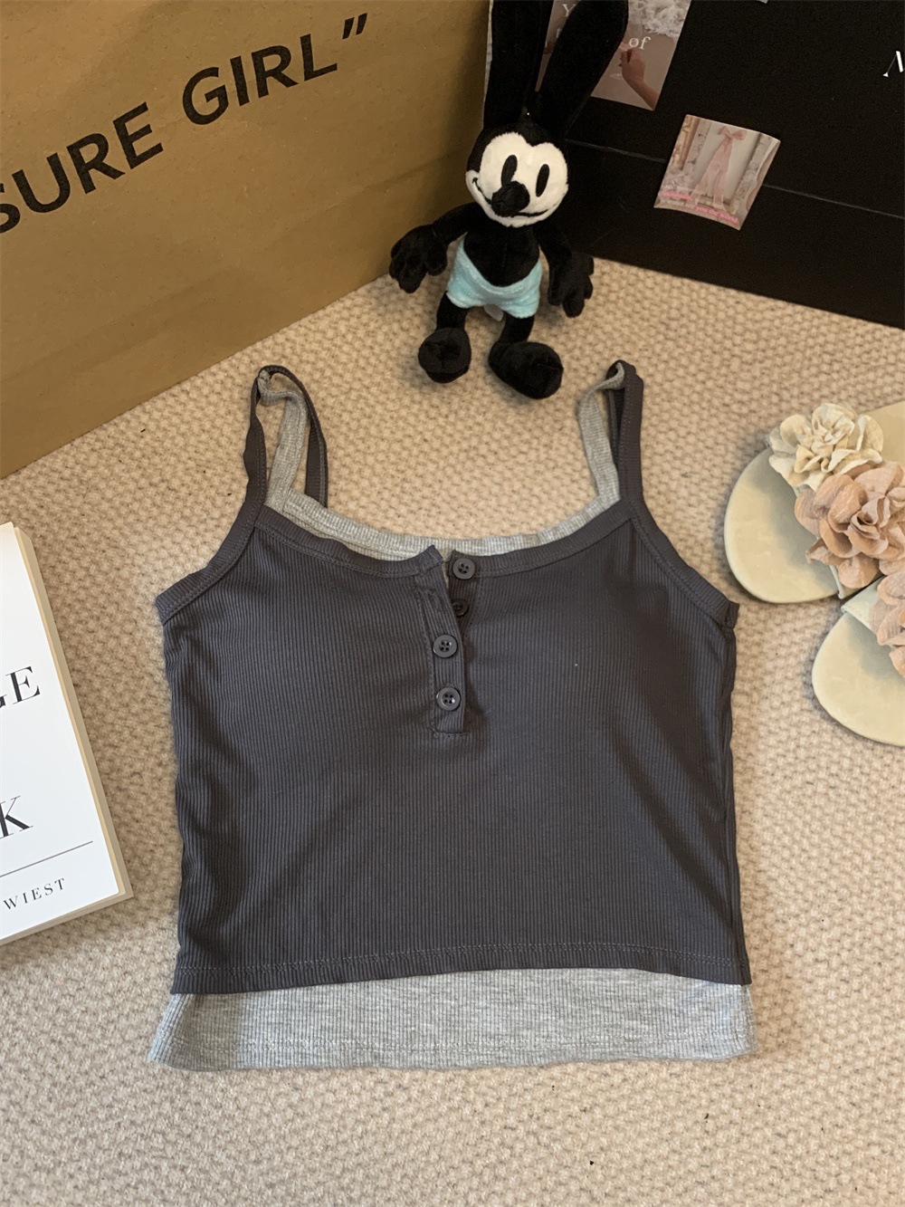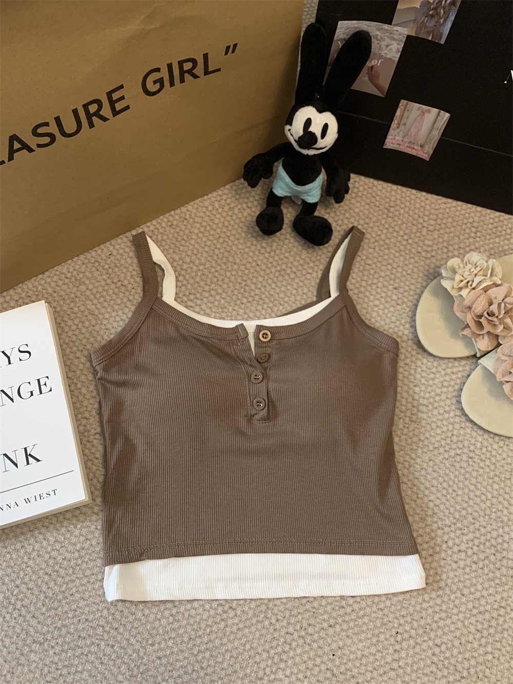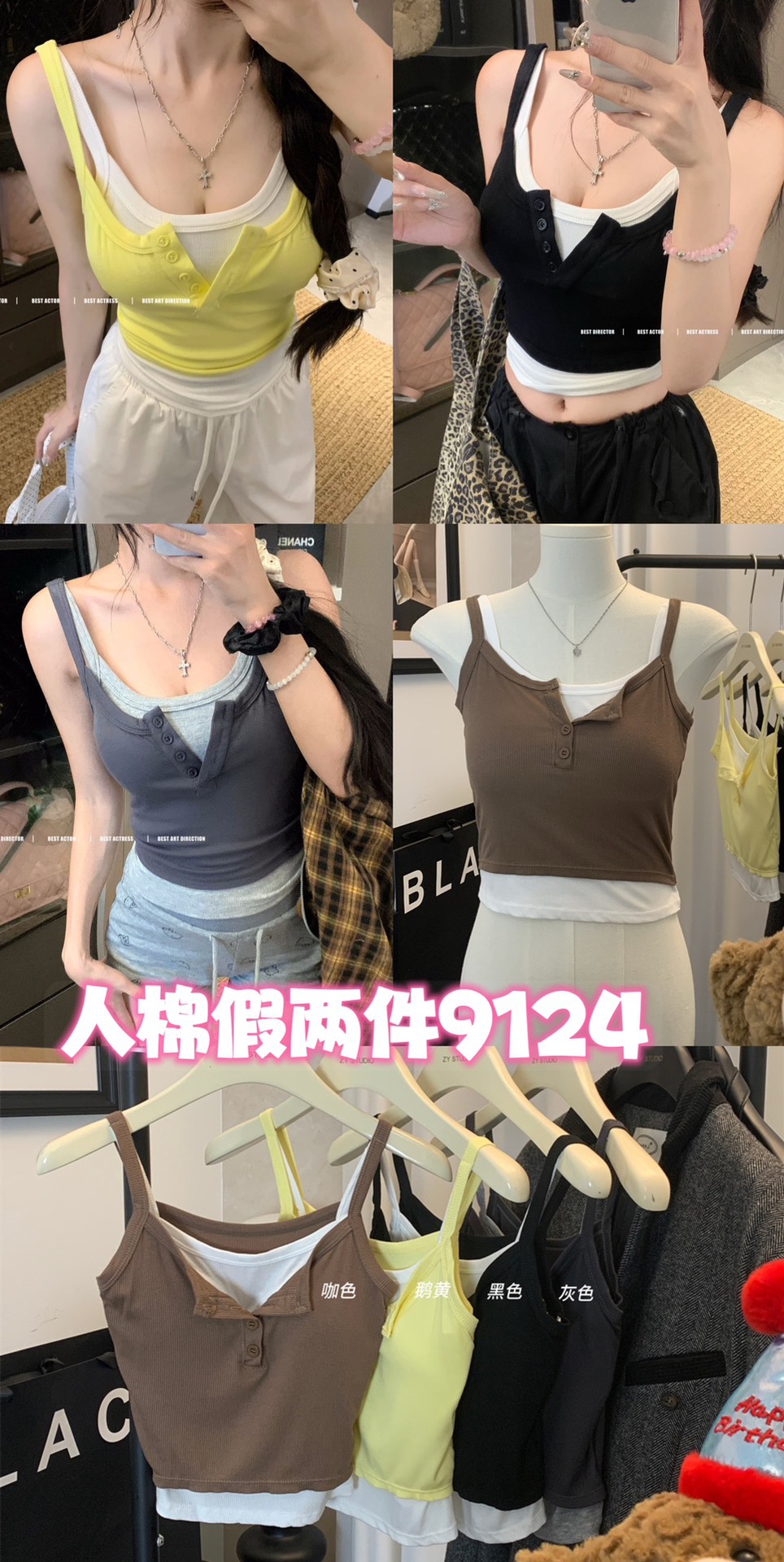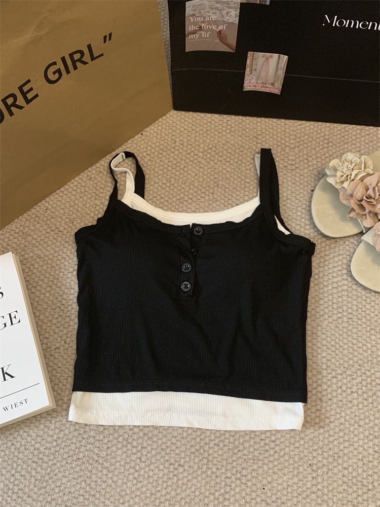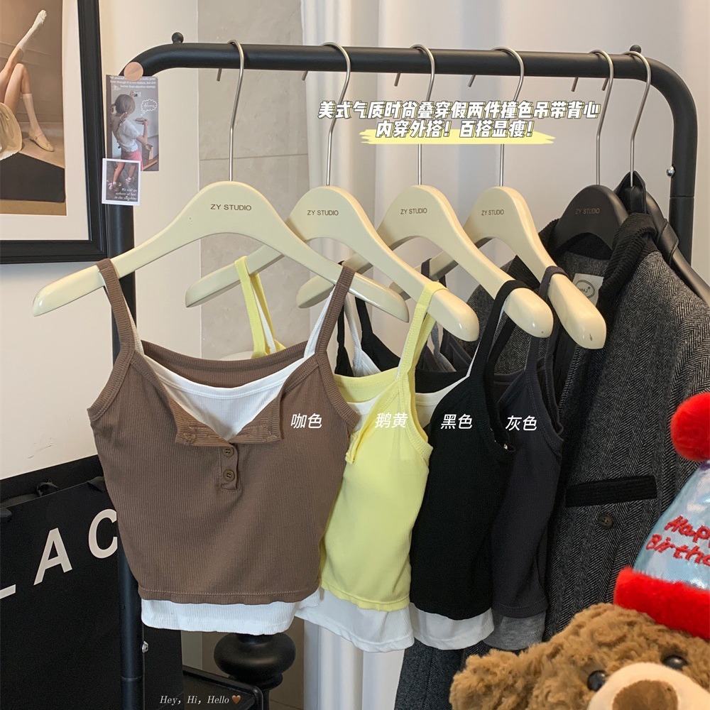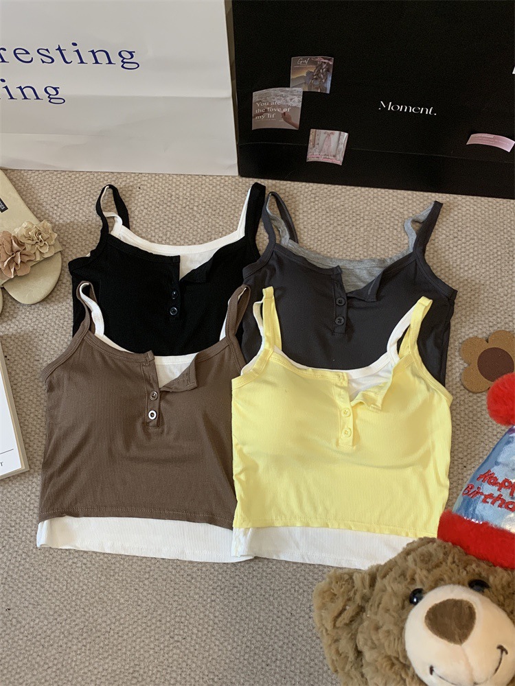 假两件撞色吊带背心美式辣妹纽扣设计带胸垫修身短款露脐外穿上衣