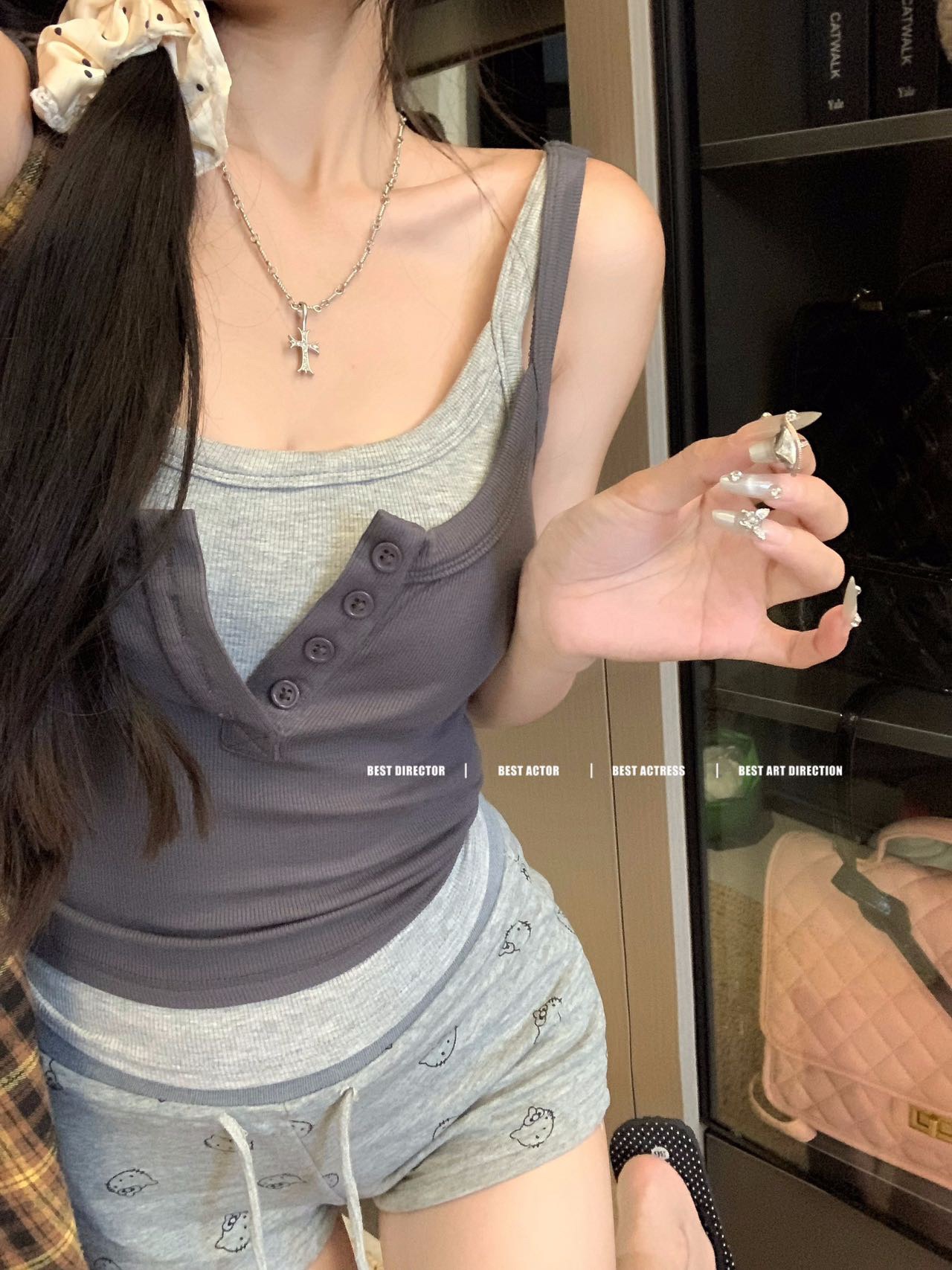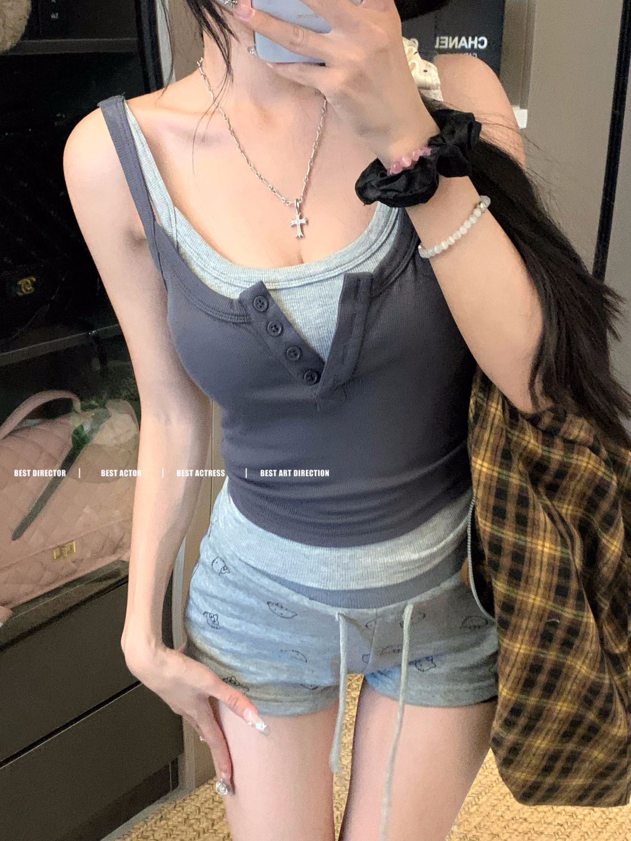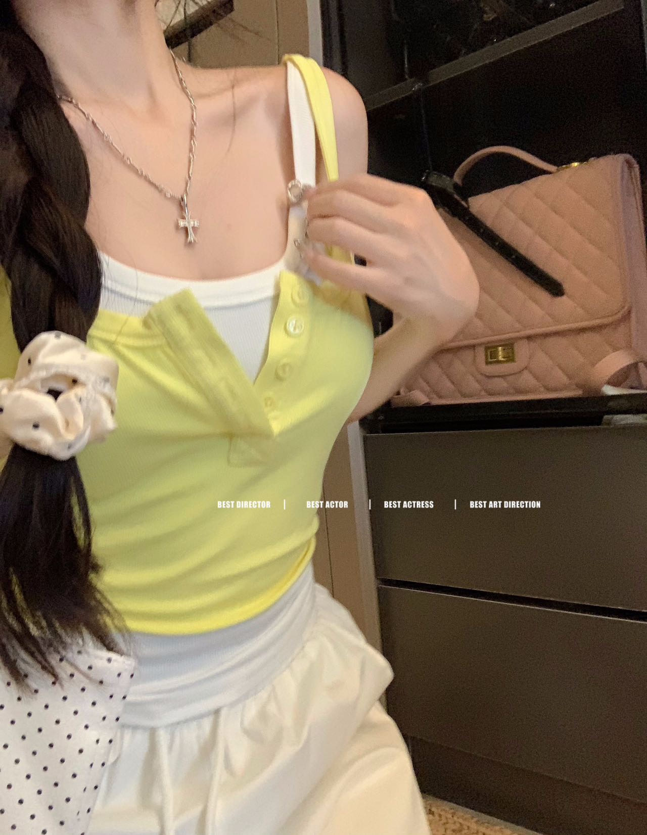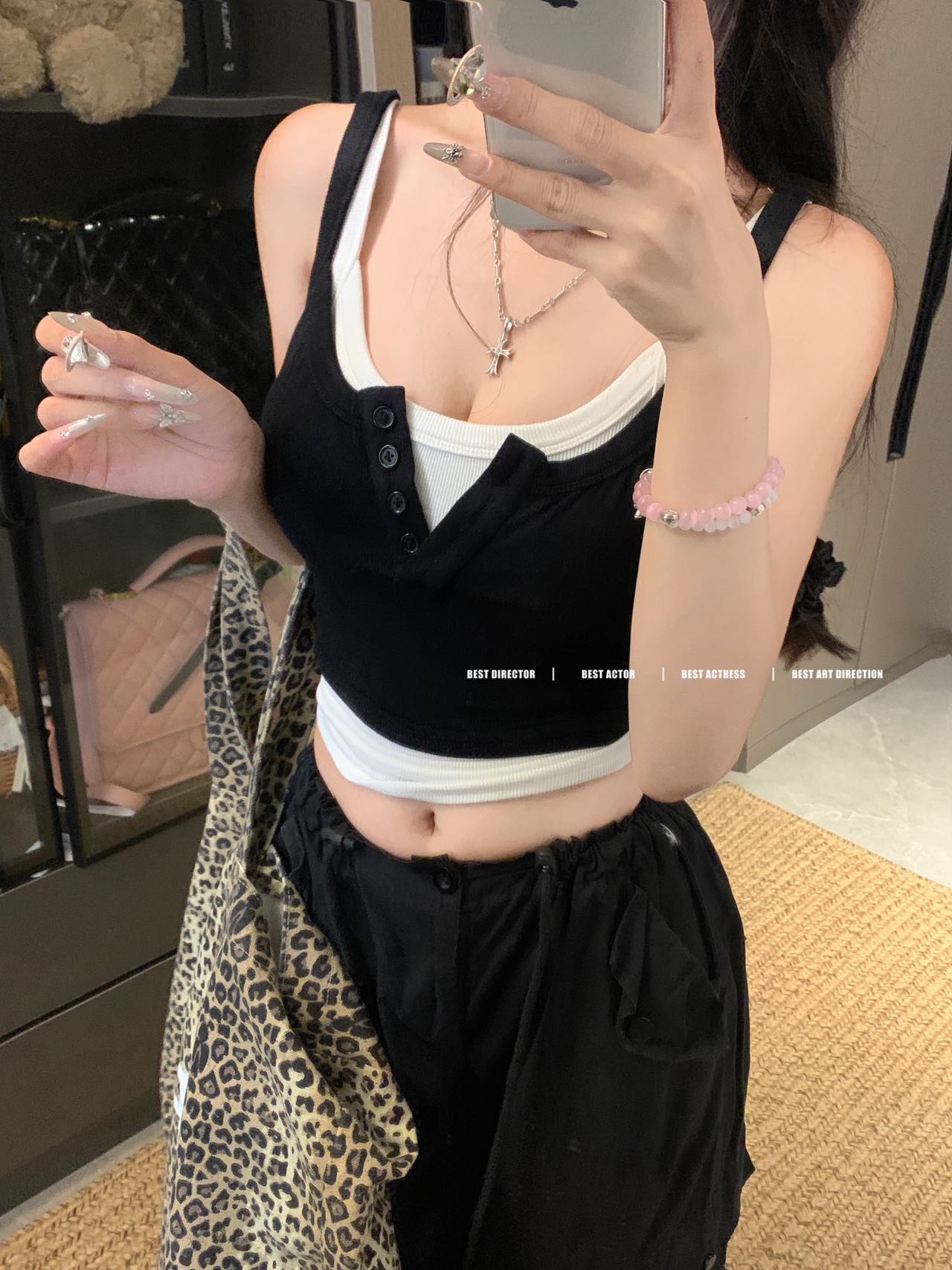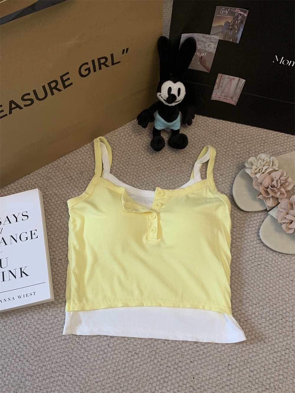 假两件撞色吊带背心美式辣妹纽扣设计带胸垫修身短款露脐外穿上衣