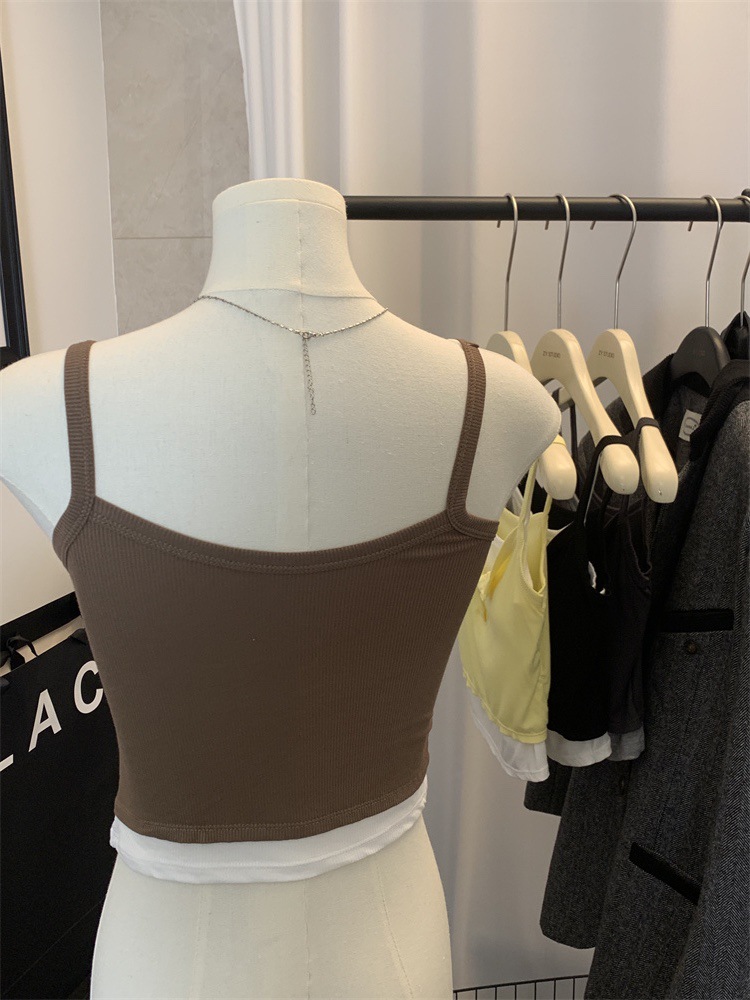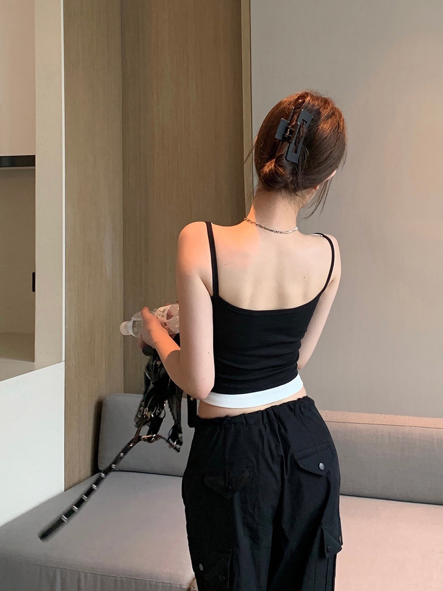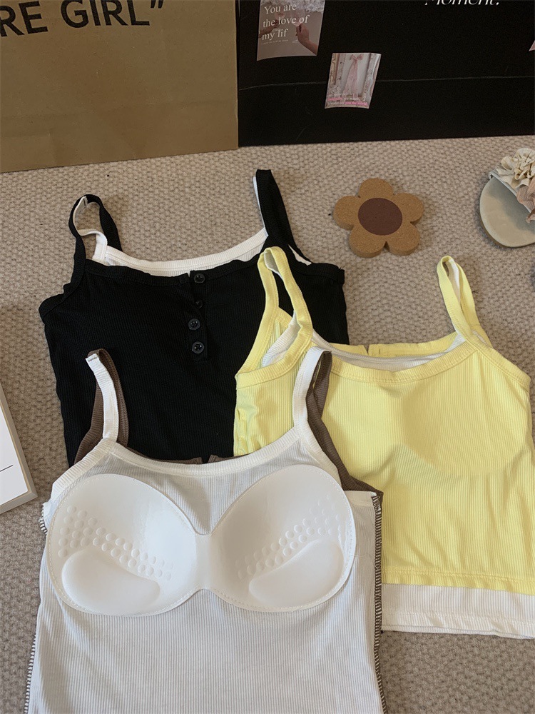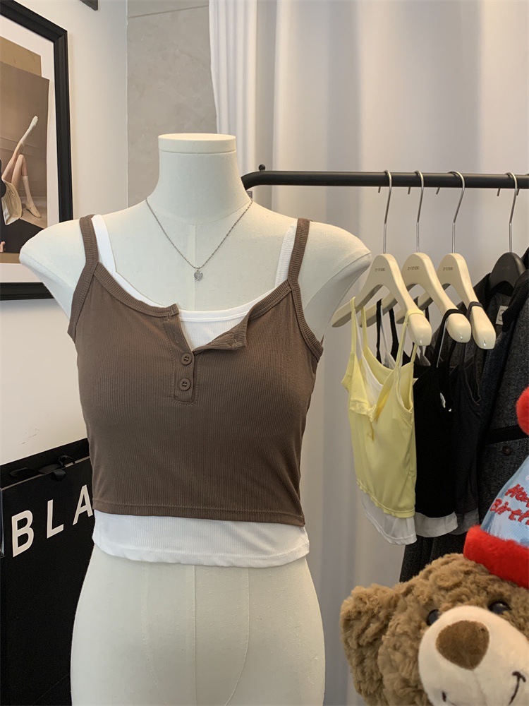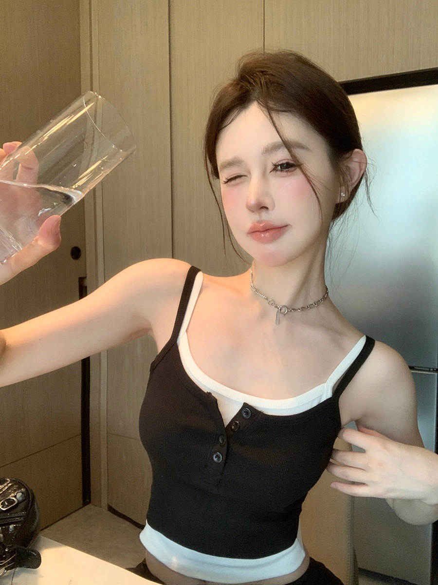 假两件撞色吊带背心美式辣妹纽扣设计带胸垫修身短款露脐外穿上衣 English | 投诉