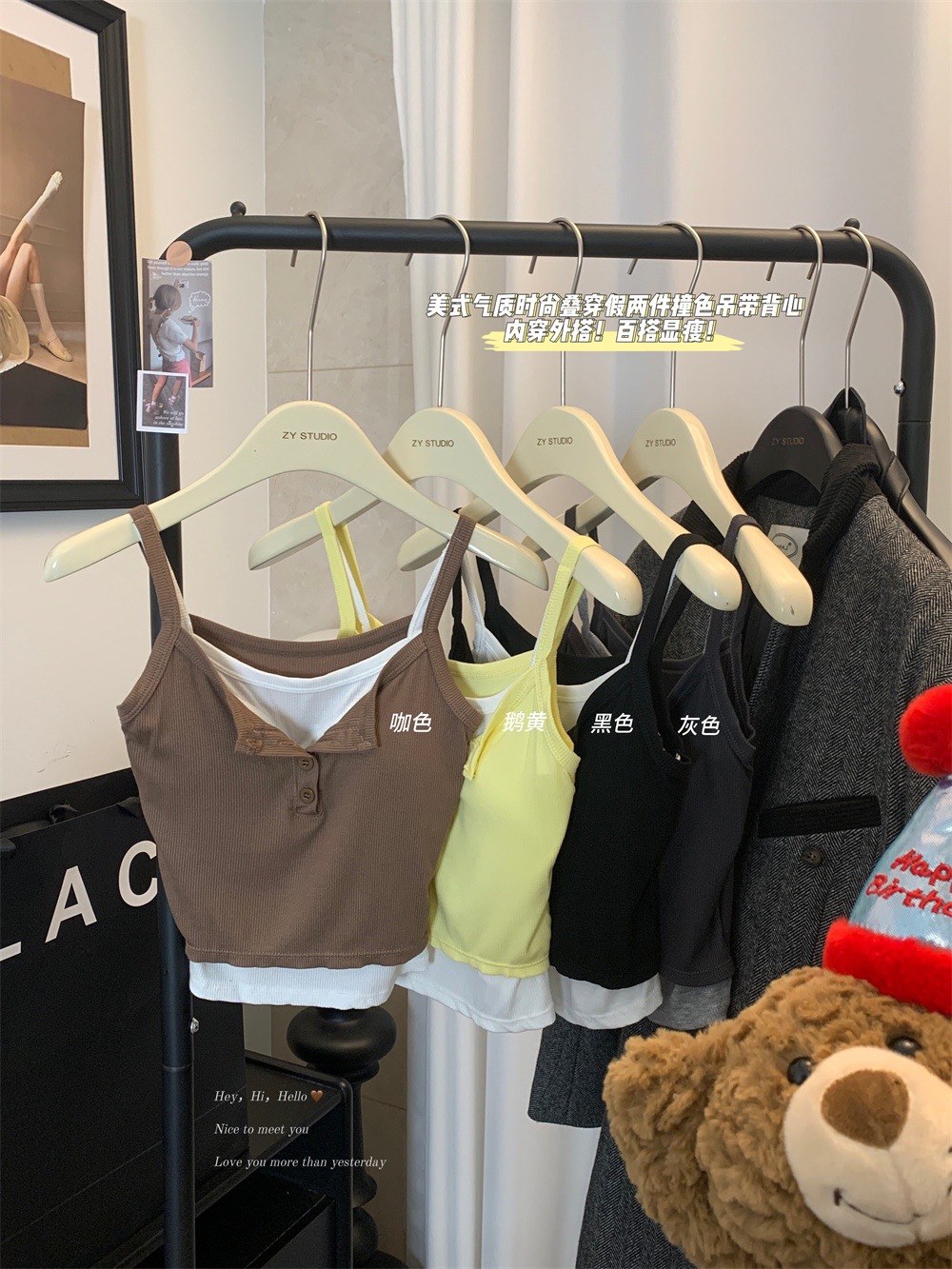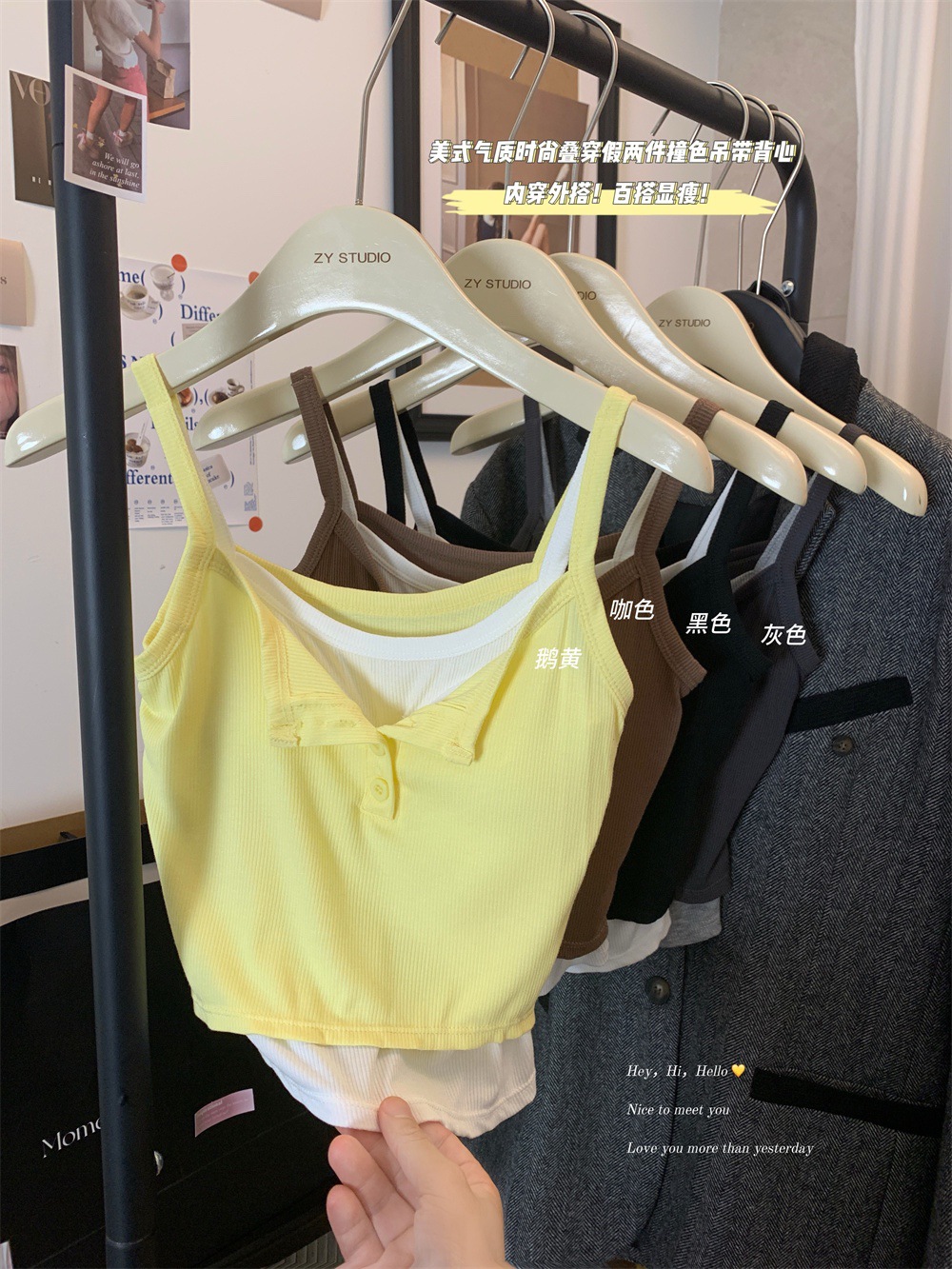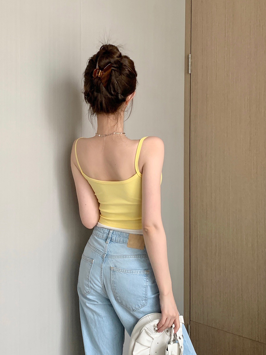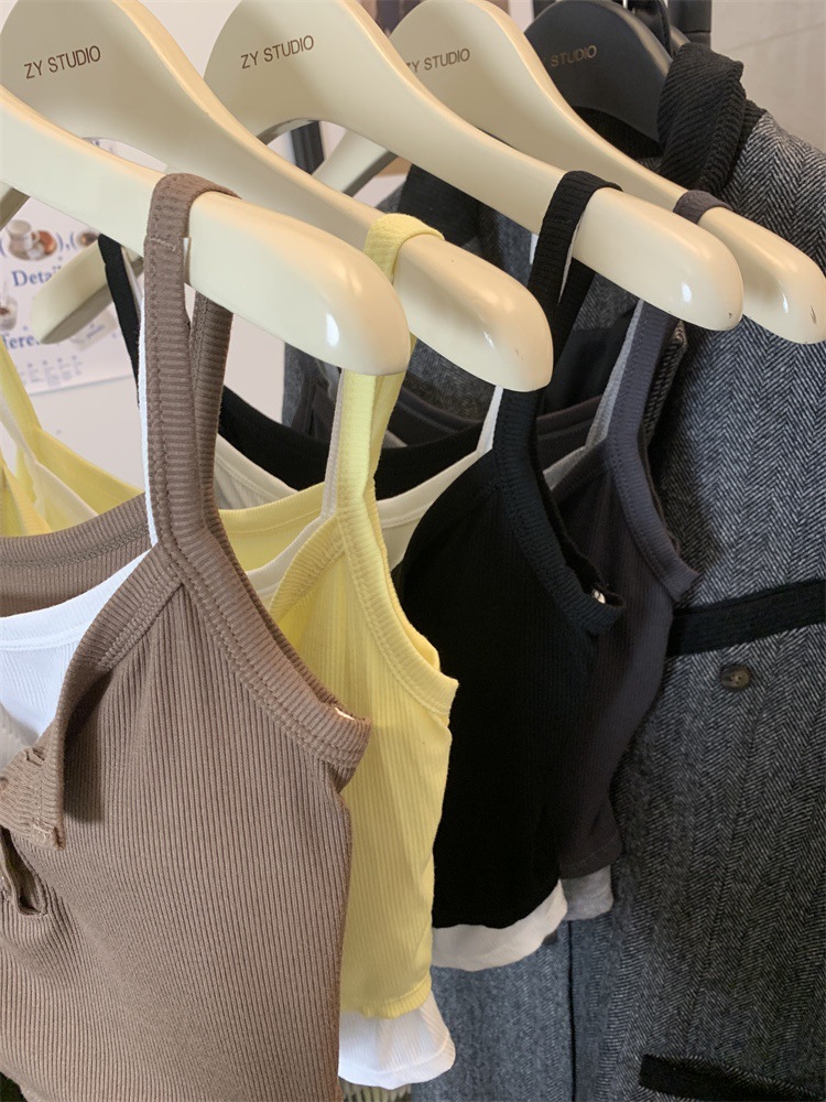 假两件撞色吊带背心美式辣妹纽扣设计带胸垫修身短款露脐外穿上衣 English | 投诉